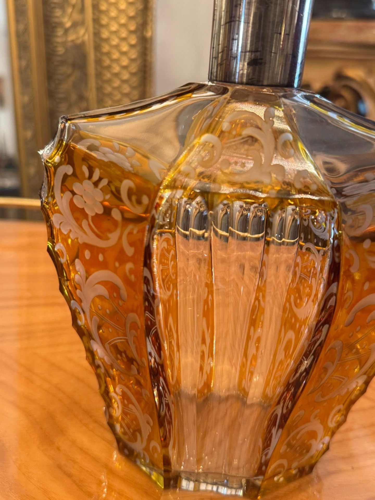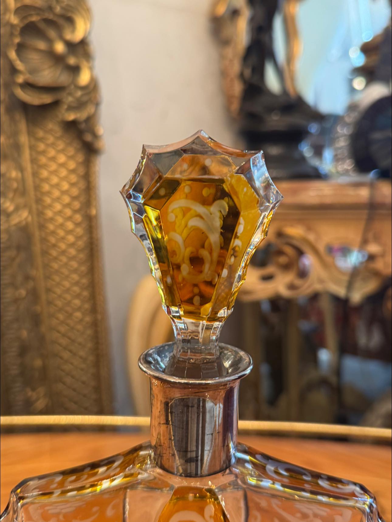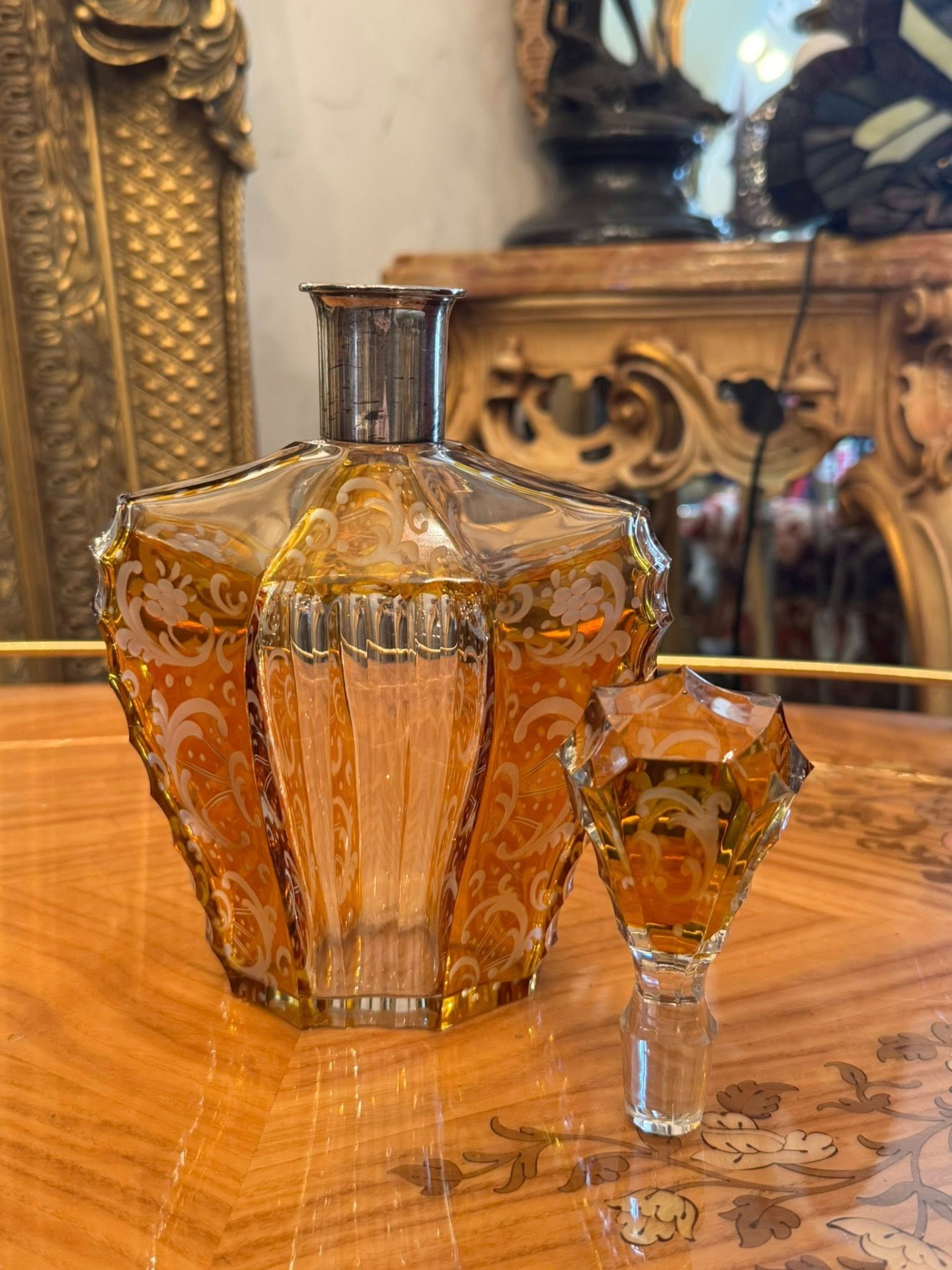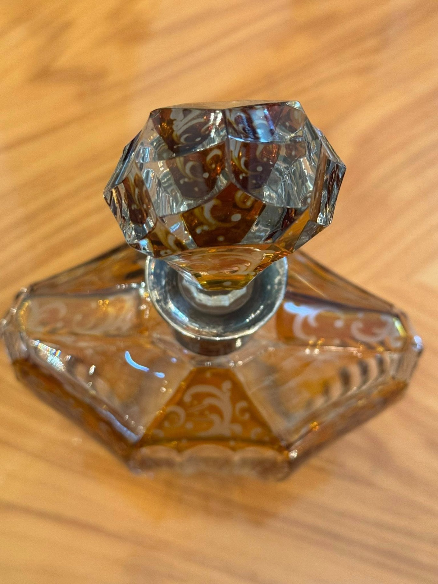 Sticlă impresionantă în stilului Art Deco din cristal stratificat de Boemia și gât din argint. Forma hexagonală/fațetată și dopul masiv, de asemenea fațetat, sunt tipice pentru perioada 1920-1940.