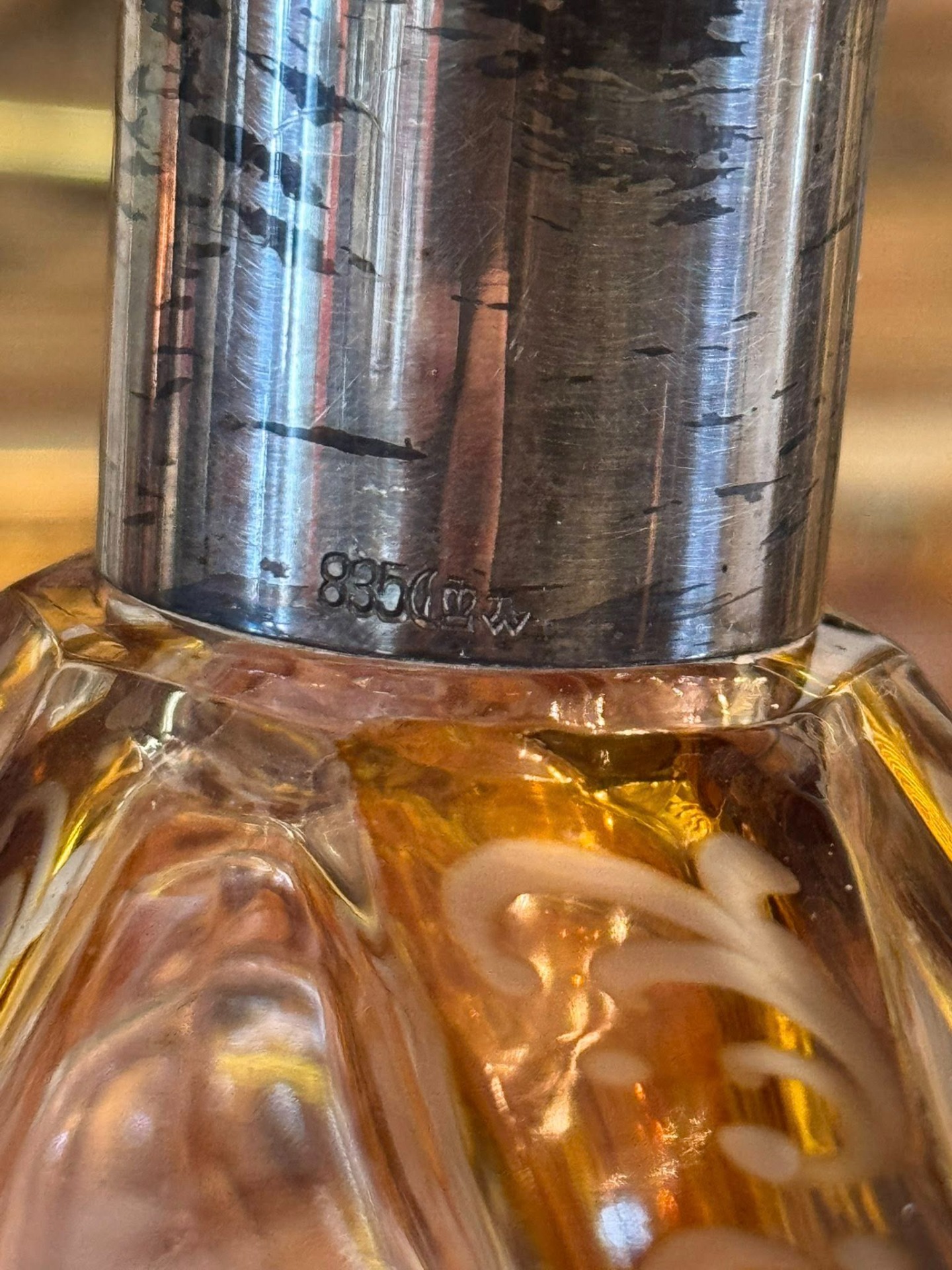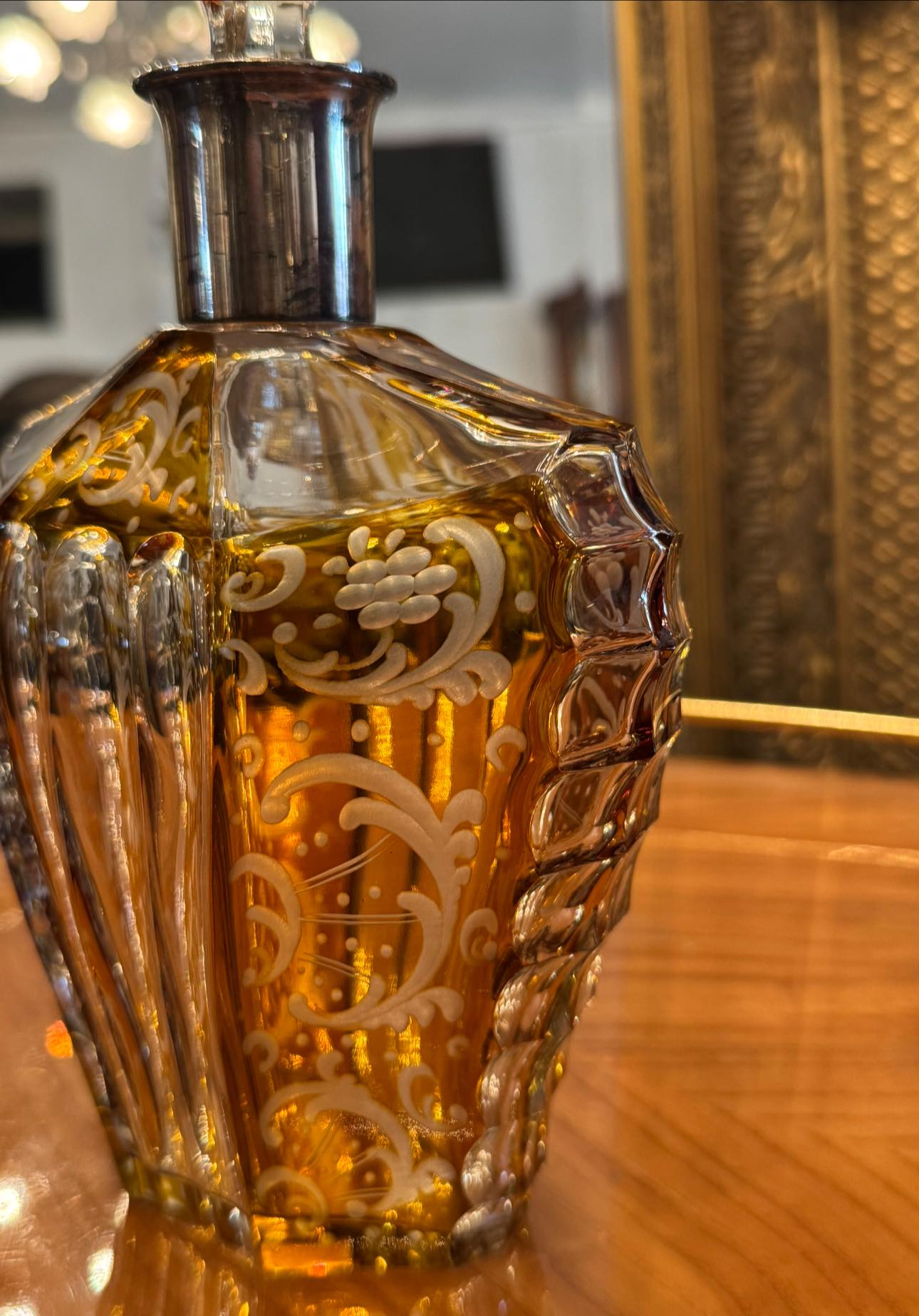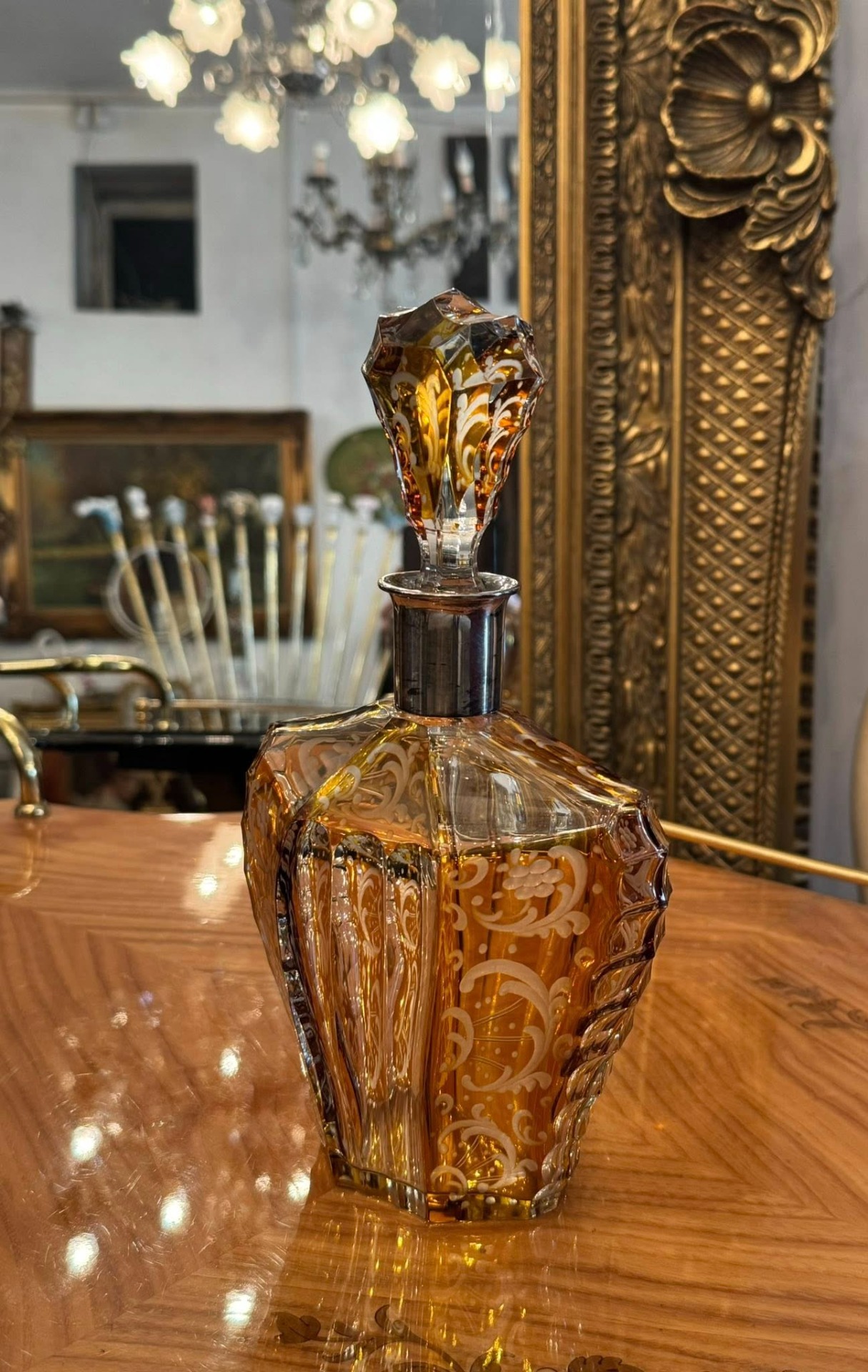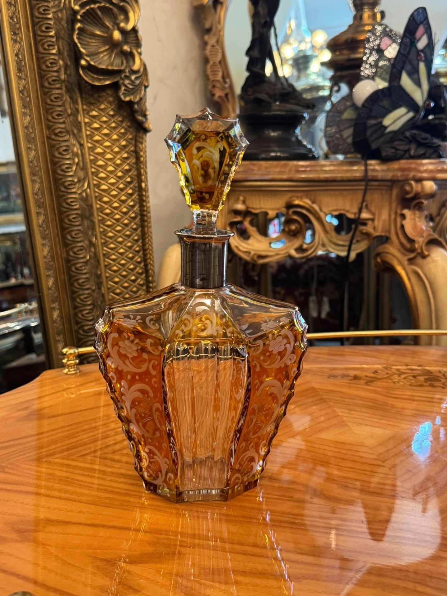Sticlă impresionantă în stilului Art Deco din cristal stratificat de Boemia și gât din argint. Forma hexagonală/fațetată și dopul masiv, de asemenea fațetat, sunt tipice pentru perioada 1920-1940.