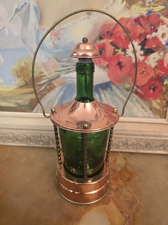 Sticla veche pentru băuturi în montura de cupru cu sistem muzical (în momentul în care se ridica începe sa cante)