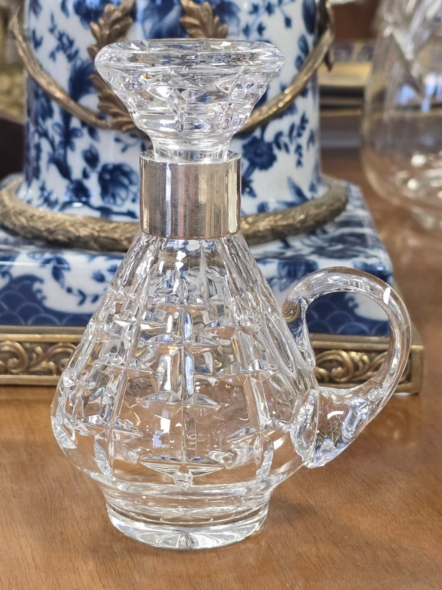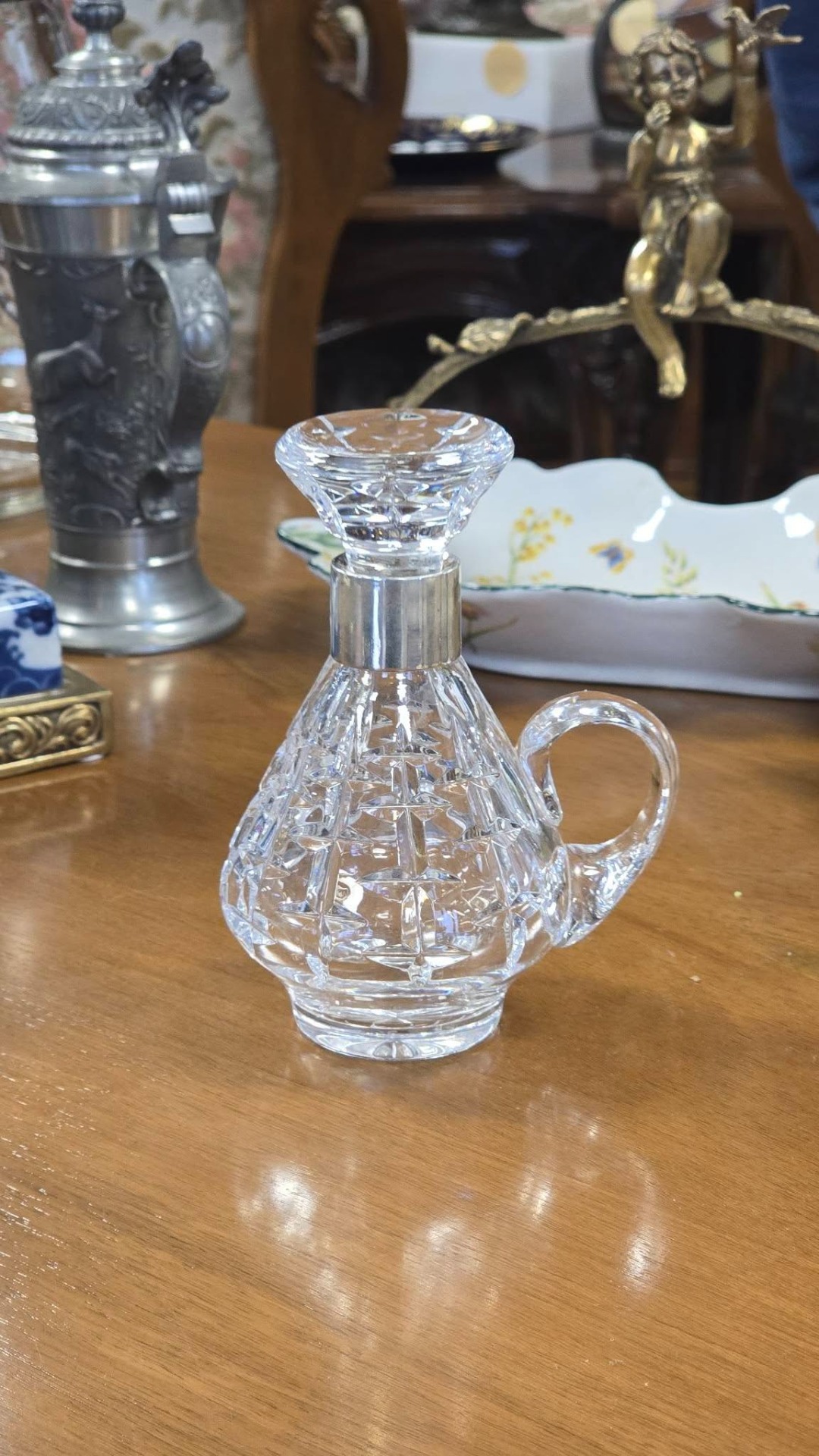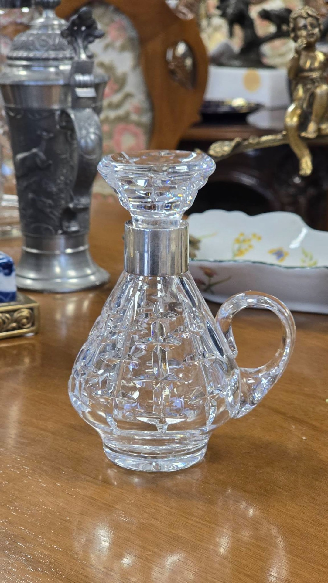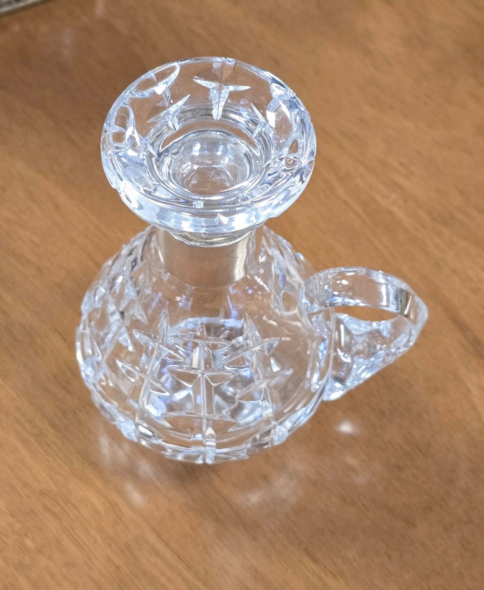Sticluță pentru tărie vintage, din cristal tăiat și gravat manual, cu inel din argint pe gât și dop din cristal, în stare foarte bună, fără defecte.