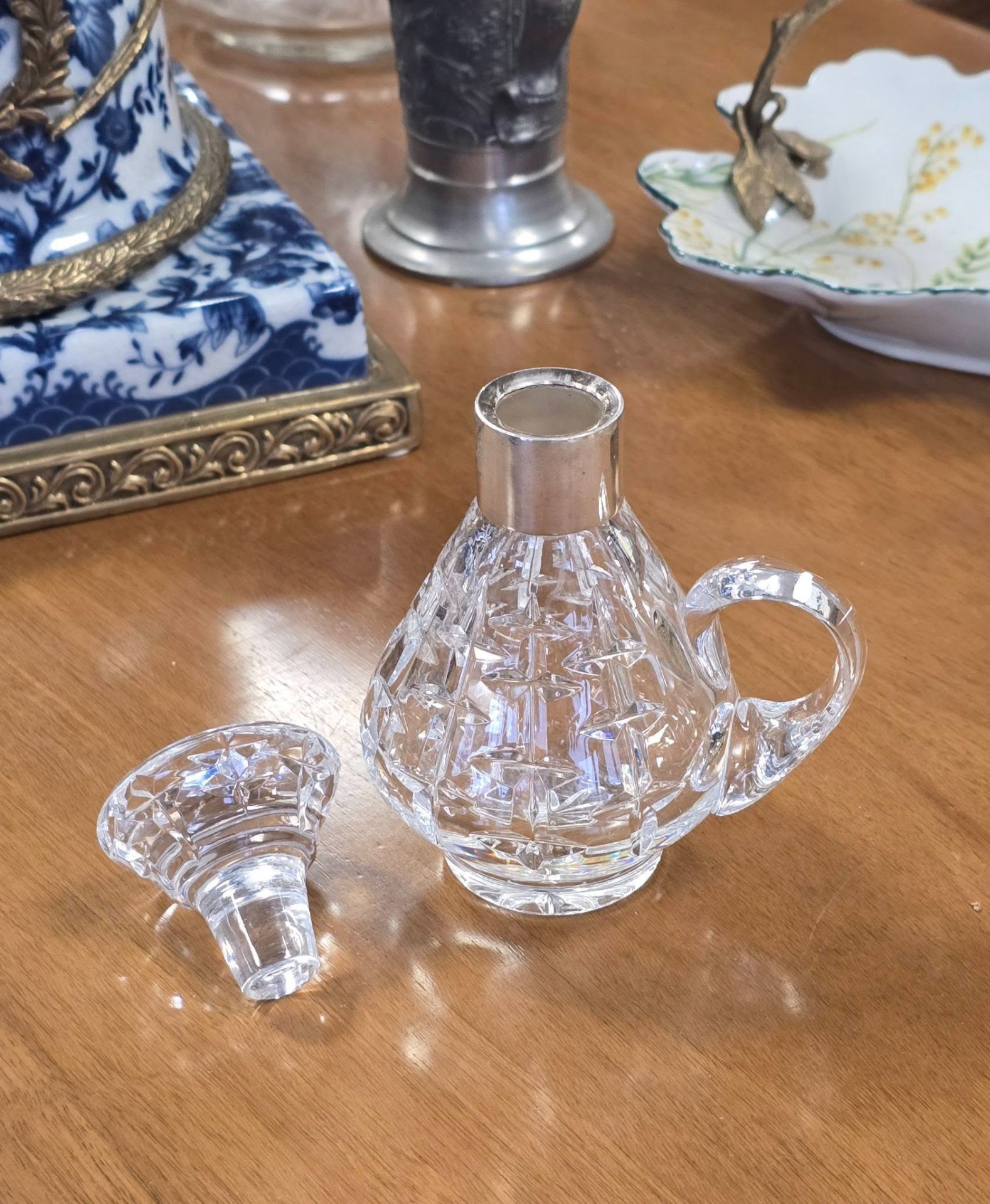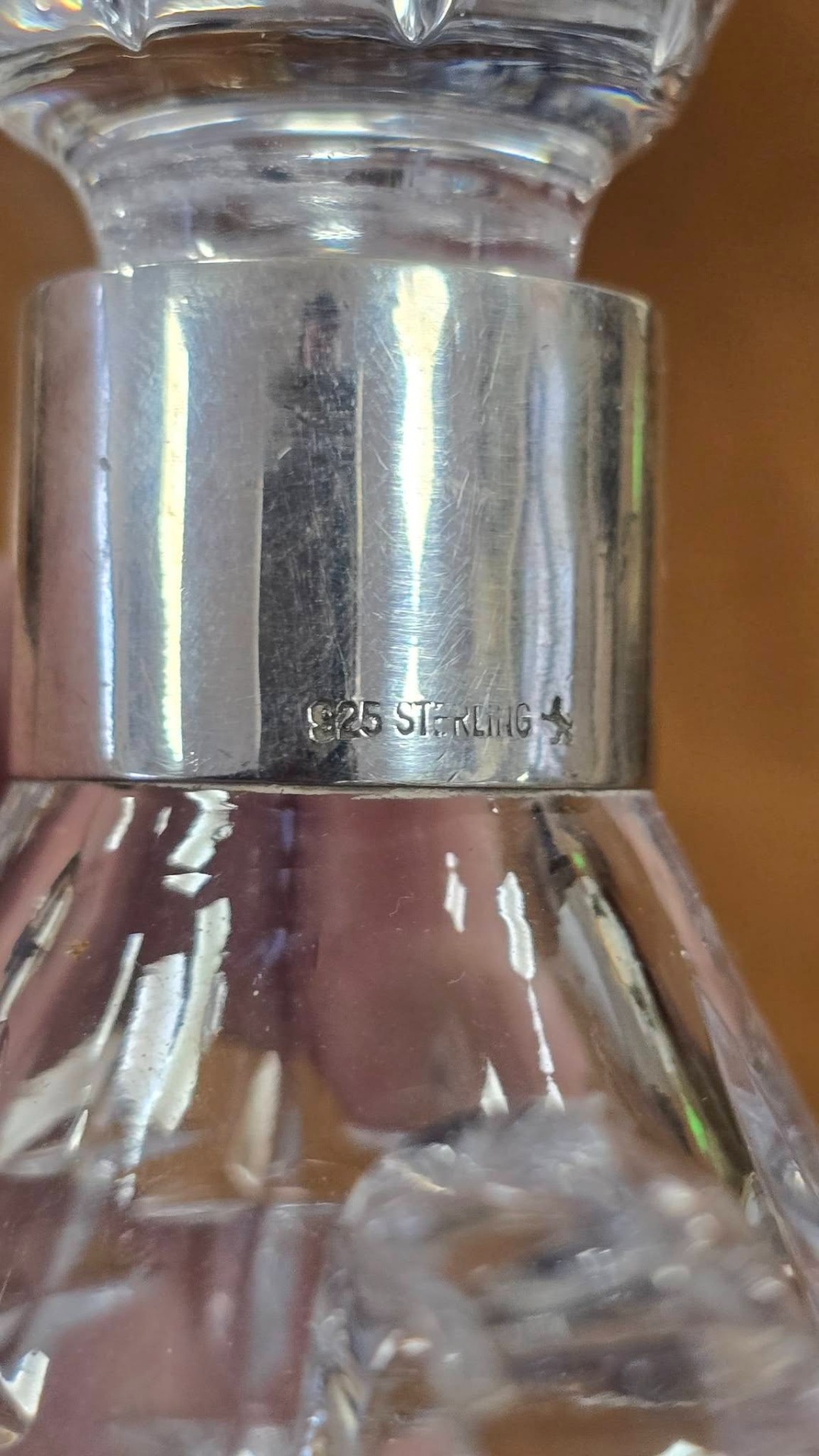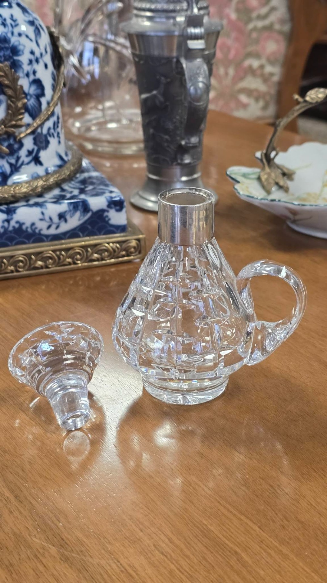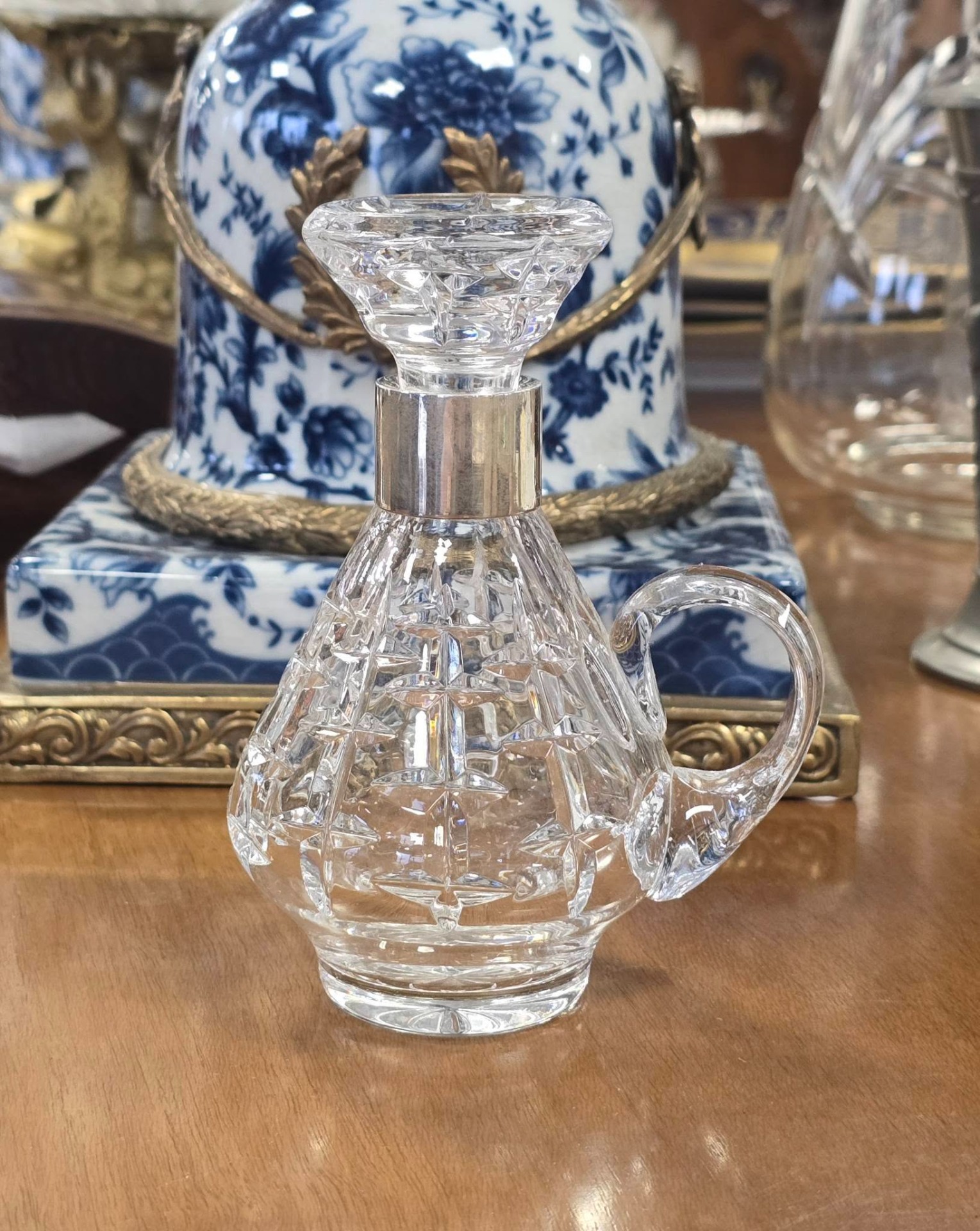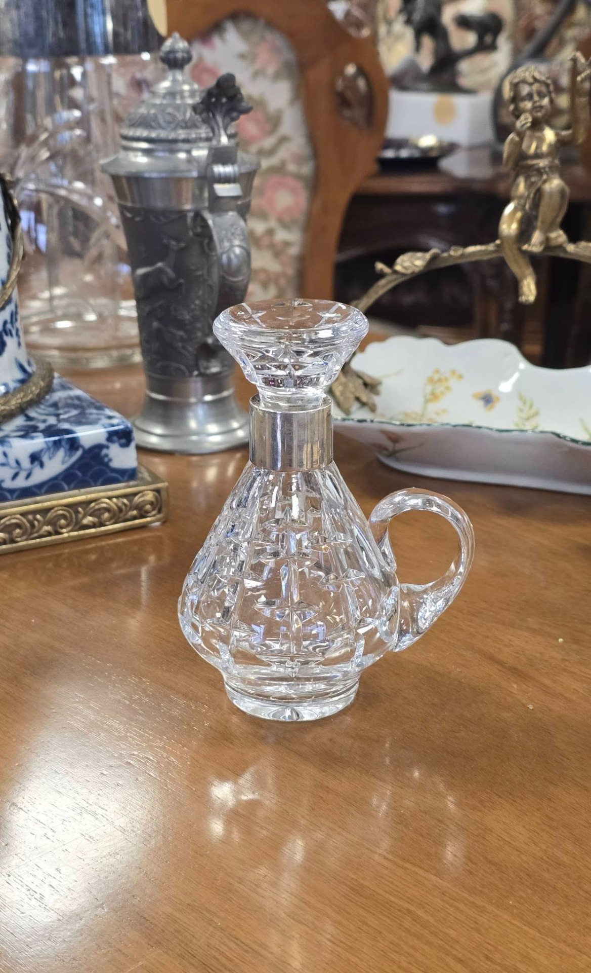 Sticluță pentru tărie vintage, din cristal tăiat și gravat manual, cu inel din argint pe gât și dop din cristal, în stare foarte bună, fără defecte.