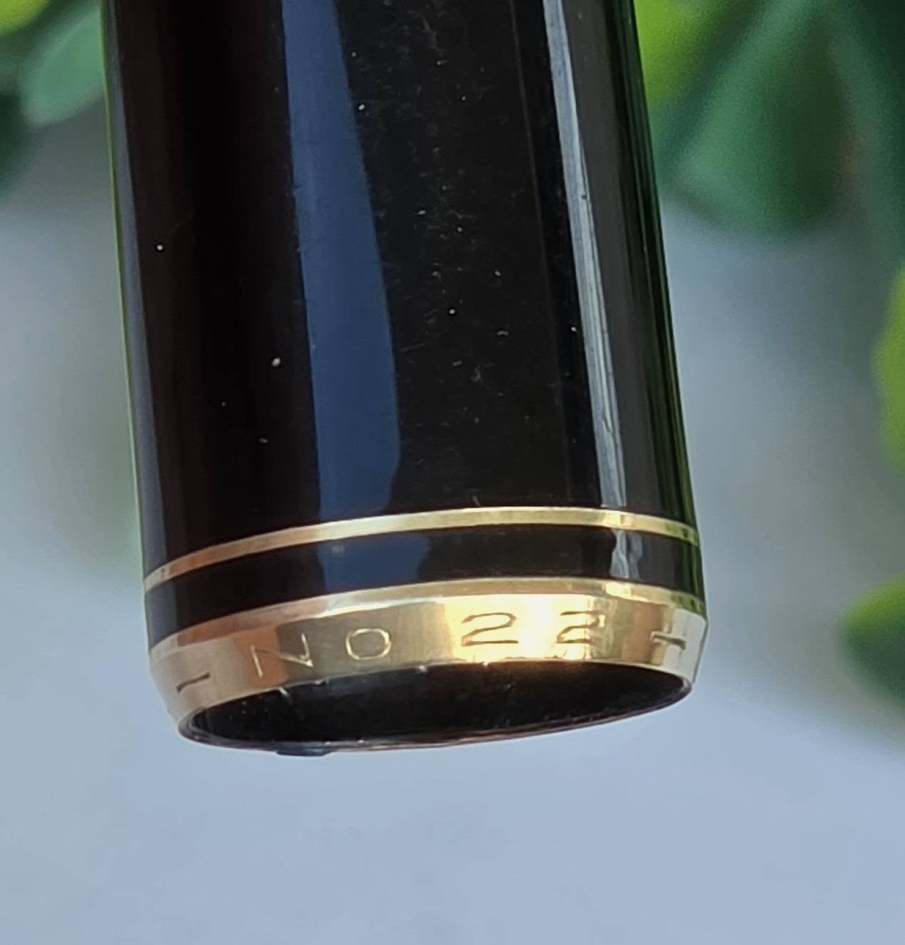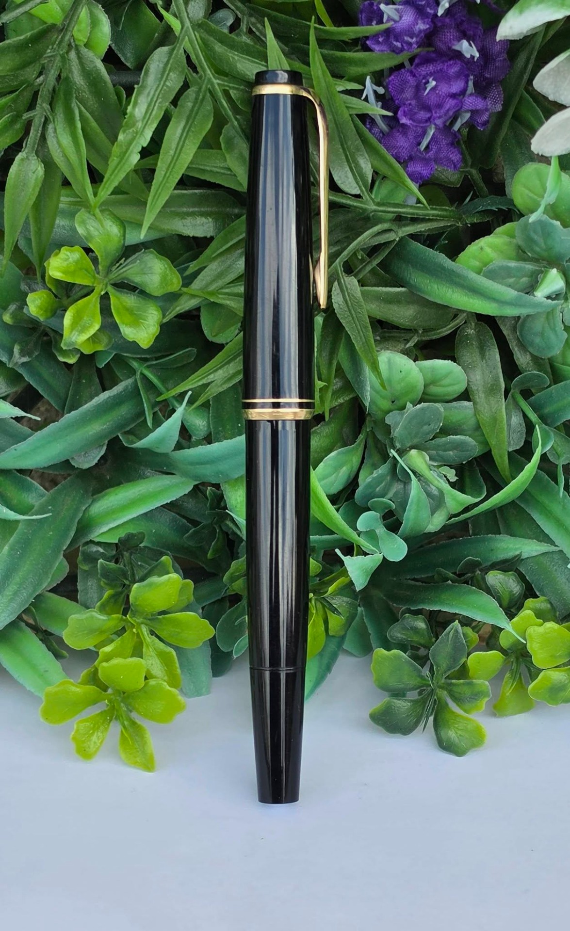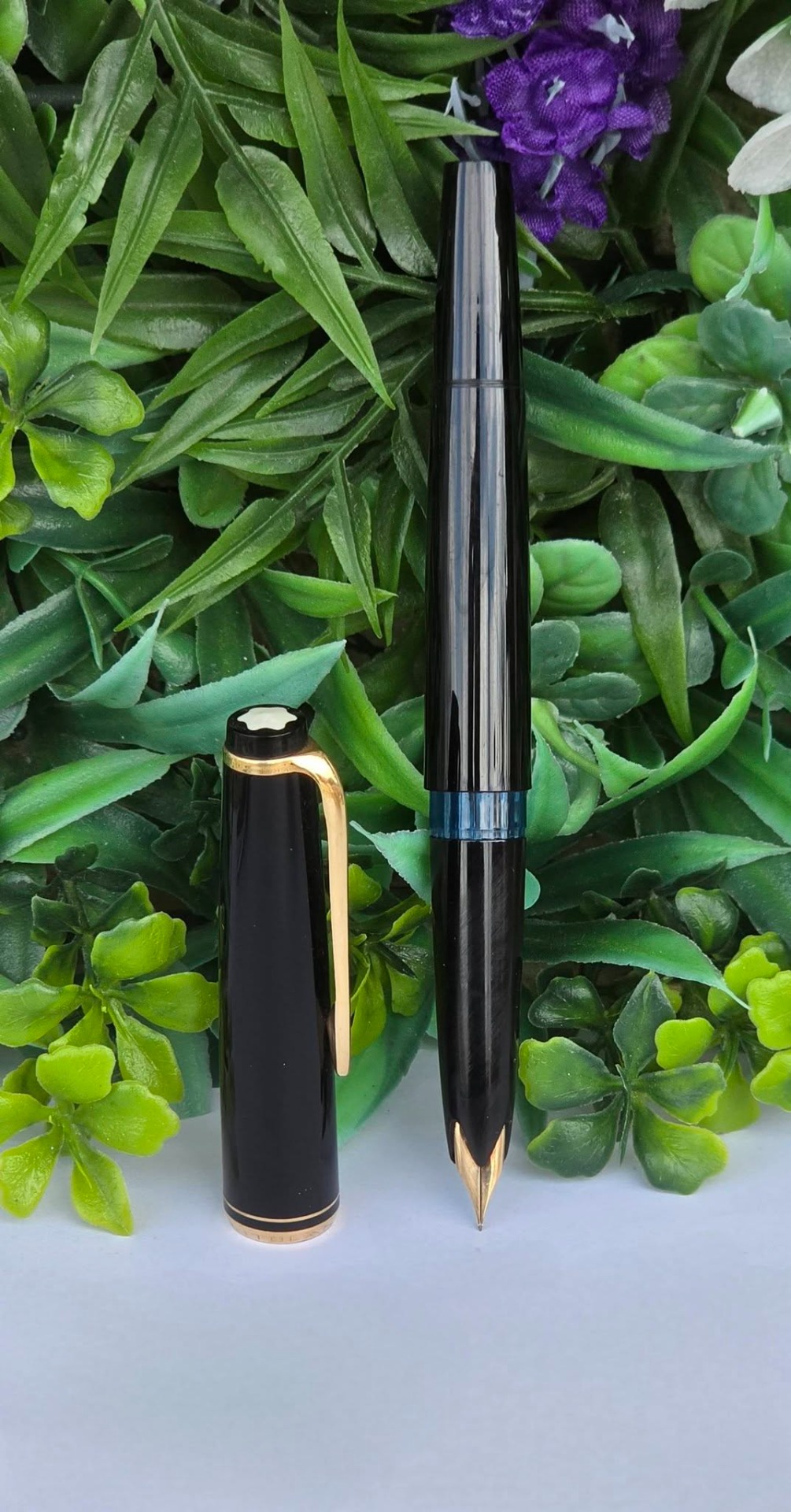Stilou vintage Montblanc Meisterstuck 22, rar, de colecție, din rășină prețioasă și accente aurite, cu peniță "wing-nib" (aripă) din aur de 14K și rezervor pentru cerneală, cu piston, în stare foarte bună, atât estetic cât și funcțional (anii 1960, Germania).