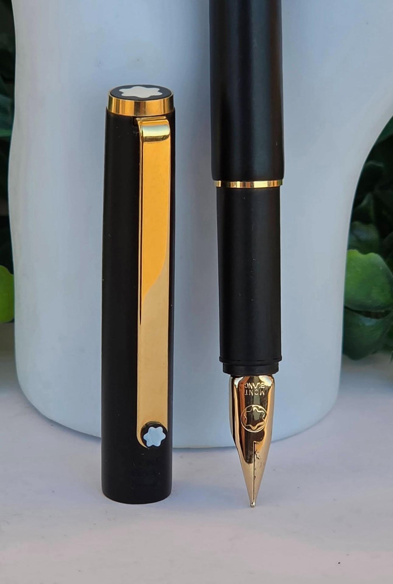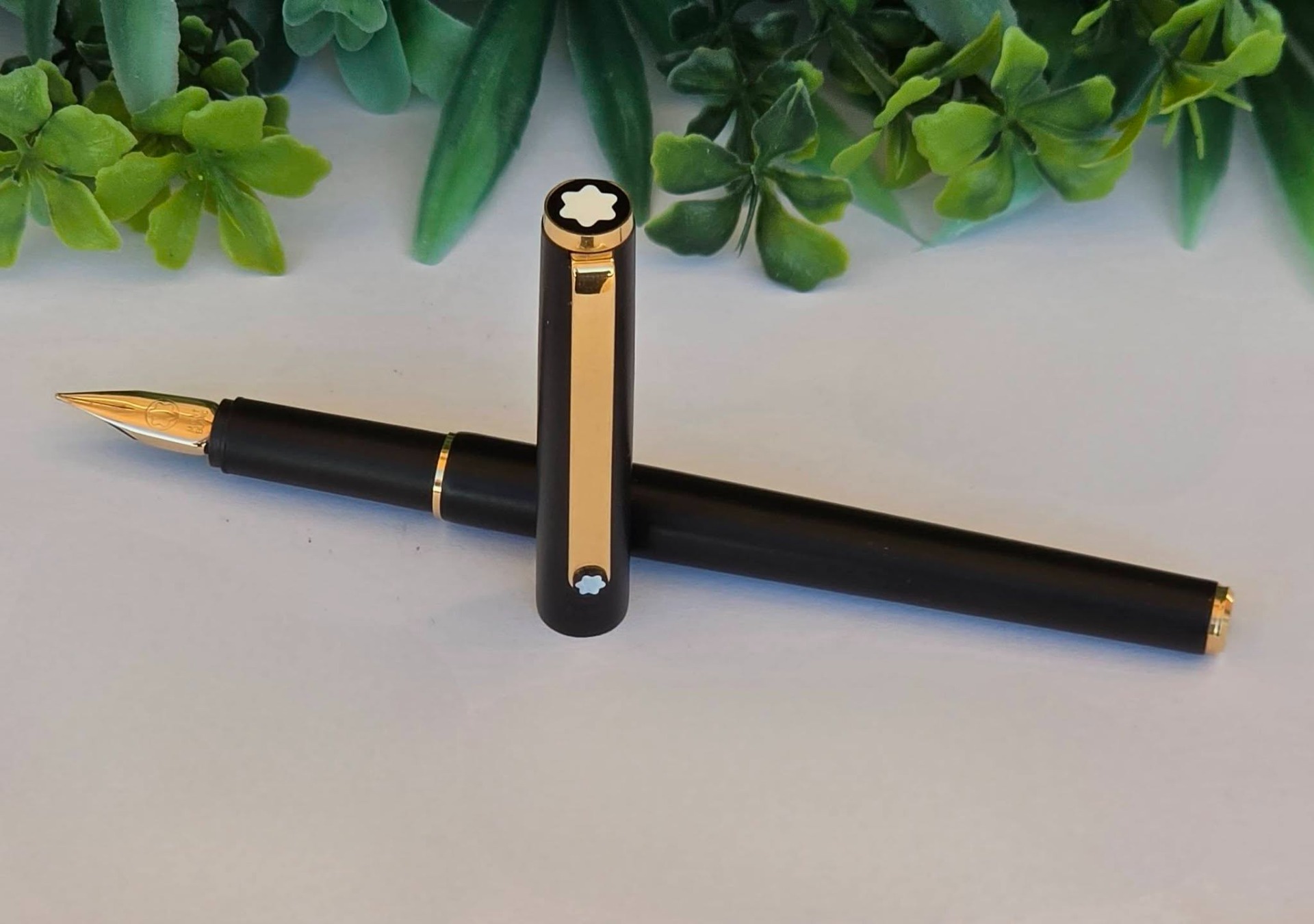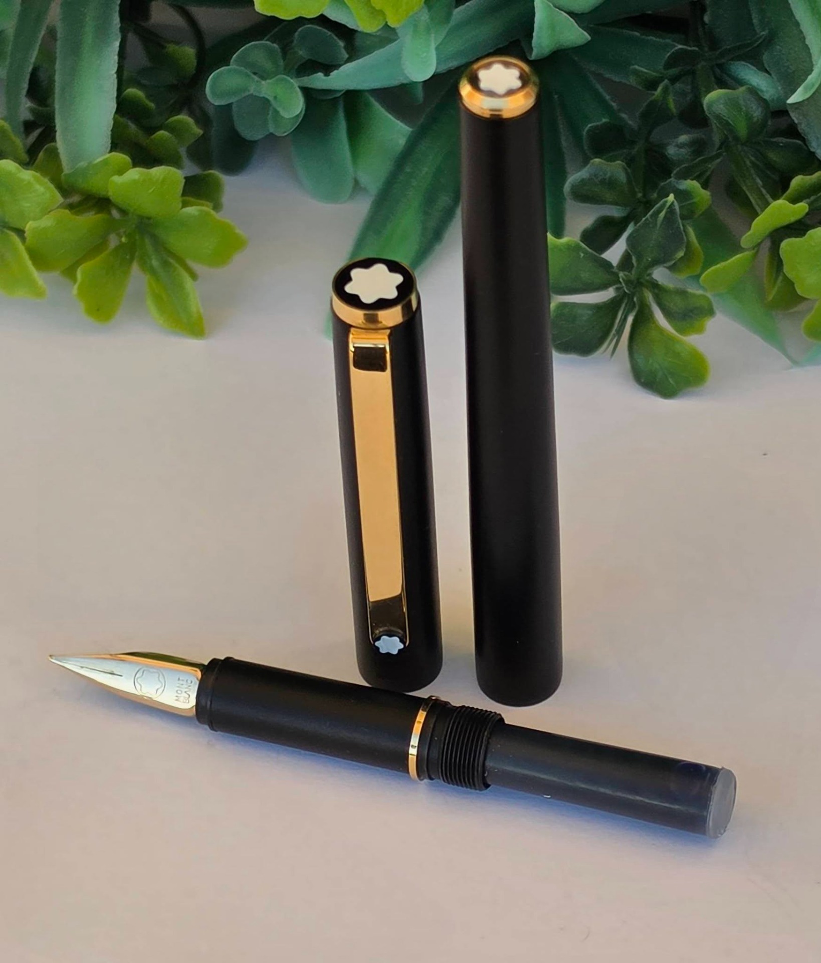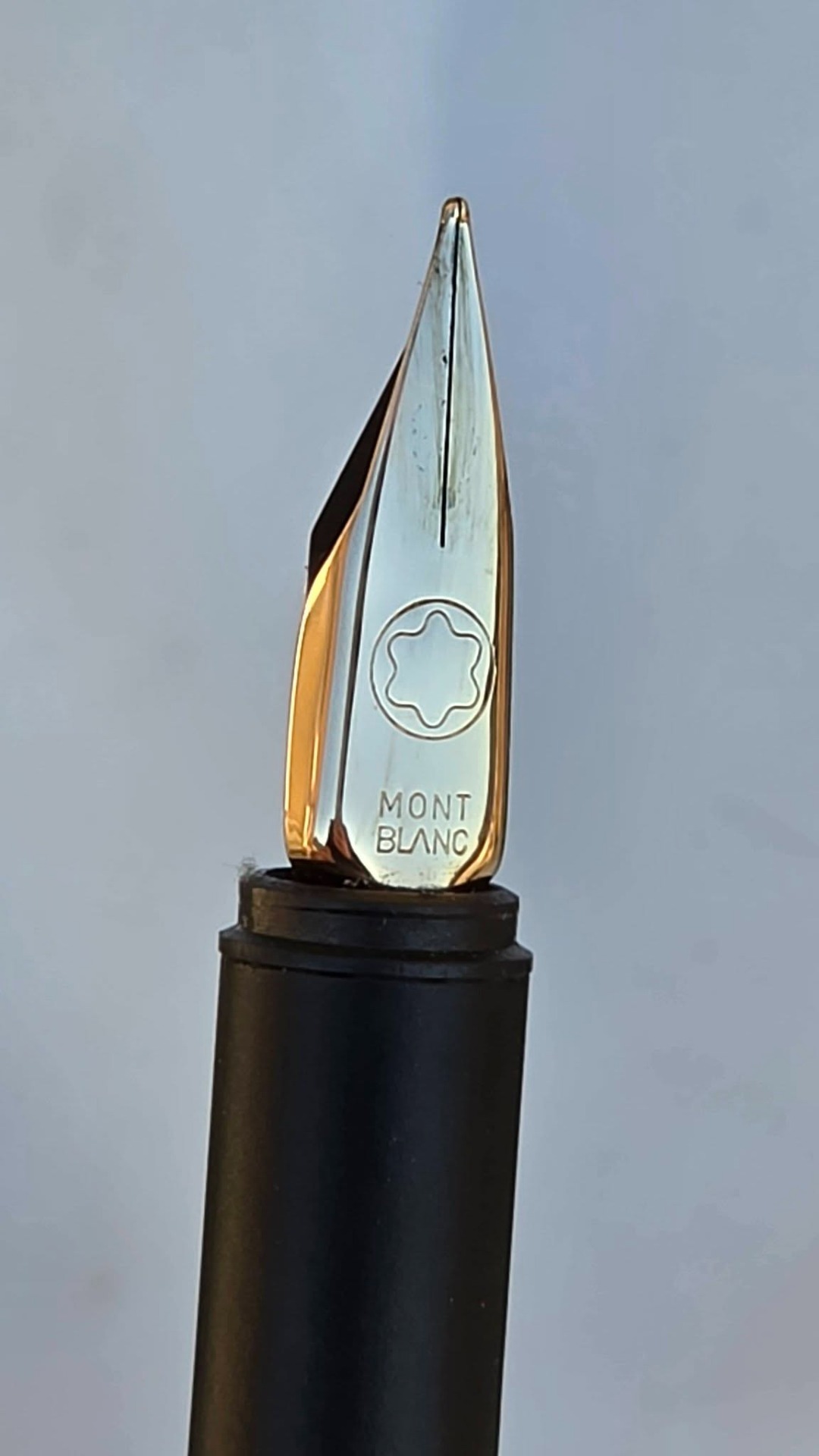 Stilou vintage Montblanc Noblesse Steel Slimline, de colecție, cu design subțire, elegant și finisaj negru mat cu accente aurii, peniță "wing nib" (aripă) din oțel placat cu aur, în stare excelentă atât estetic cât și funcțional (anii 1970-1980, Germania).