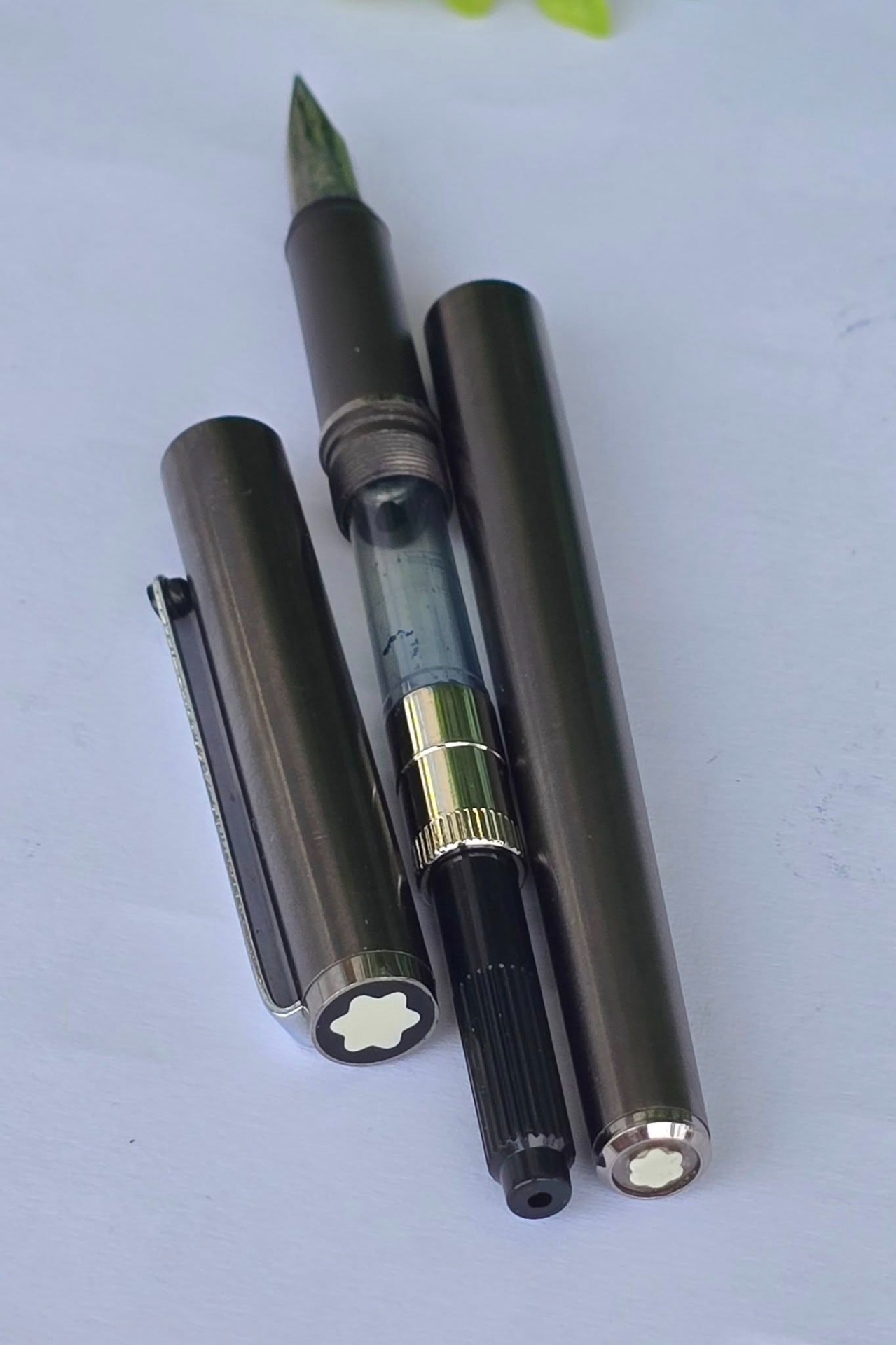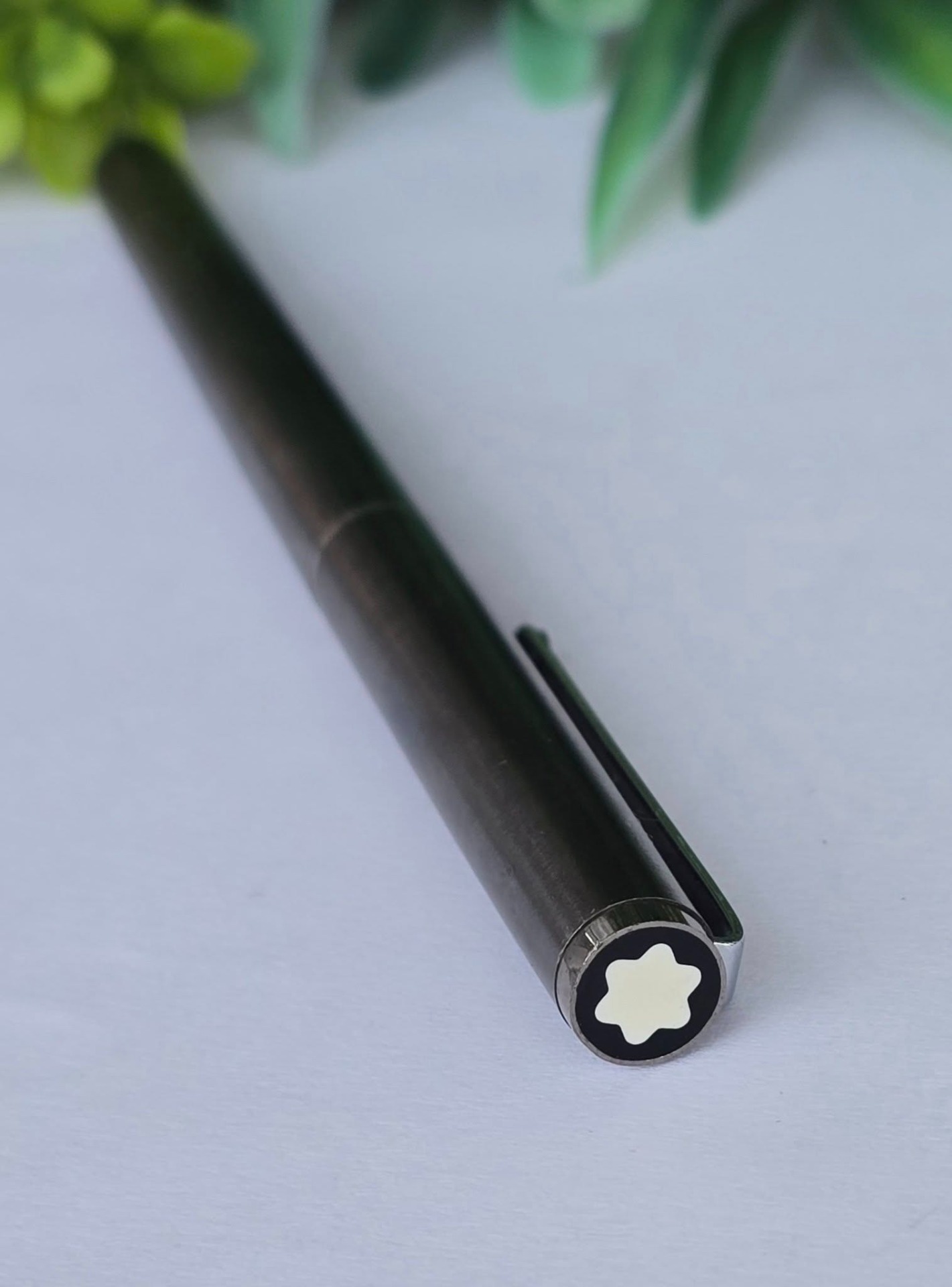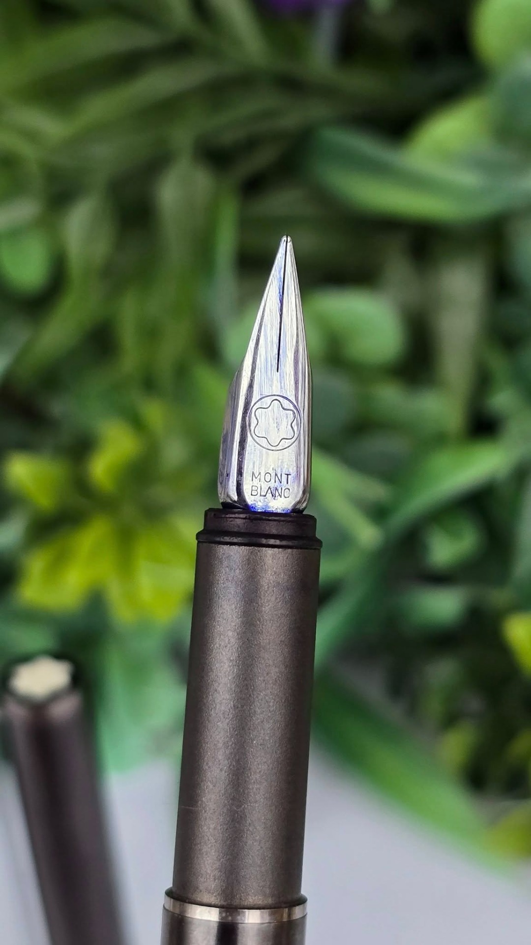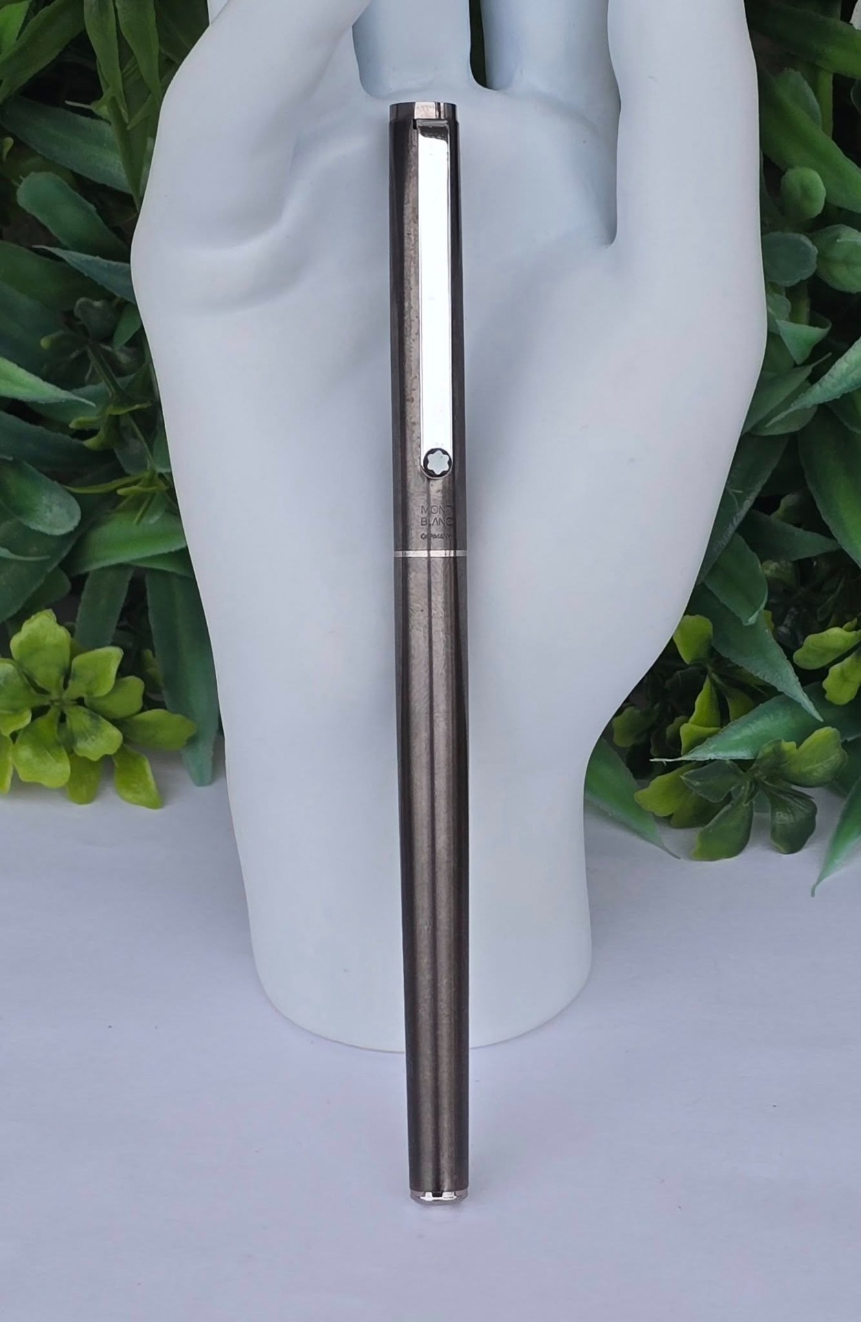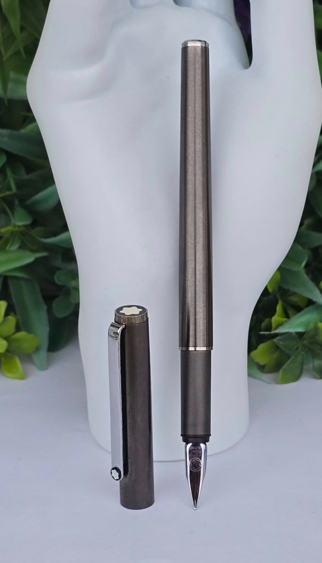 Stilou vintage Montblanc Slimline Gunmetal, de colecție, cu design subțire, elegant și finisaj metalic mat, peniță "wing nib"(aripă) din oțel și rezervor pentru