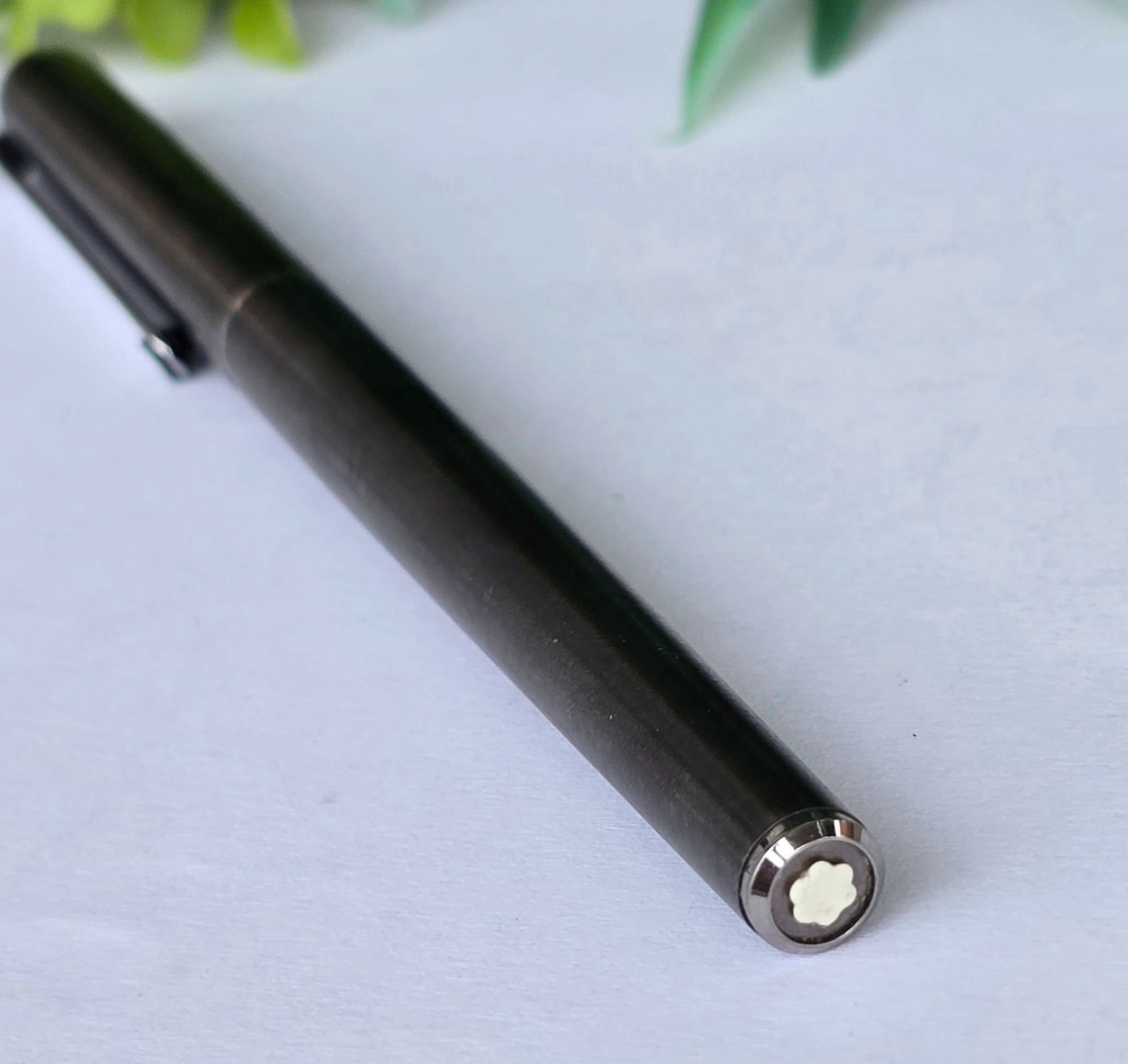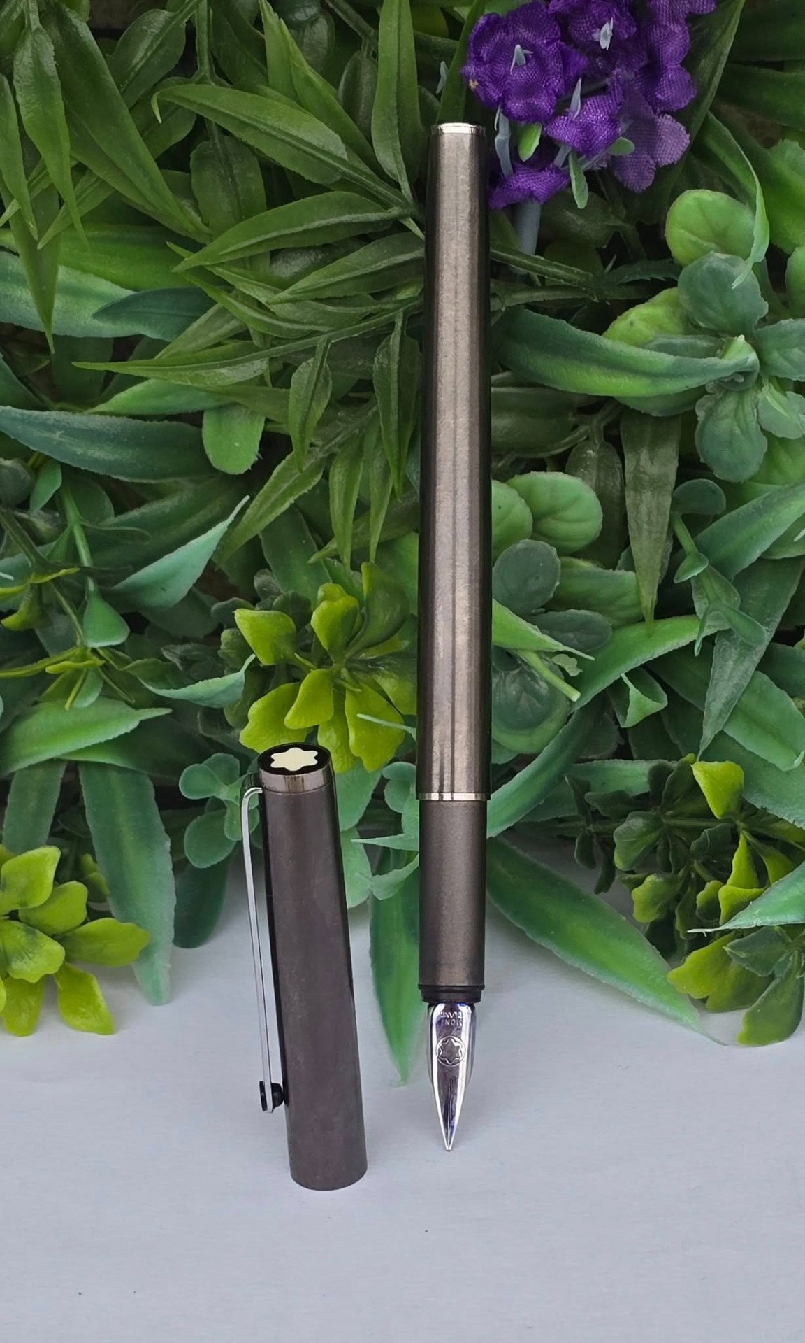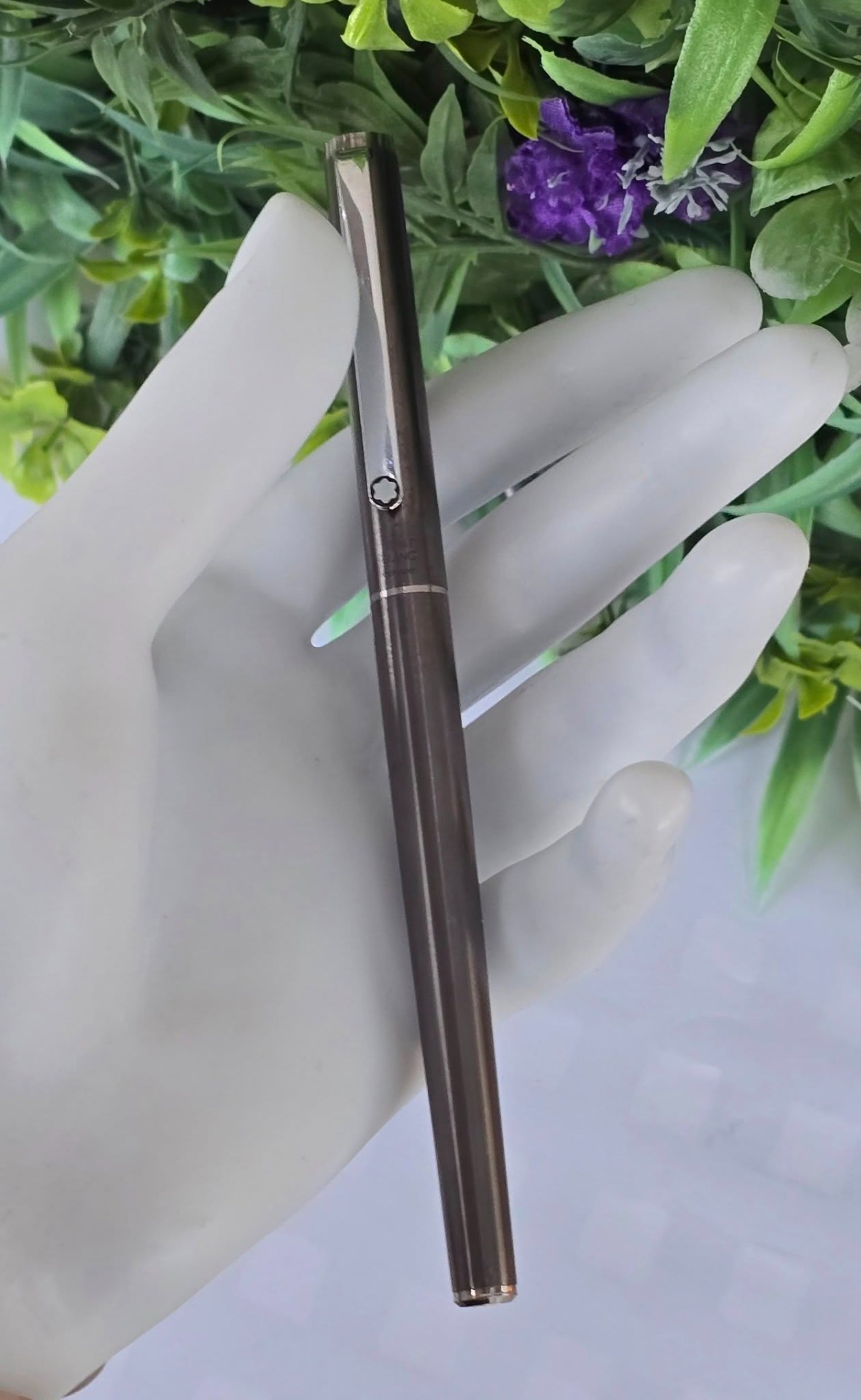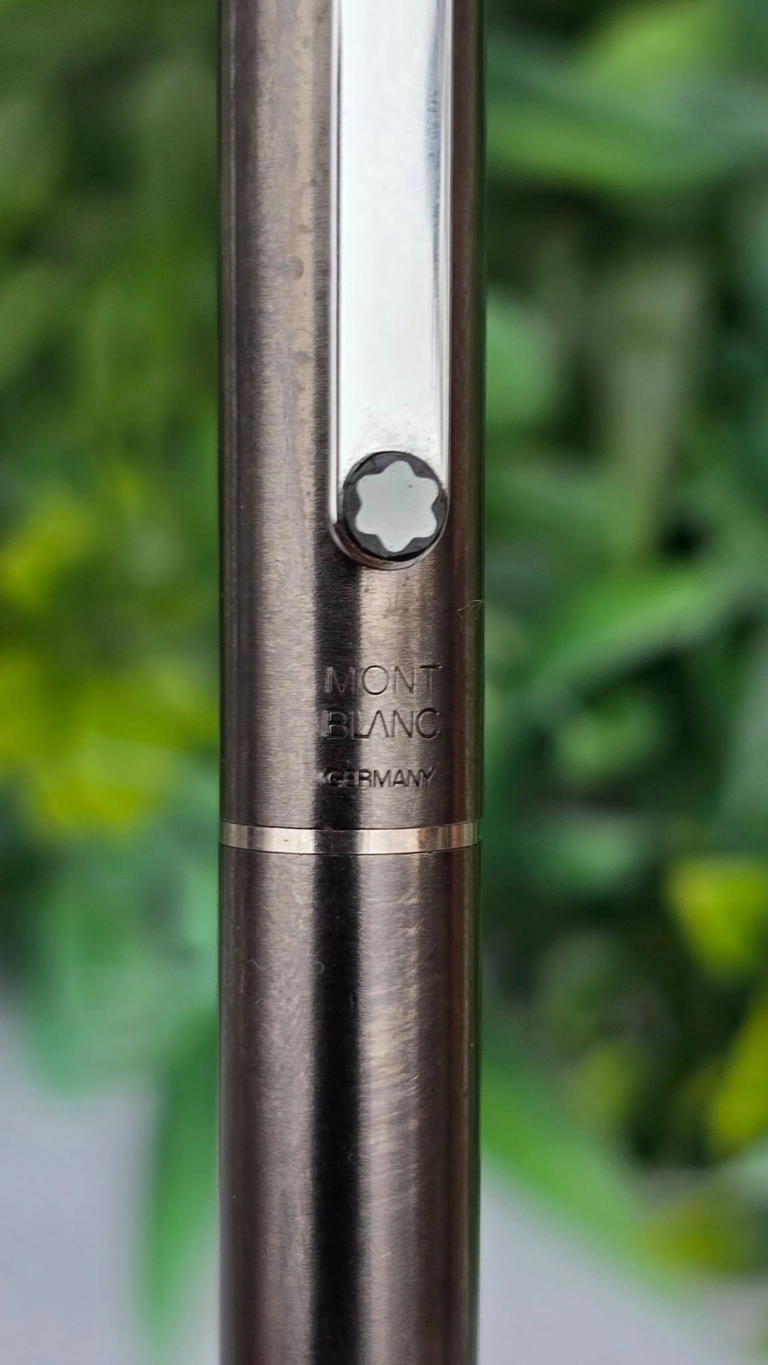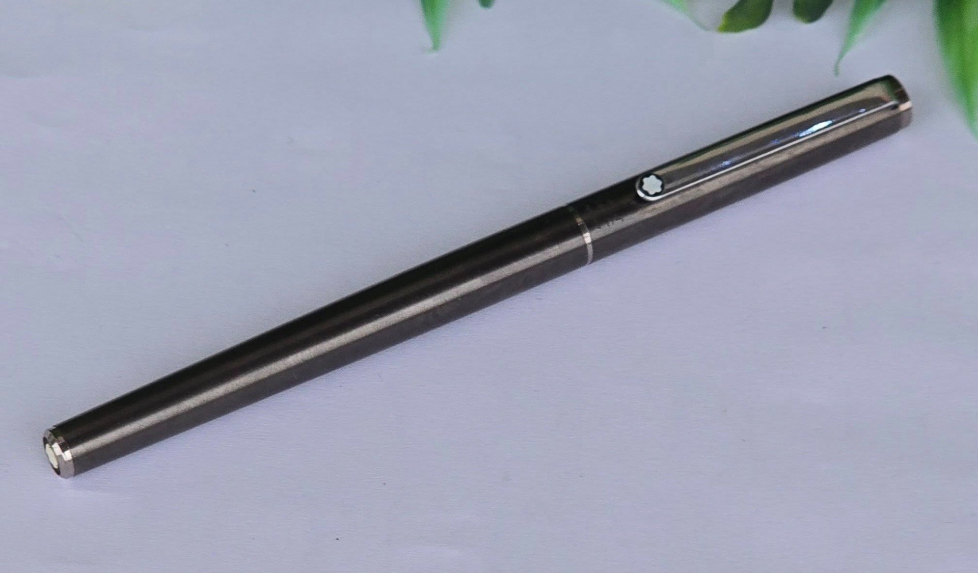 Stilou vintage Montblanc Slimline Gunmetal, de colecție, cu design subțire, elegant și finisaj metalic mat, peniță "wing nib"(aripă) din oțel și rezervor pentru