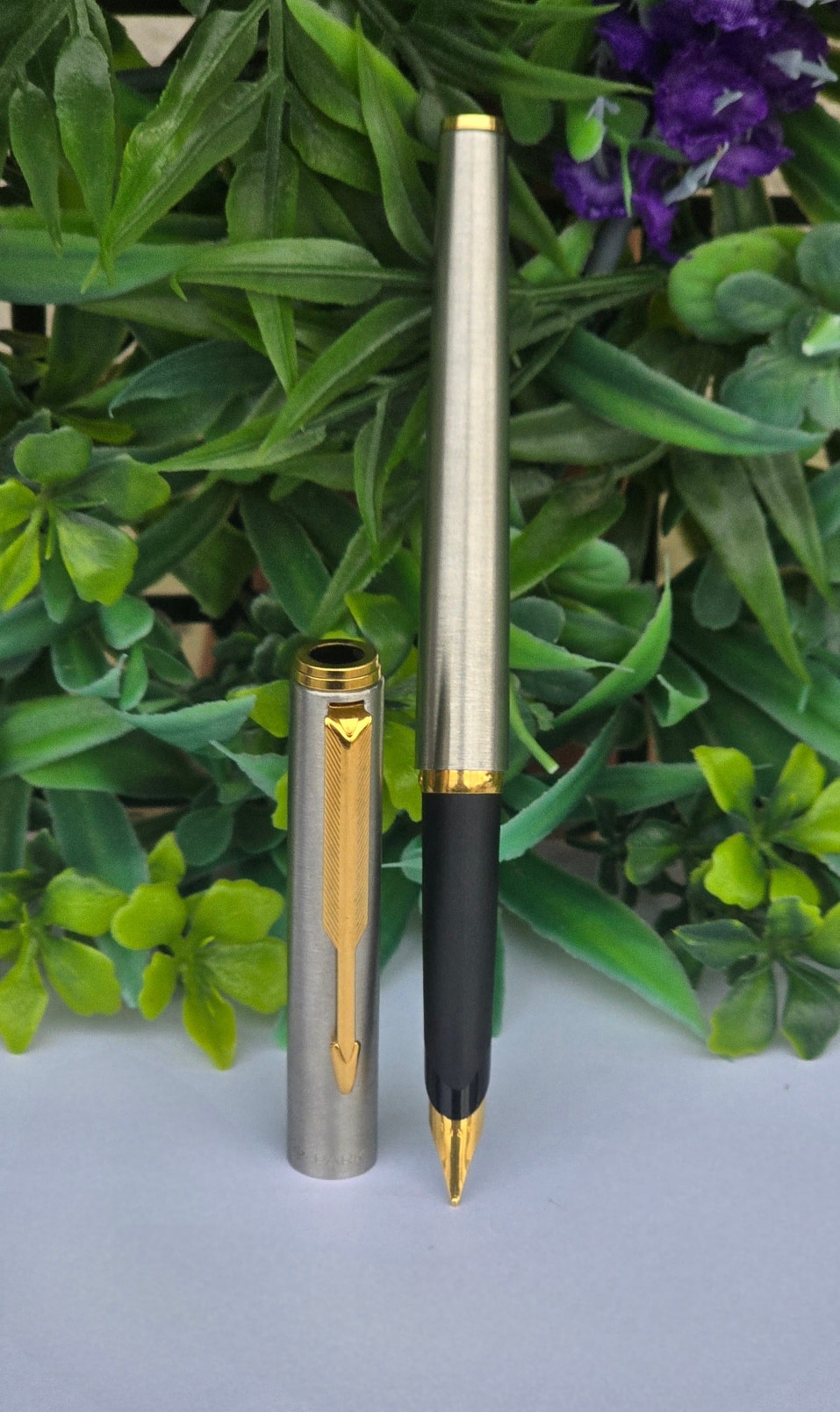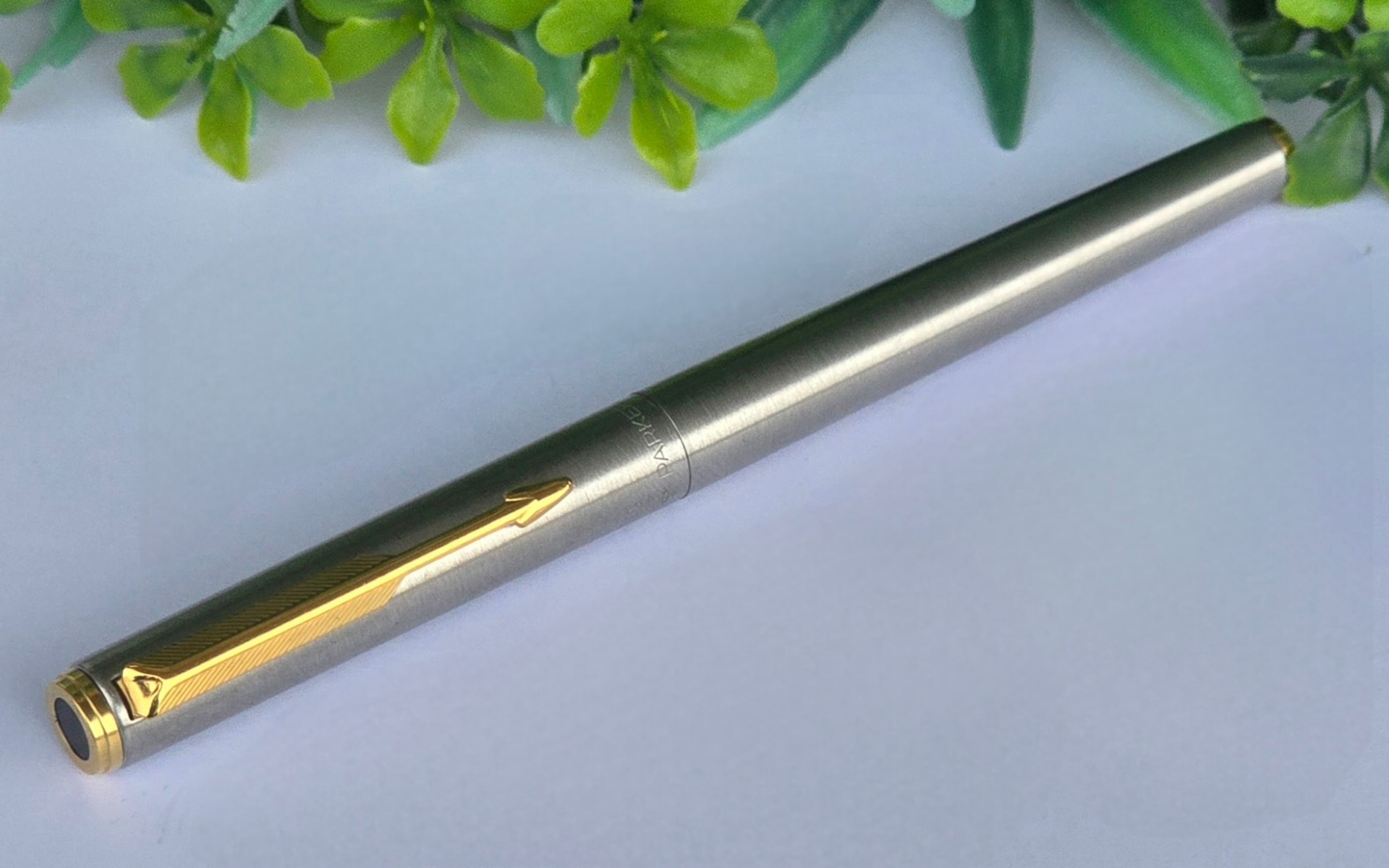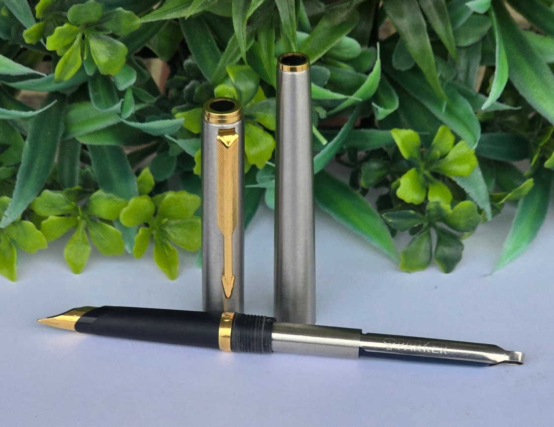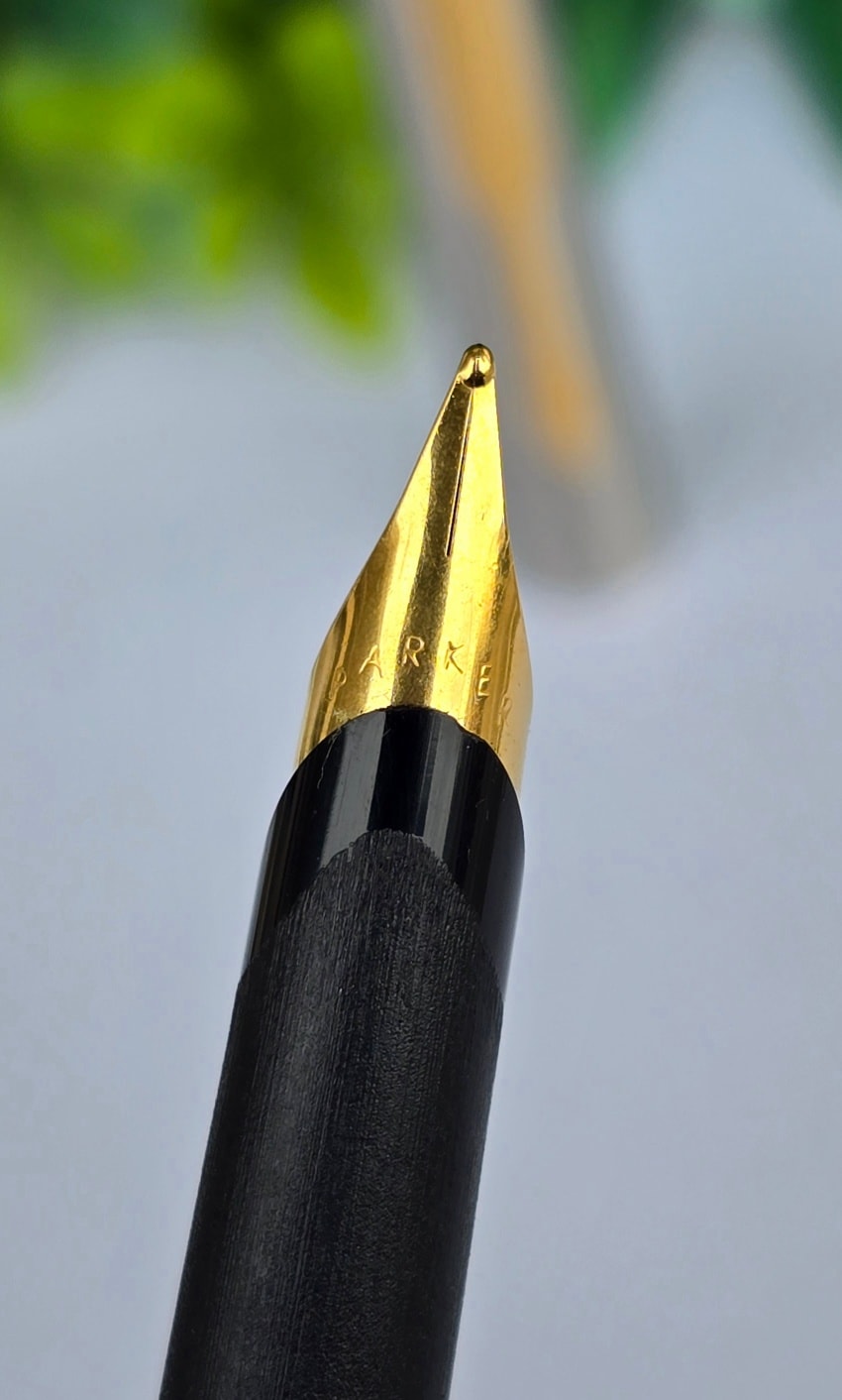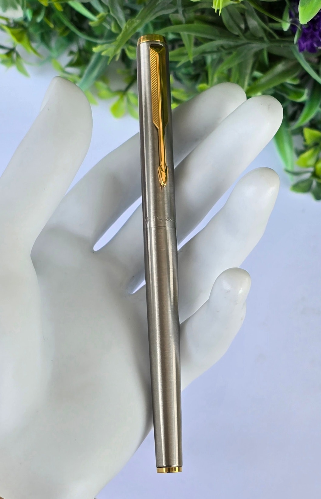 Stilou vintage Parker 15 Fountain Pen Gold Trim, de colecție, din oțel inoxidabil și accente aurite, cu convertor metalic aerometric original, piesă rară și mult mai durabilă decât cele moderne din plastic (1985, Anglia).