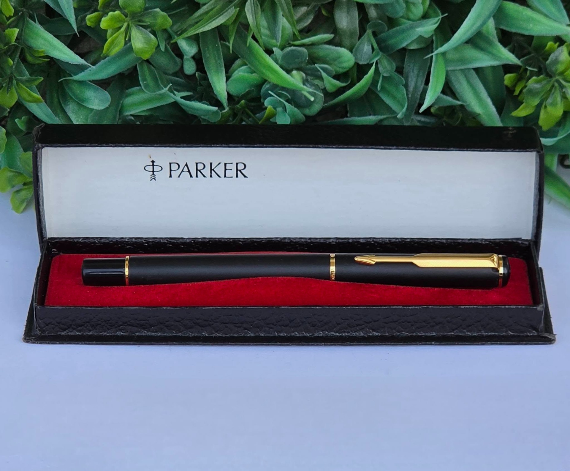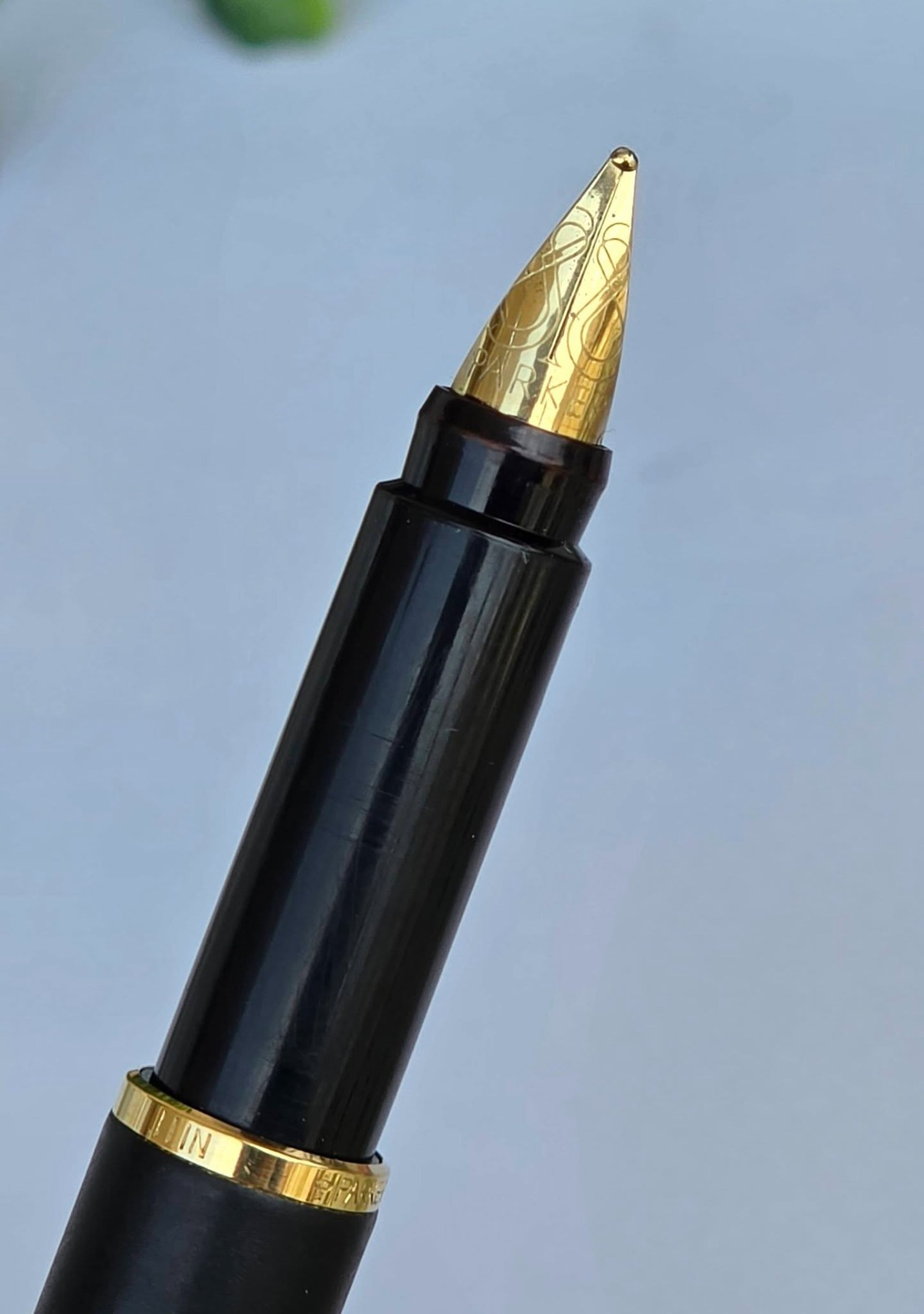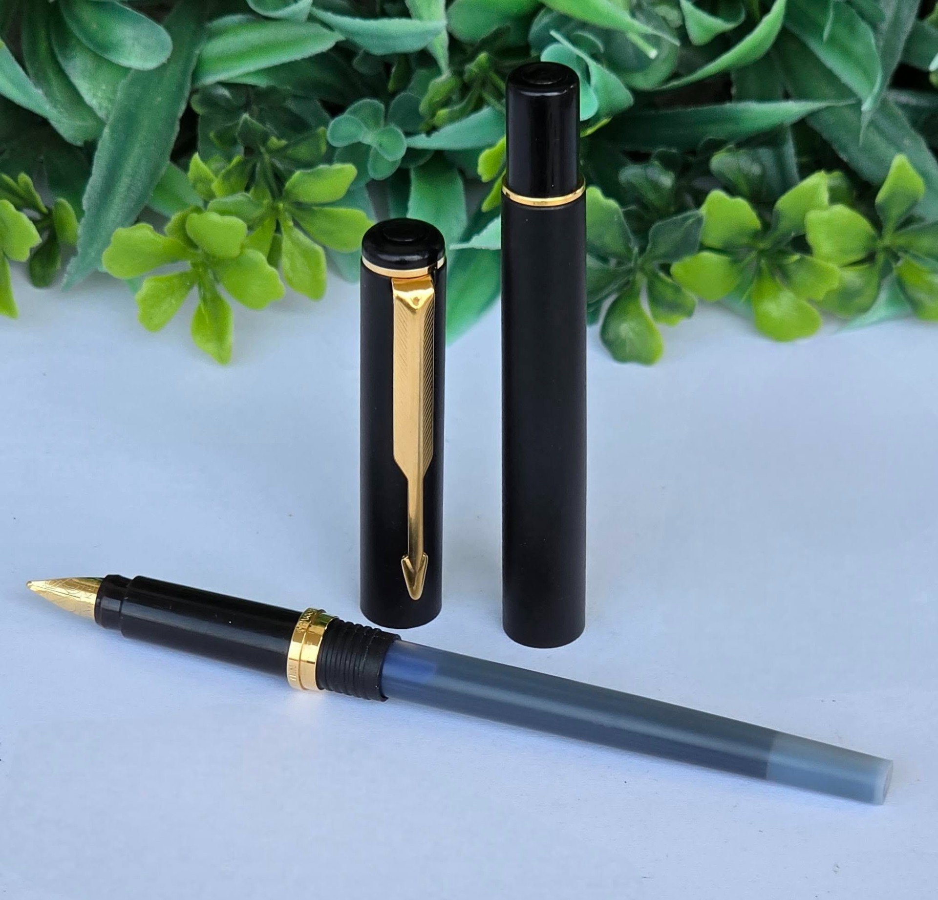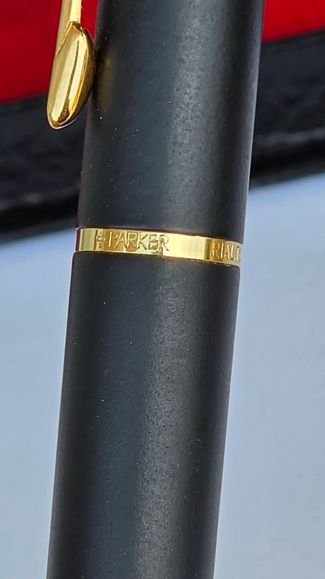 Stilou vintage Parker Rialto, de colecție, cu finisaj negru mat și accente aurite, cu peniță placată cu aur de 23K decorată specific modelului Rialto, în stare foarte bună atât estetic cât și funcțional, cu cutie originală, alimentat cu cartușe de cerneală (anii 1990, UK).