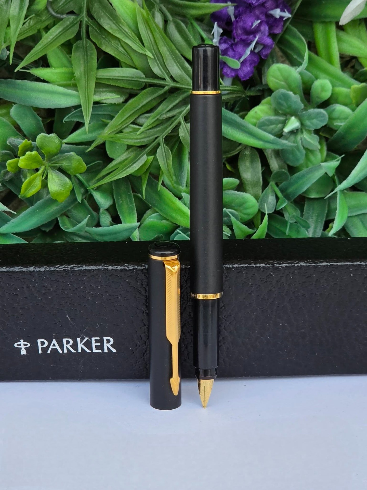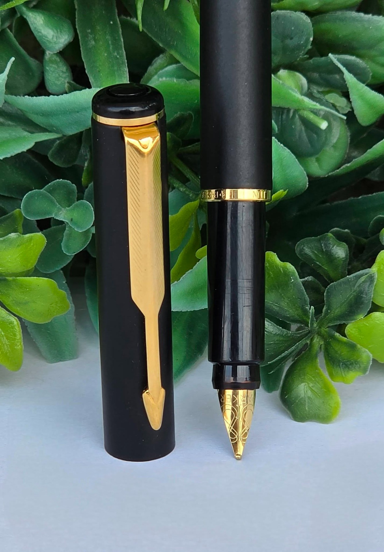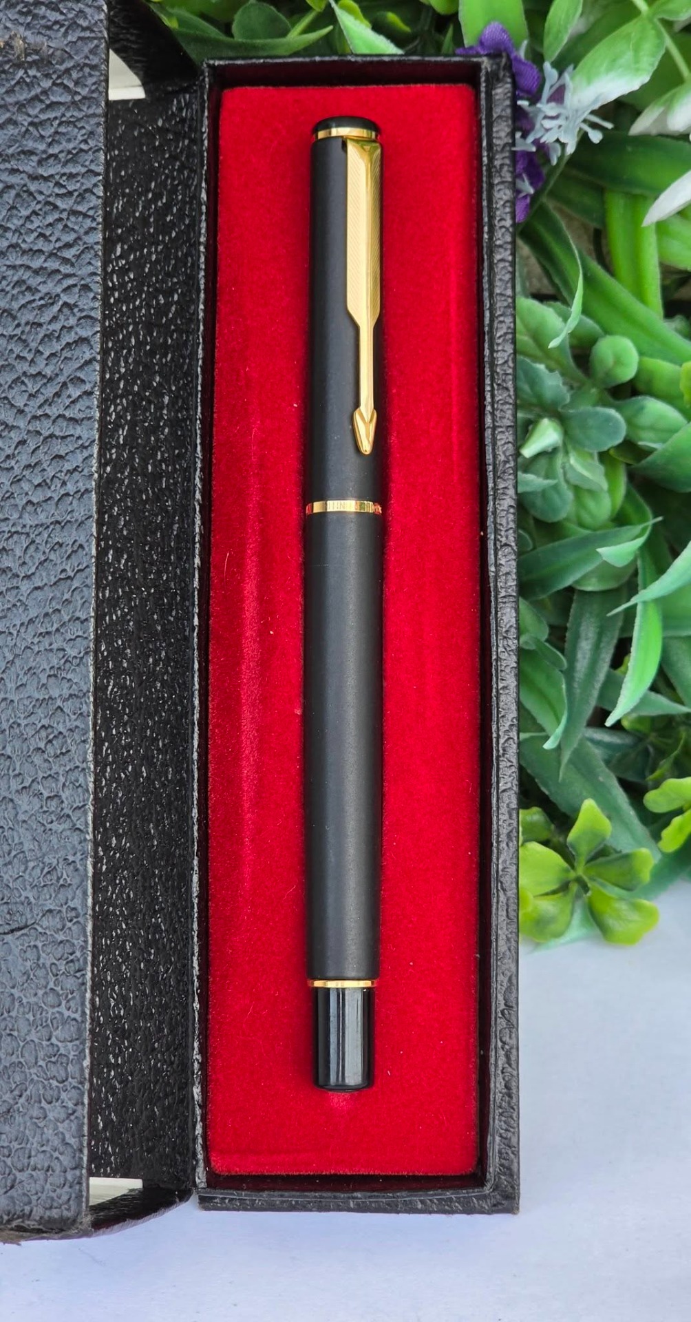 Stilou vintage Parker Rialto, de colecție, cu finisaj negru mat și accente aurite, cu peniță placată cu aur de 23K decorată specific modelului Rialto, în stare foarte bună atât estetic cât și funcțional, cu cutie originală, alimentat cu cartușe de cerneală (anii 1990, UK).