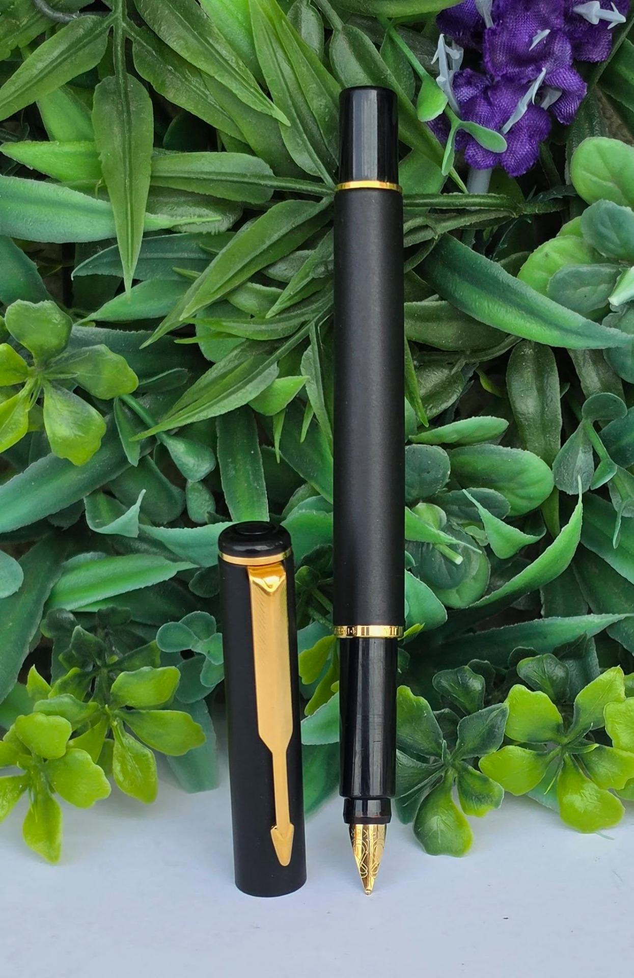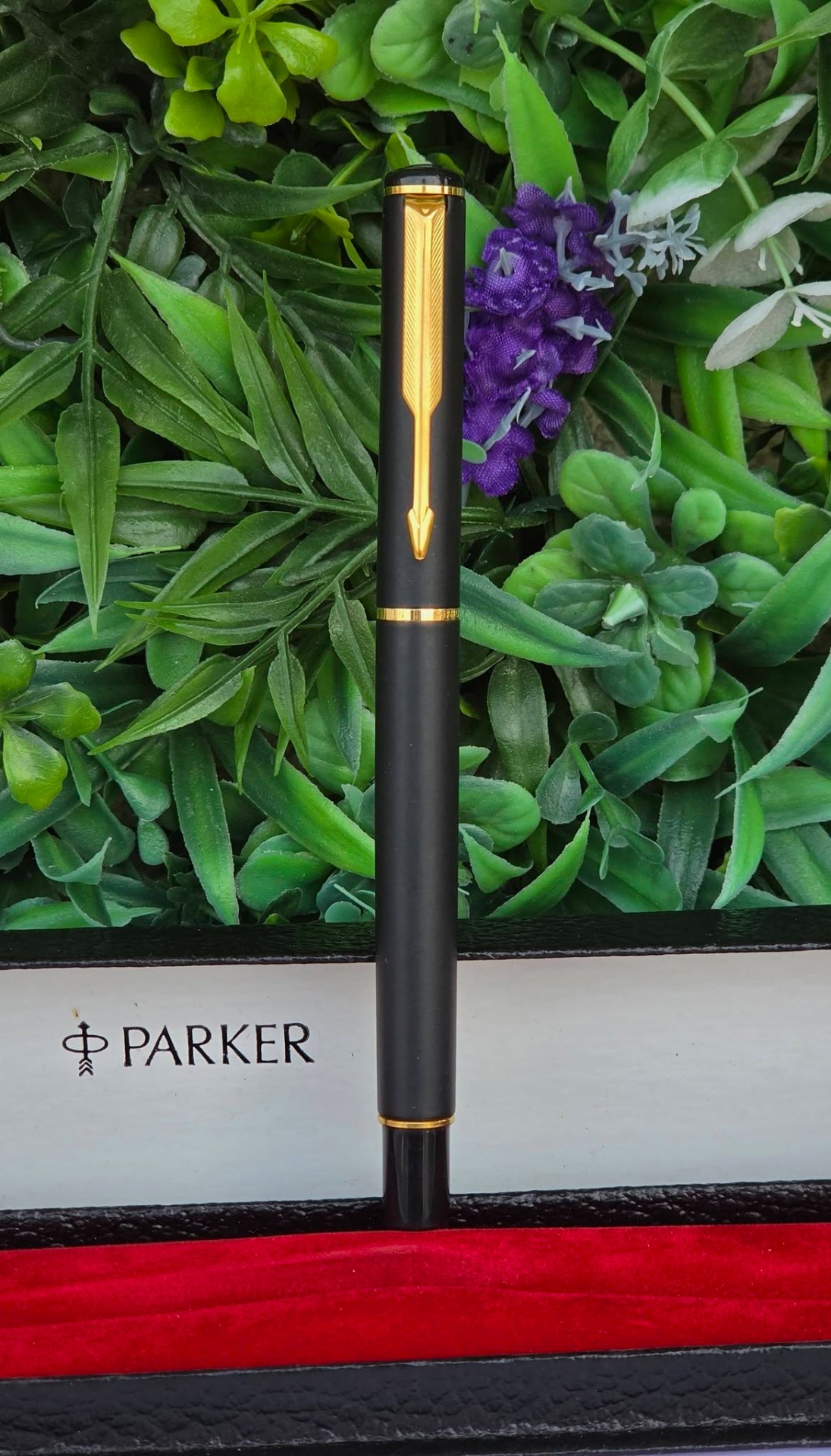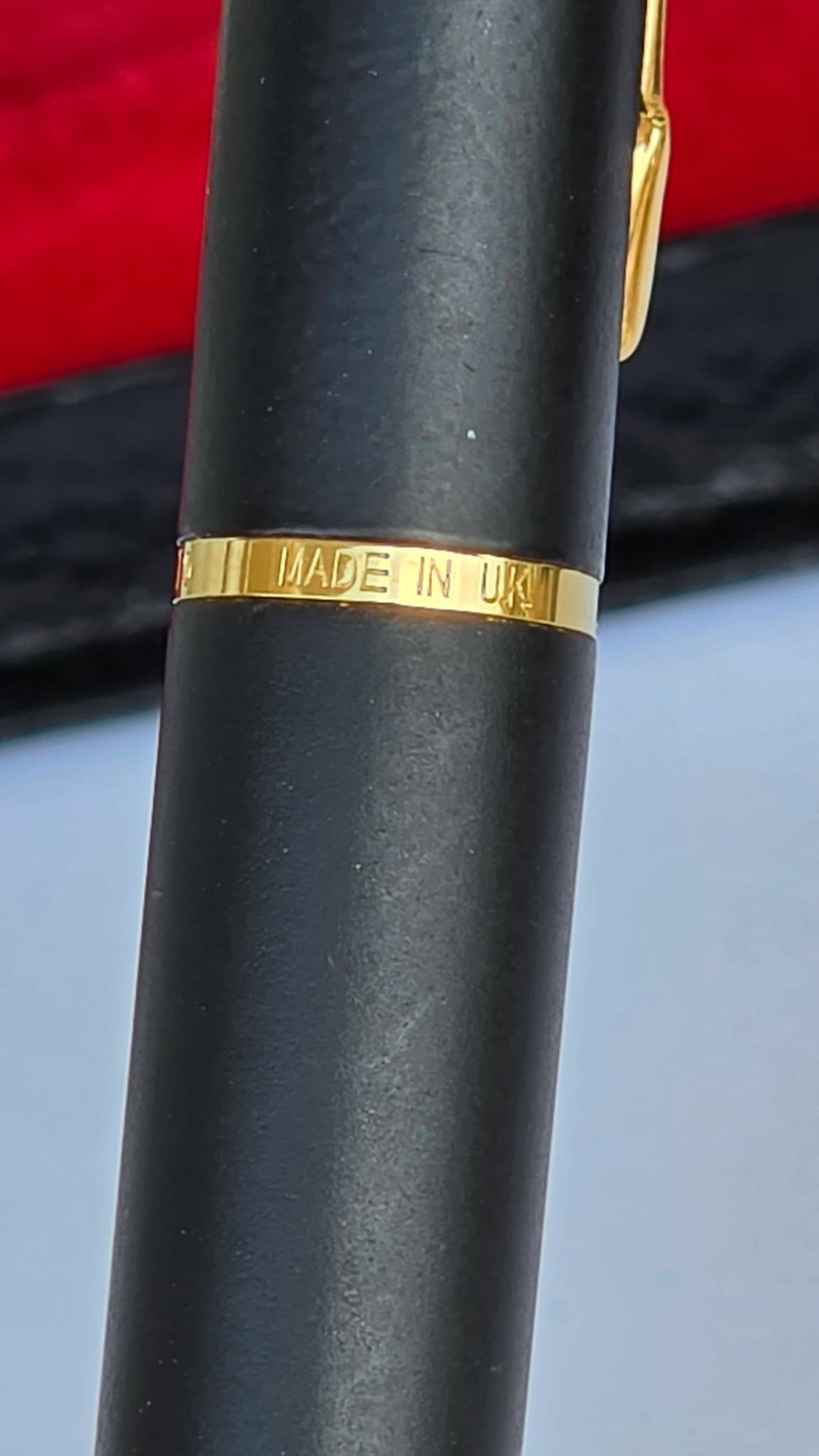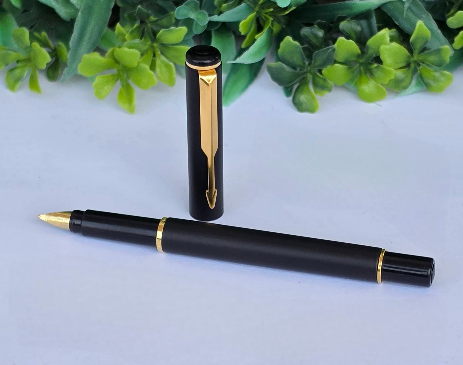 Stilou vintage Parker Rialto, de colecție, cu finisaj negru mat și accente aurite, cu peniță placată cu aur de 23K decorată specific modelului Rialto, în stare foarte bună atât estetic cât și funcțional, cu cutie originală, alimentat cu cartușe de cerneală (anii 1990, UK).