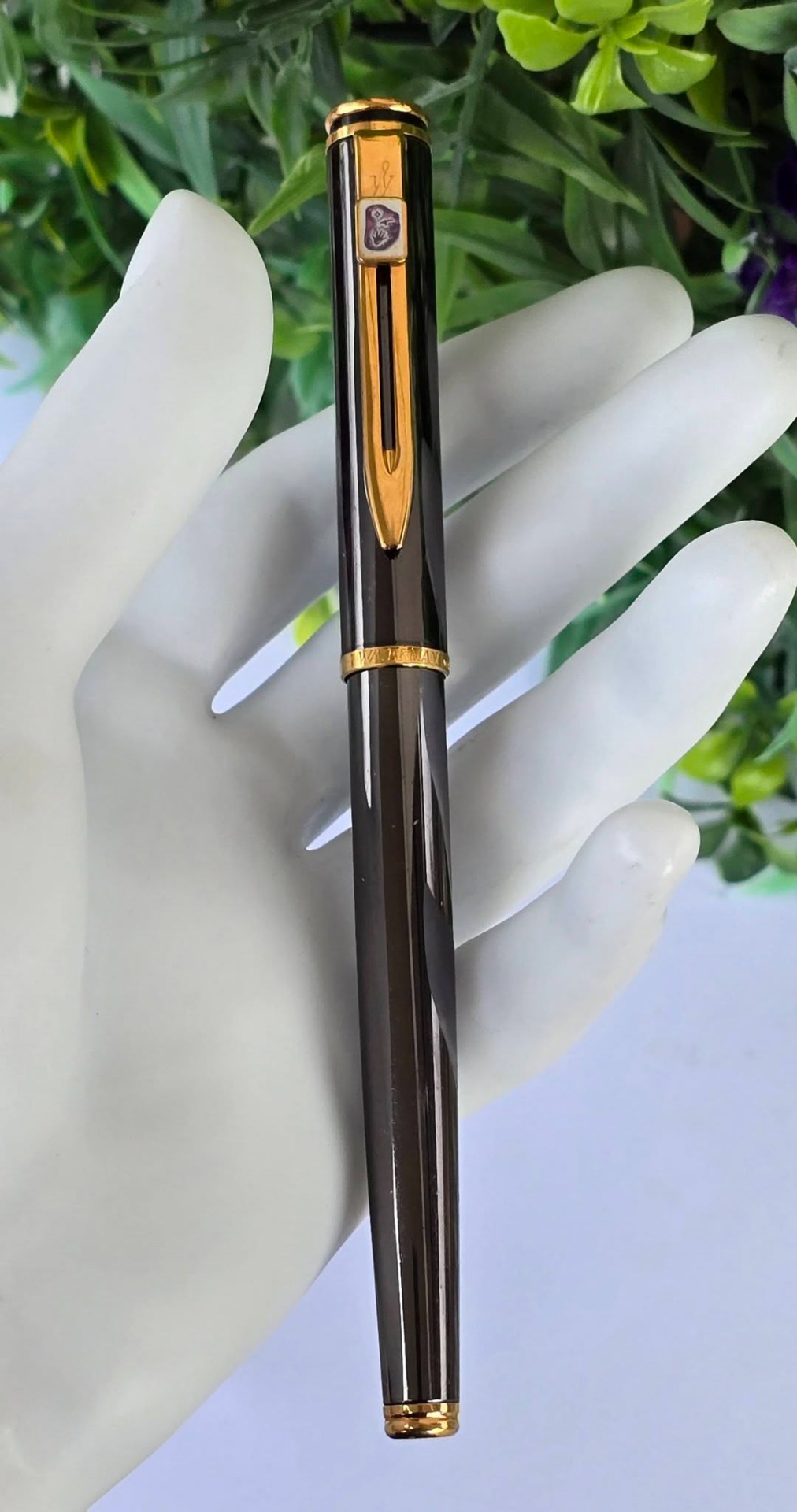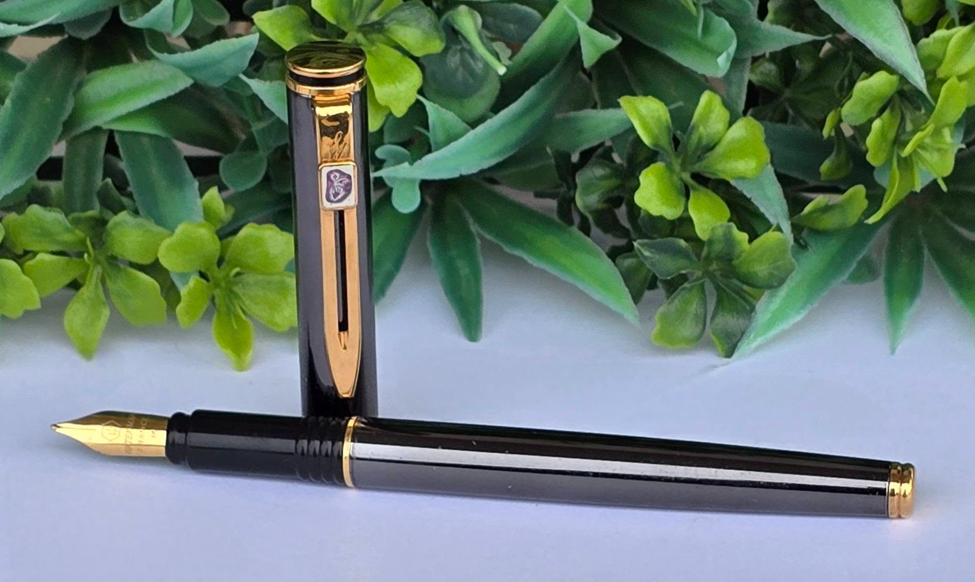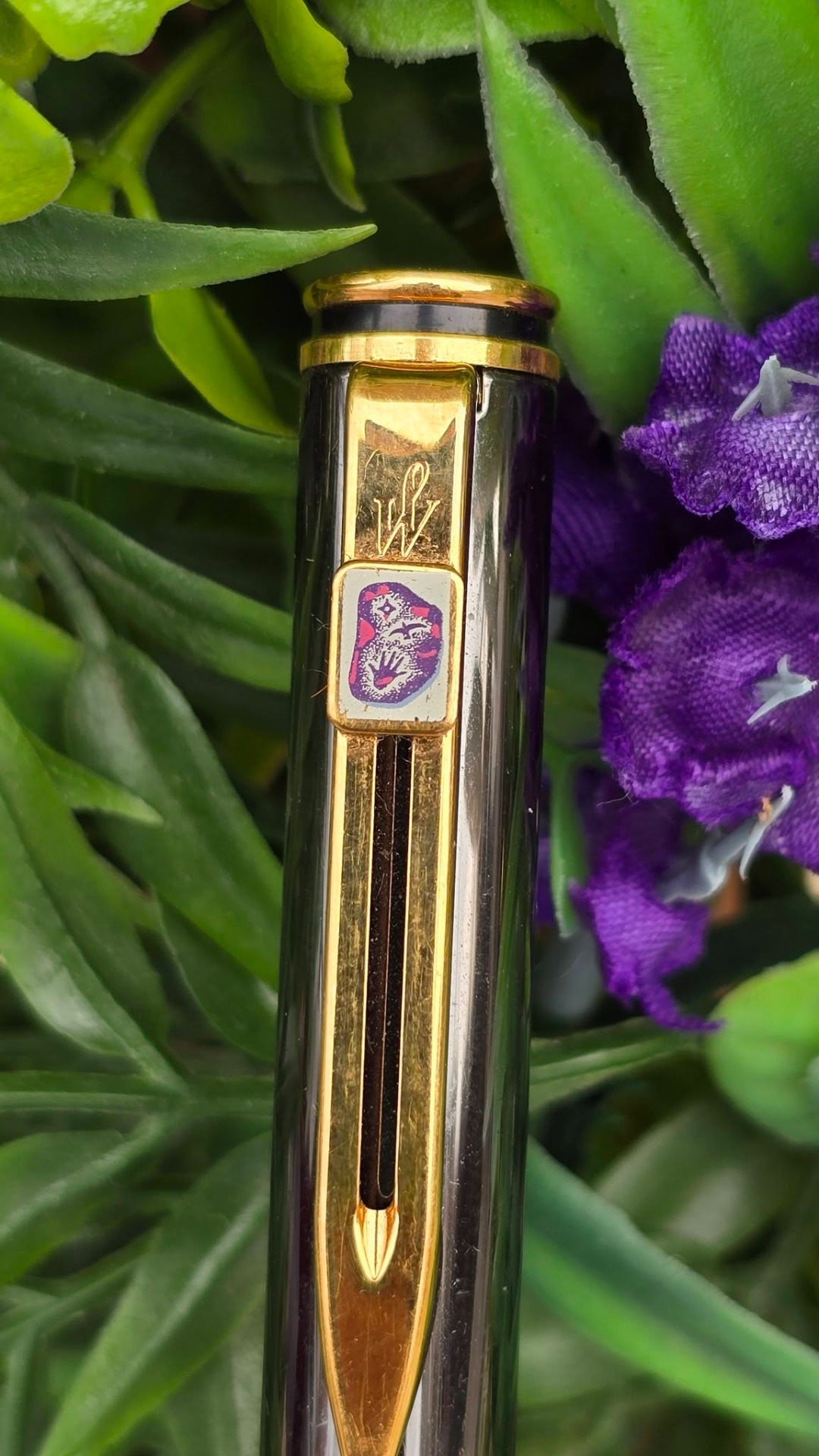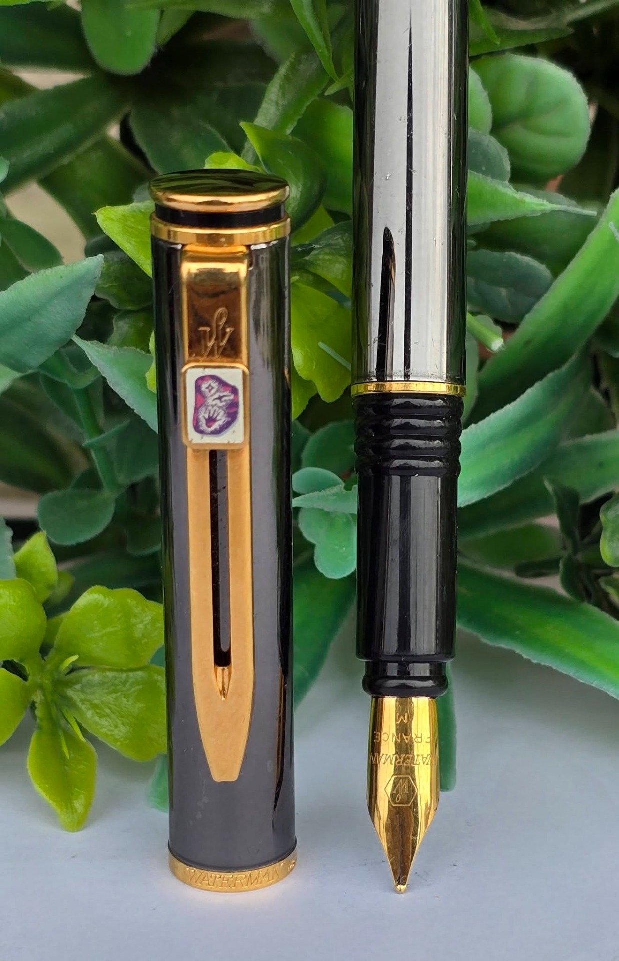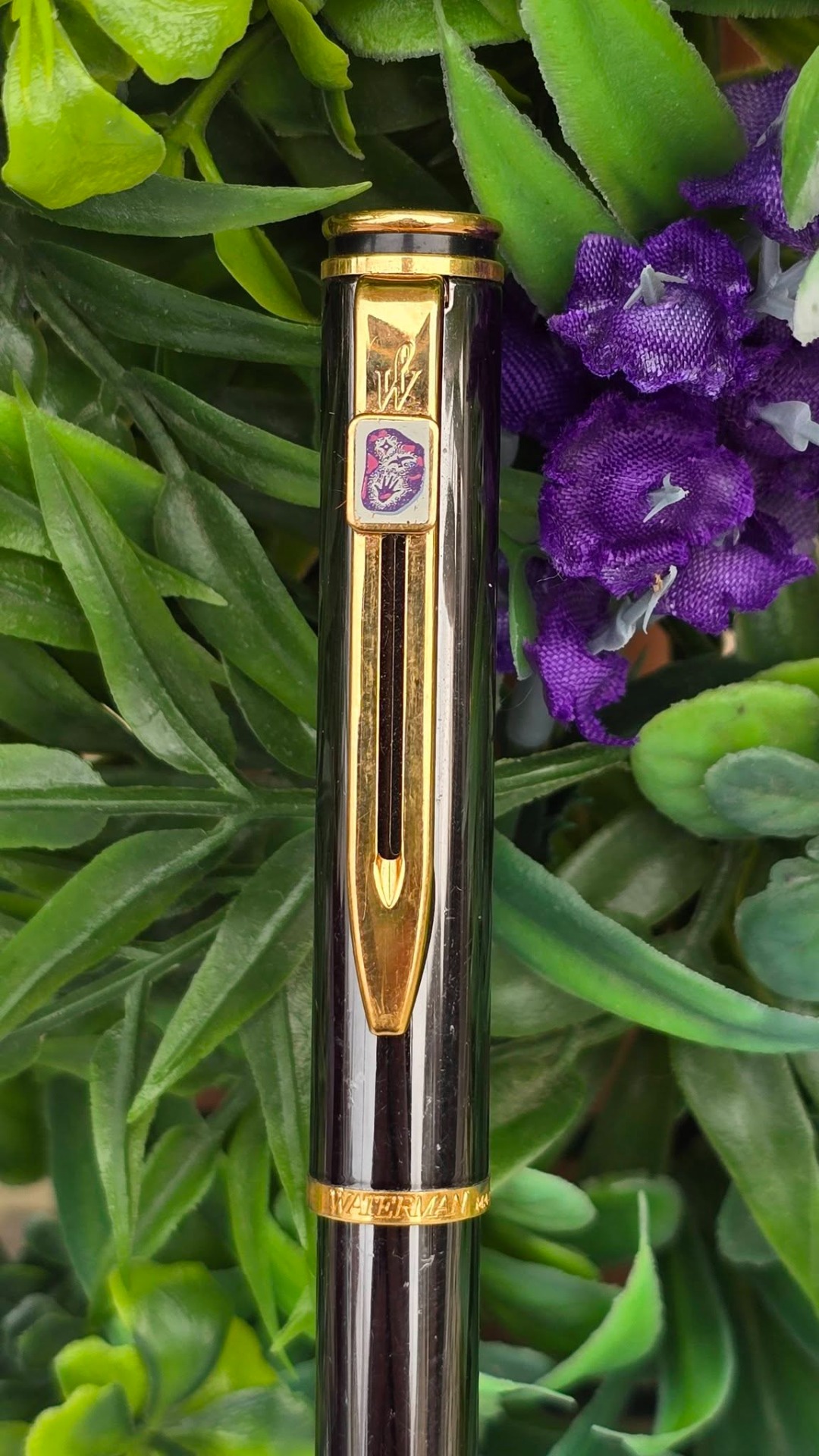 Stilou vintage Waterman Executive Fountain Pen, ediție de colecție specială de protocol "Luxemburg 1995, Capitală Culturală Europeană", cu sigla emailată a evenimentului atașată pe clip, din metal antracit și accente aurite, cu convertor de cerneală original și peniță aurită (1995, Franța).