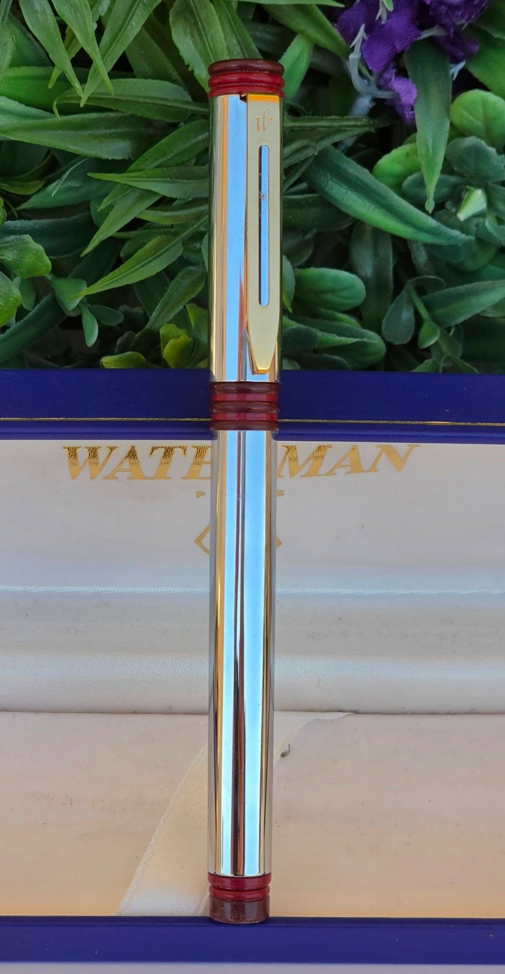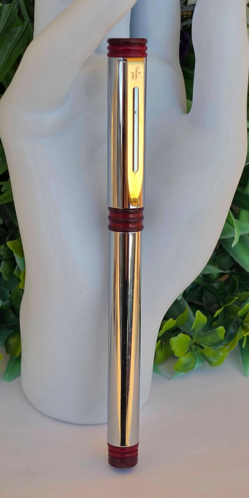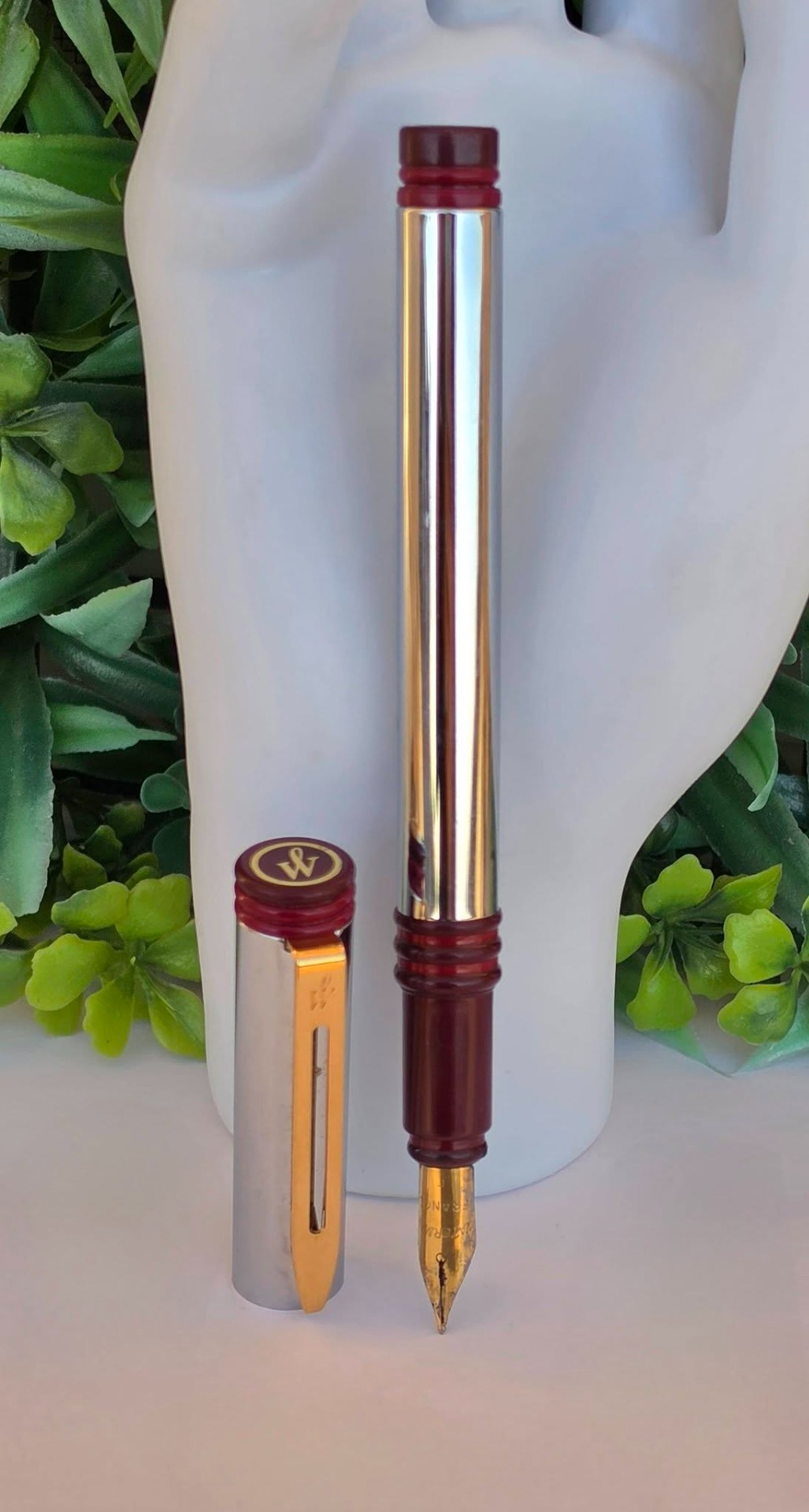 Stilou vintage Waterman Forum Agora Fountain Pen, de colecție, din oțel cromat și accente "burgundy", alimentare cu cartușe de cerneală și peniță din oțel aurit (anii 1990, Franța).