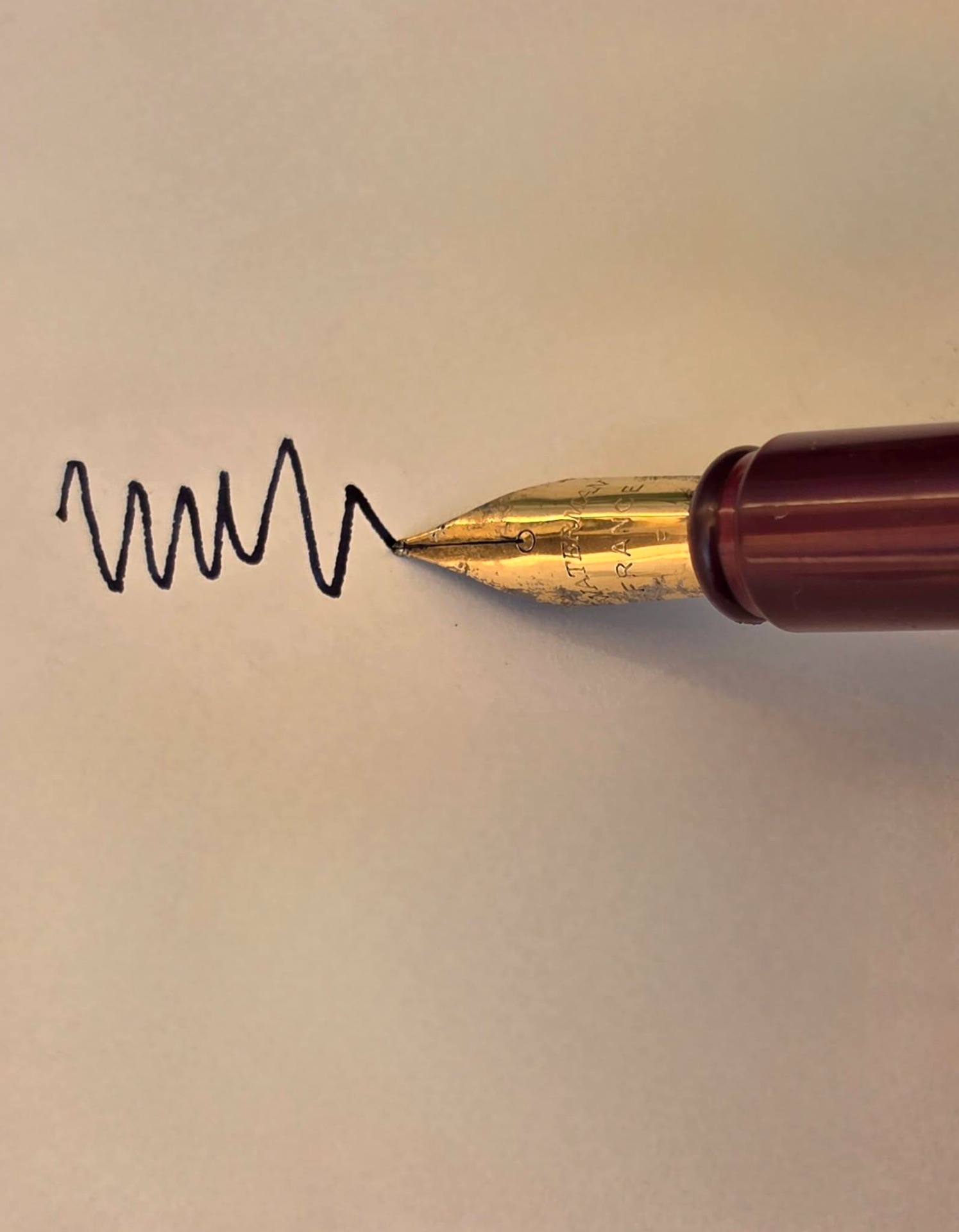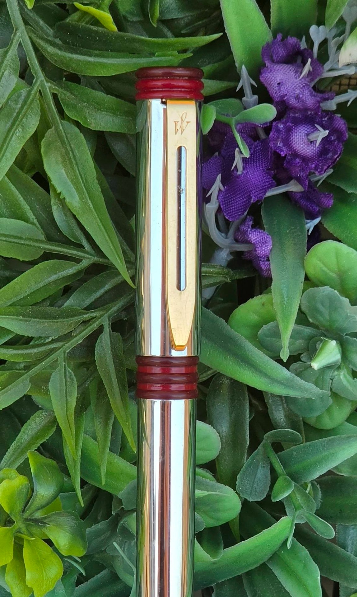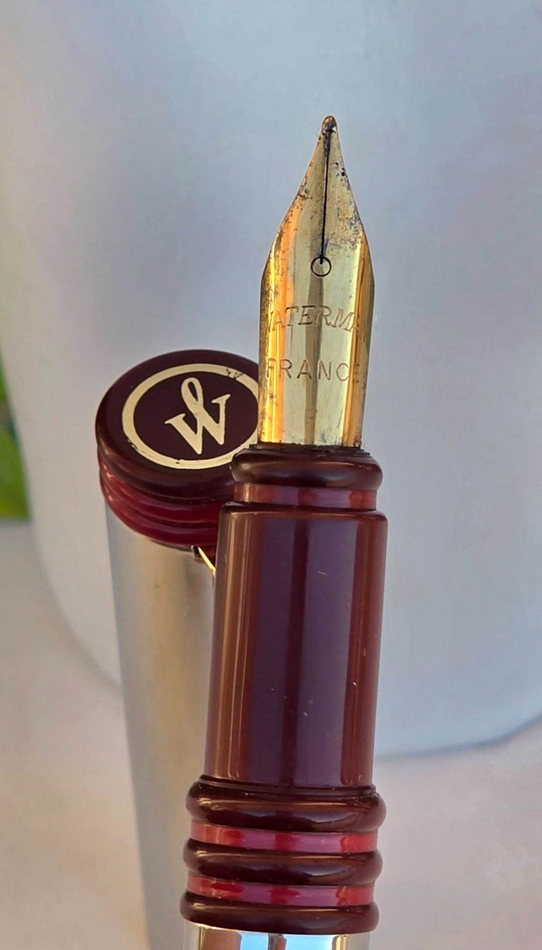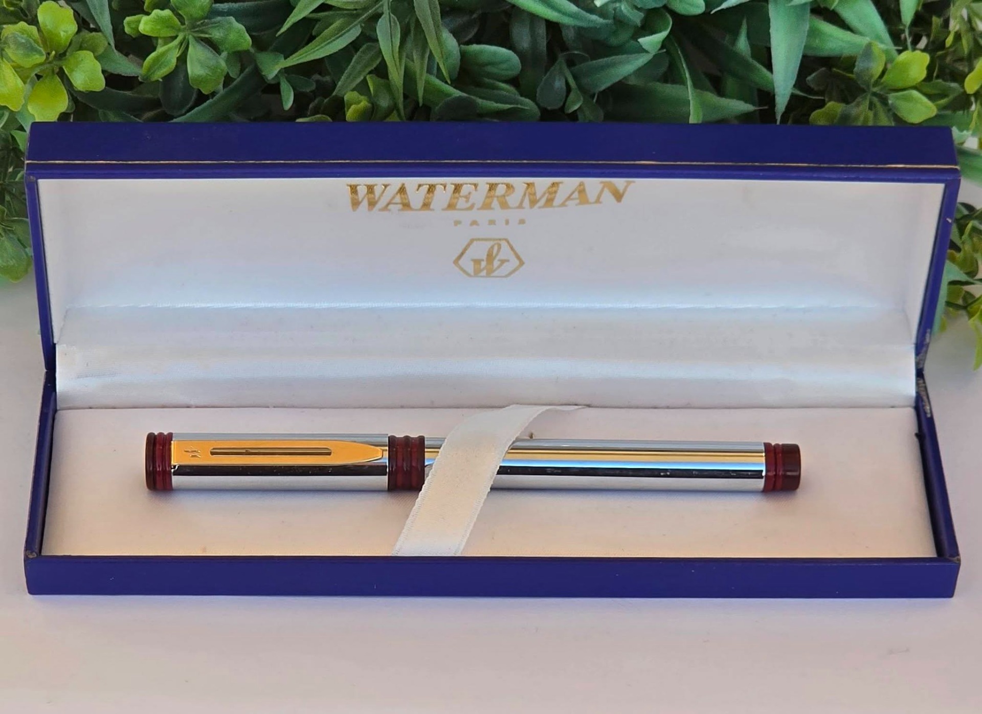 Stilou vintage Waterman Forum Agora Fountain Pen, de colecție, din oțel cromat și accente "burgundy", alimentare cu cartușe de cerneală și peniță din oțel aurit (anii 1990, Franța).