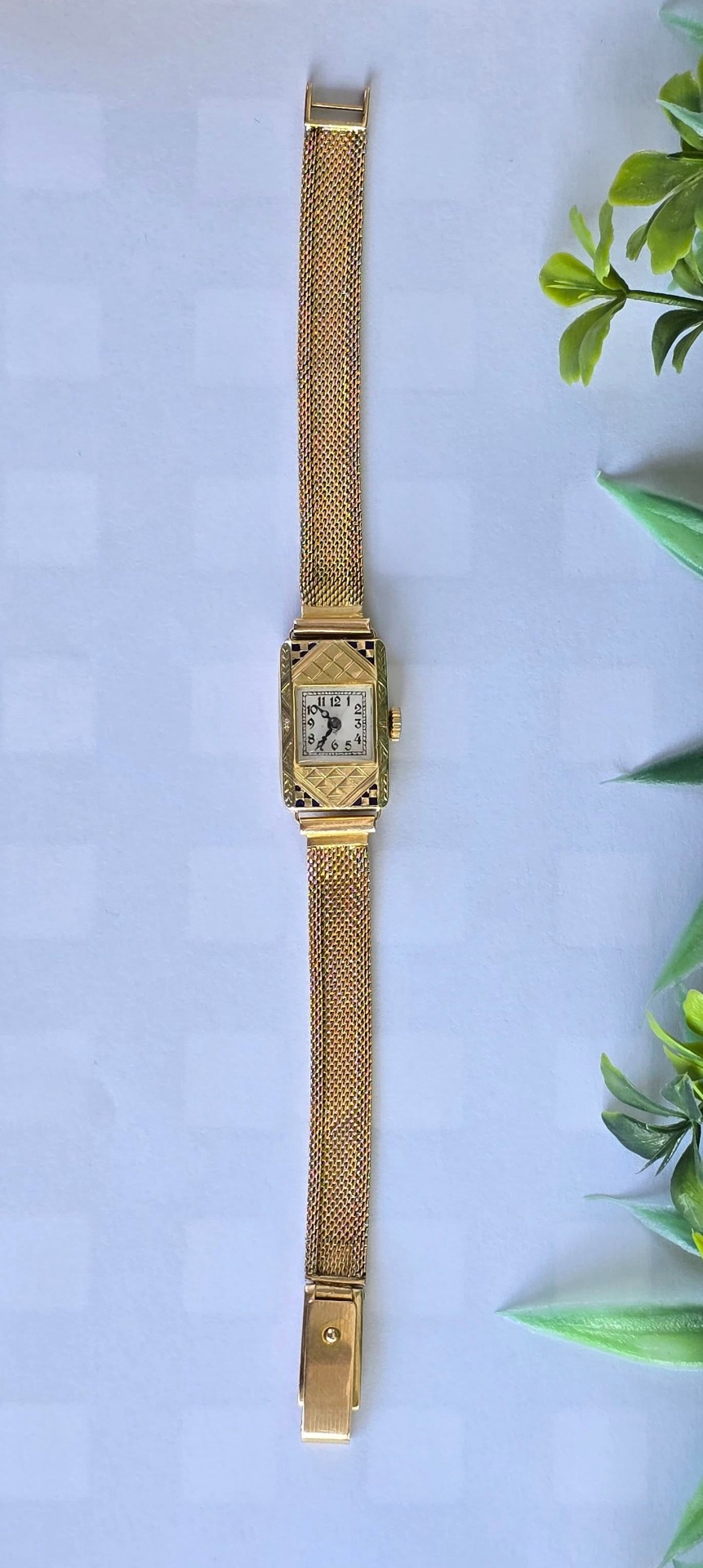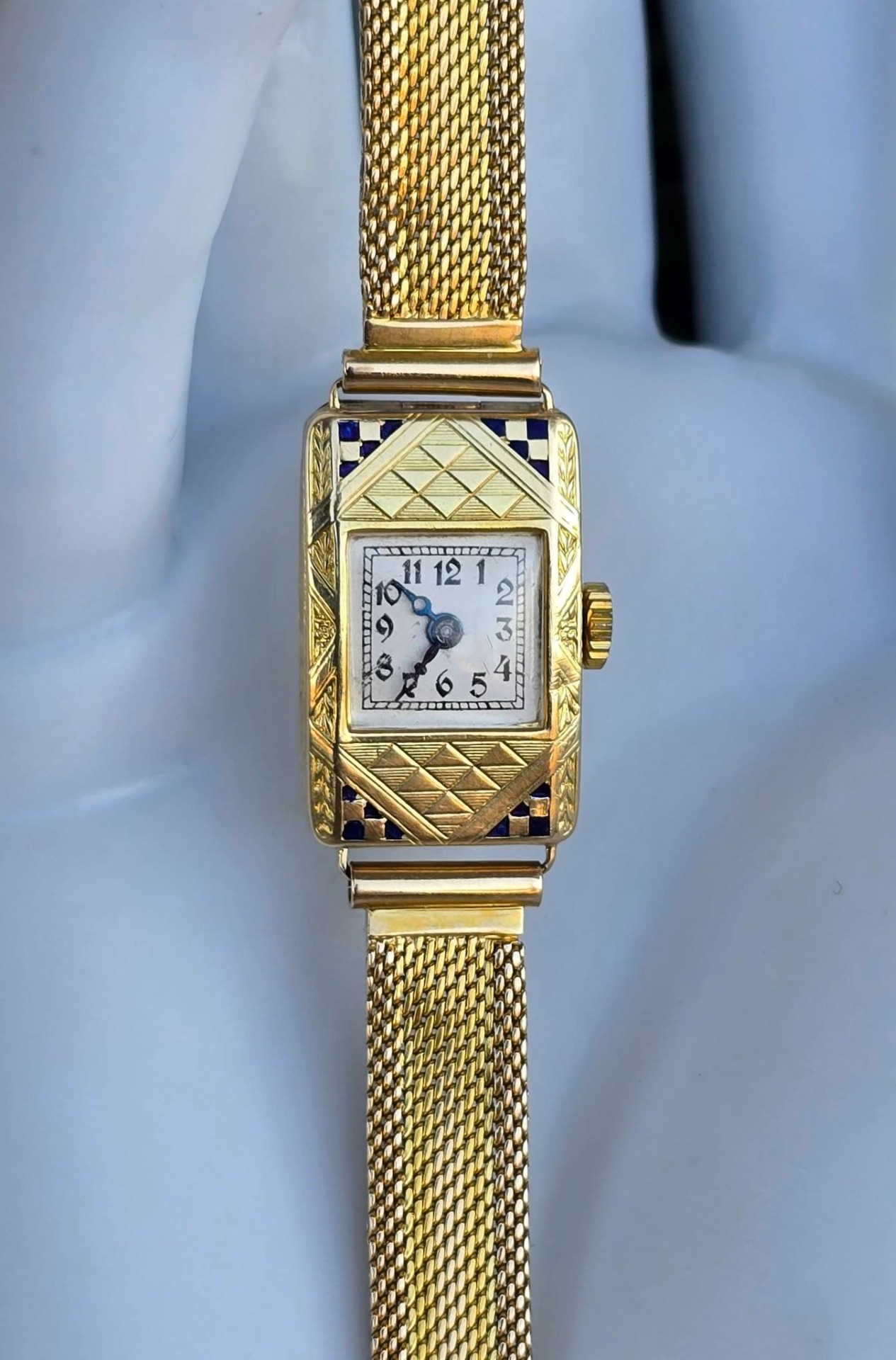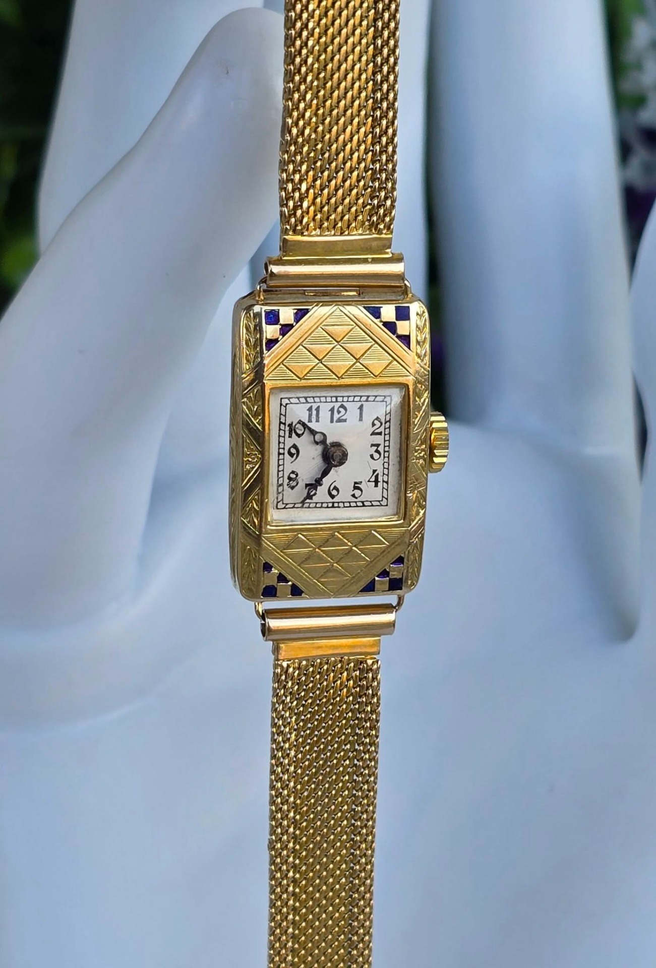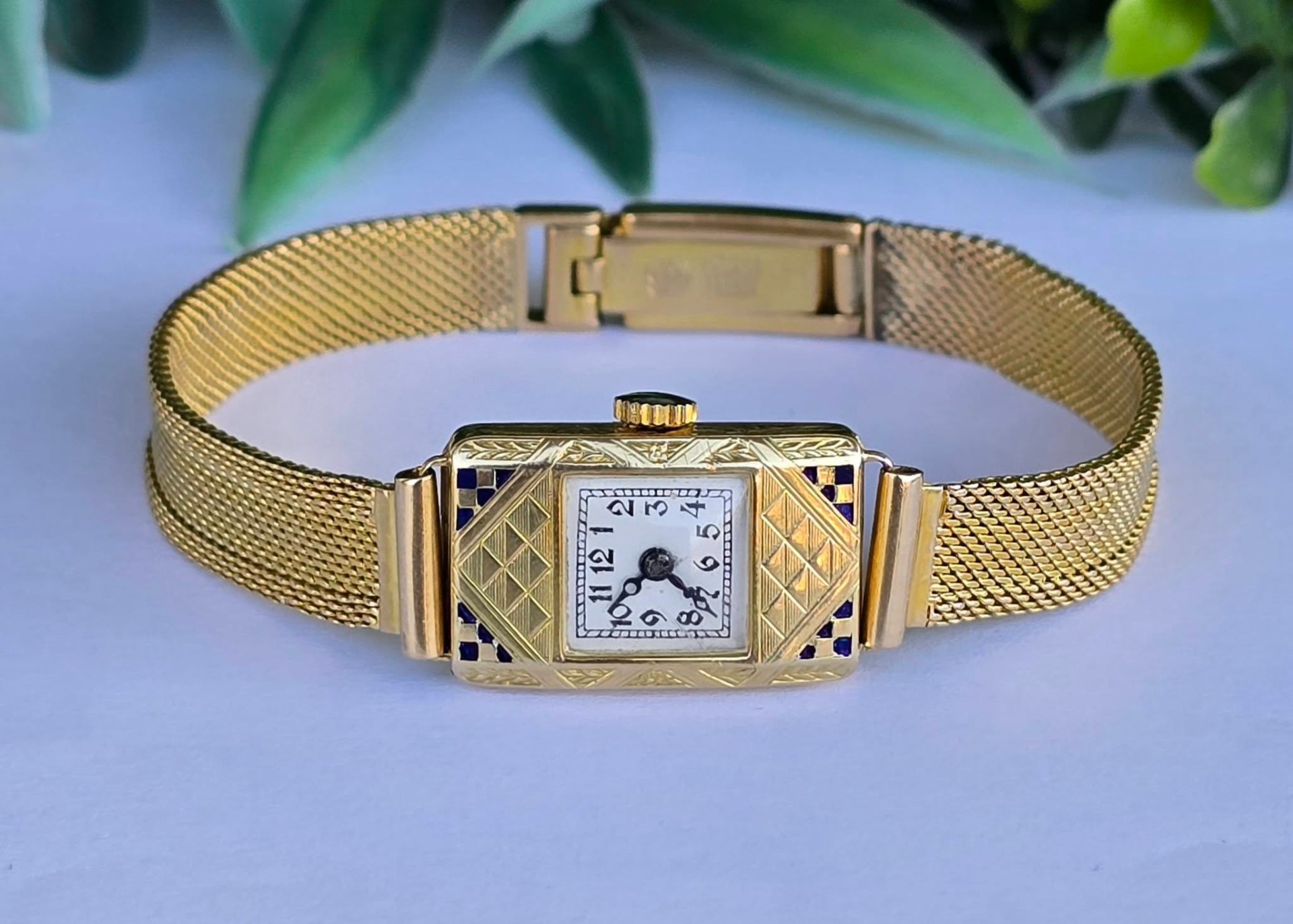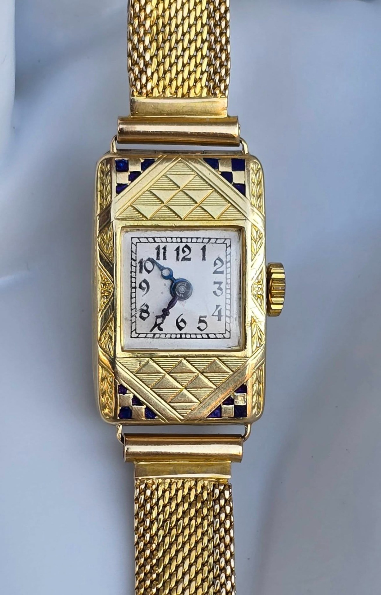 calitatea de piesă de colecție, un "cocktail watch" autentic din perioada Art Deco (1920-1933), cu mecanism elvețian cu armare manuală, 15 jewels, în stare de funcționare, carcasă dreptunghiulară cu gravuri geometrice specifice perioadei și decorațiuni cu email albastru, indicatoare de tip "Breguet" albăstrite și brățară de tip "mesh" (milanaise).
