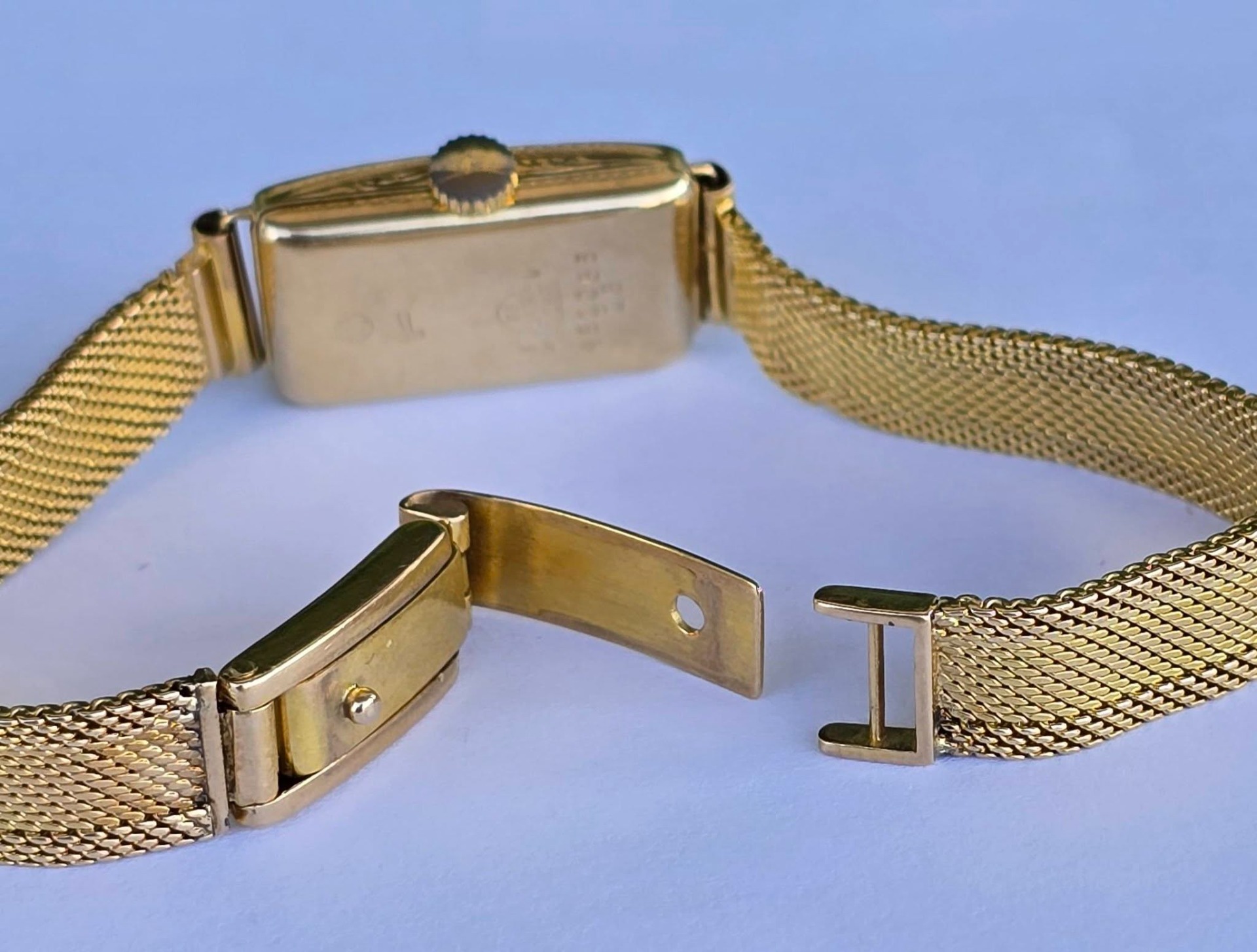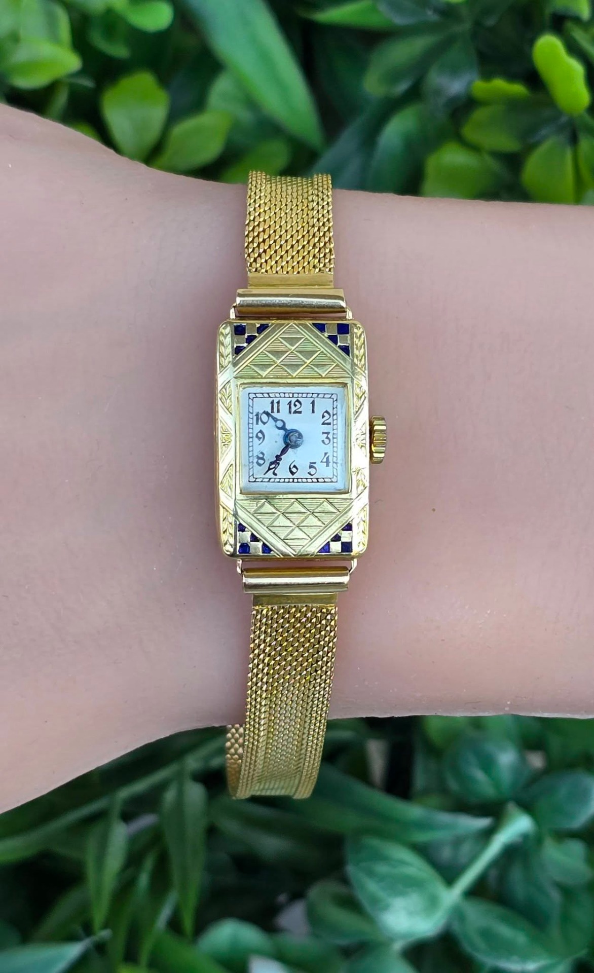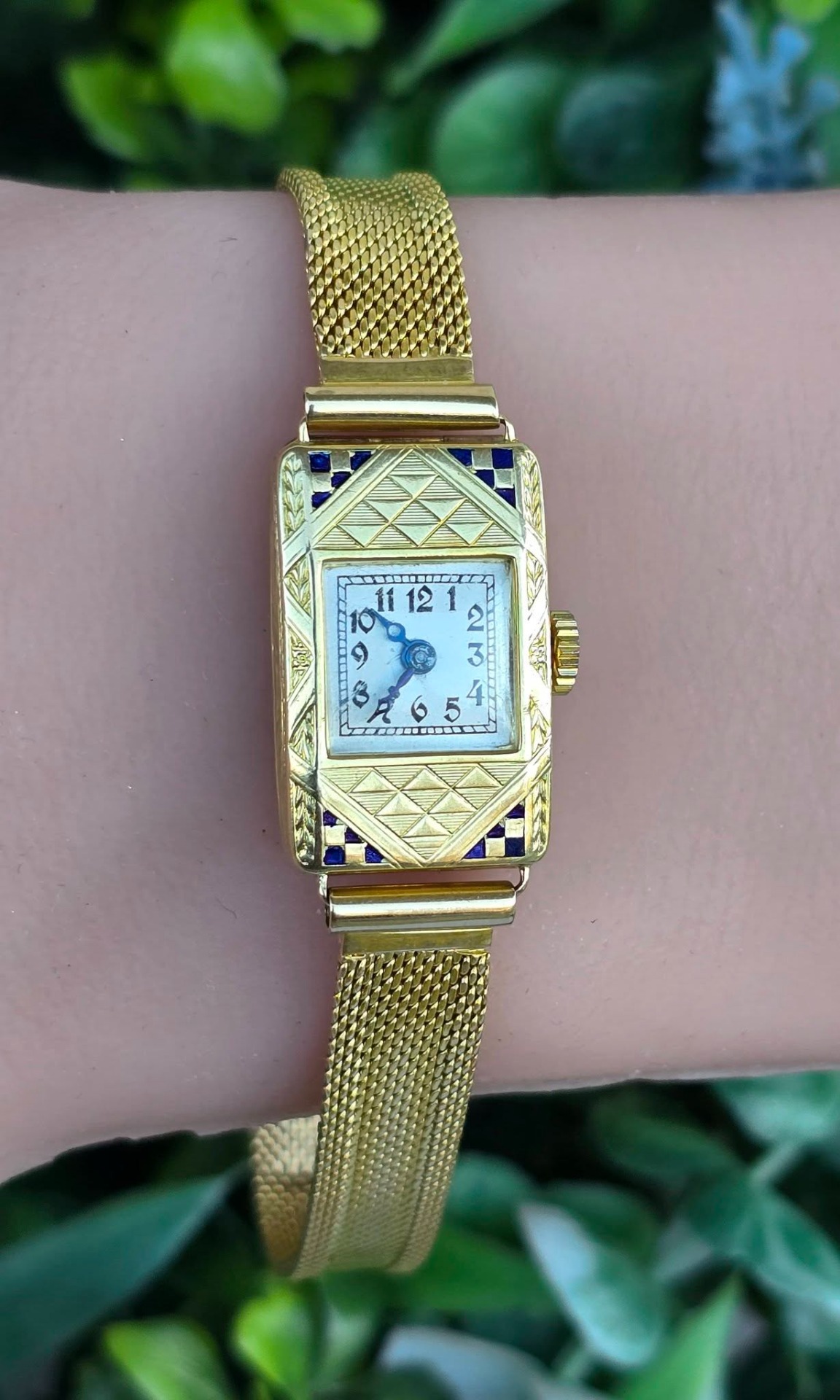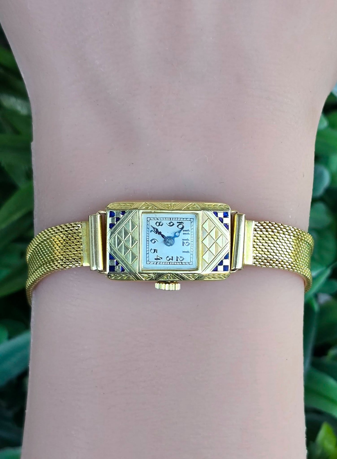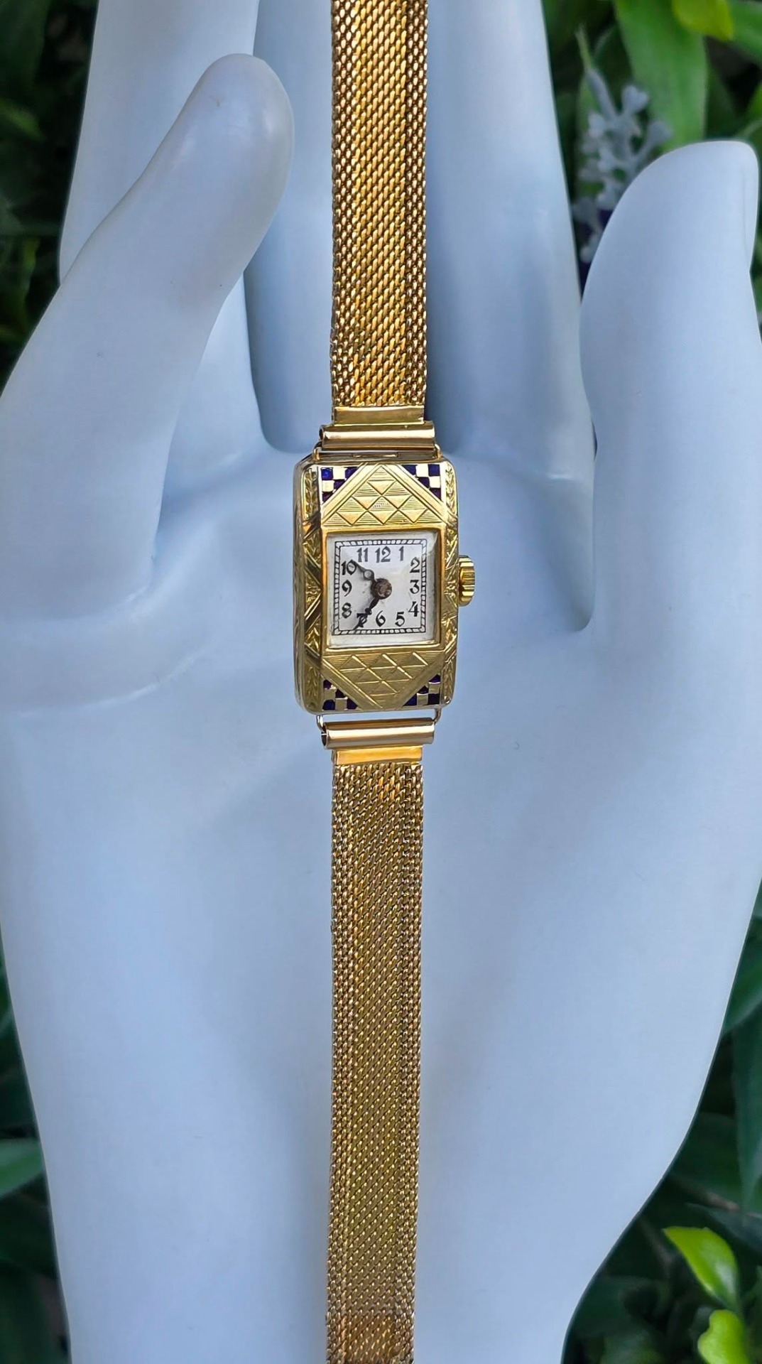 calitatea de piesă de colecție, un "cocktail watch" autentic din perioada Art Deco (1920-1933), cu mecanism elvețian cu armare manuală, 15 jewels, în stare de funcționare, carcasă dreptunghiulară cu gravuri geometrice specifice perioadei și decorațiuni cu email albastru, indicatoare de tip "Breguet" albăstrite și brățară de tip "mesh" (milanaise).
