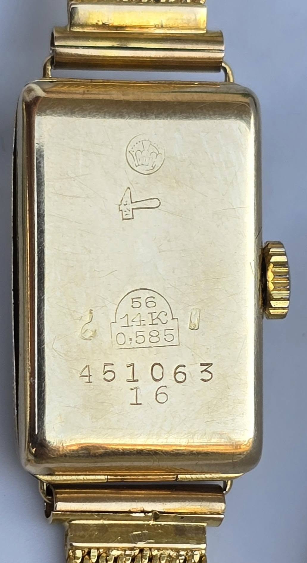 marcajul "veveriței" (Écureuil) este un marcaj elvețian folosit exclusiv pentru aurul de 14K în perioada 1880-1933, marcajul producătorului carcasei ("ciocan #128"), "poinçon de Maître" (marcajul de meșter) al Jung & Cie (Jung & Fils) din La Chaux-de-Fonds, producător de carcase de lux, care a furnizat carcase de aur pentru mărci de prestigiu precum Universal Genève și Zenith și marcajul producătorului brățării (ORBA).