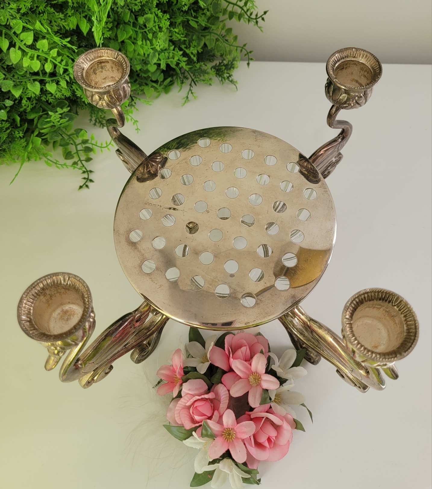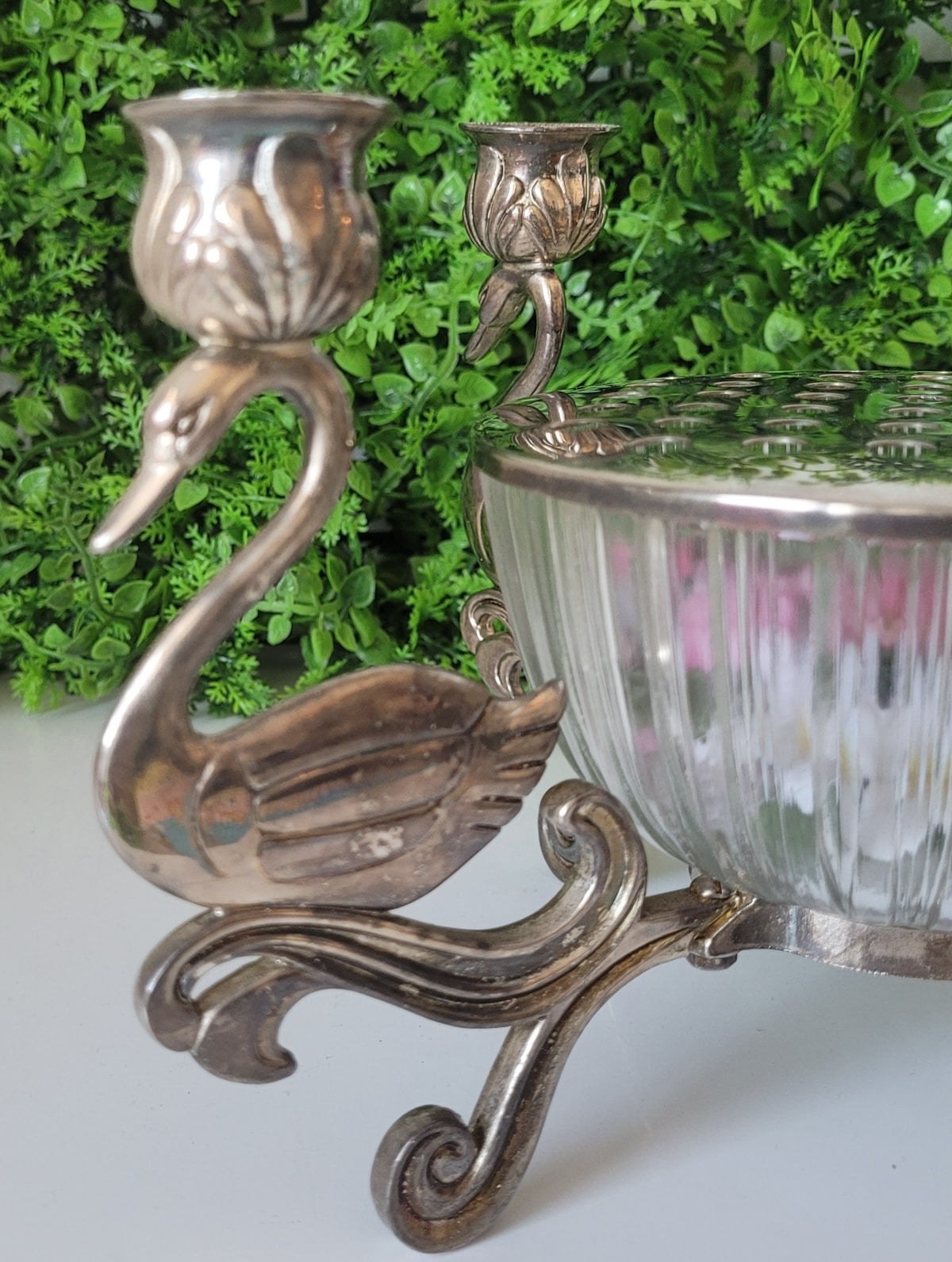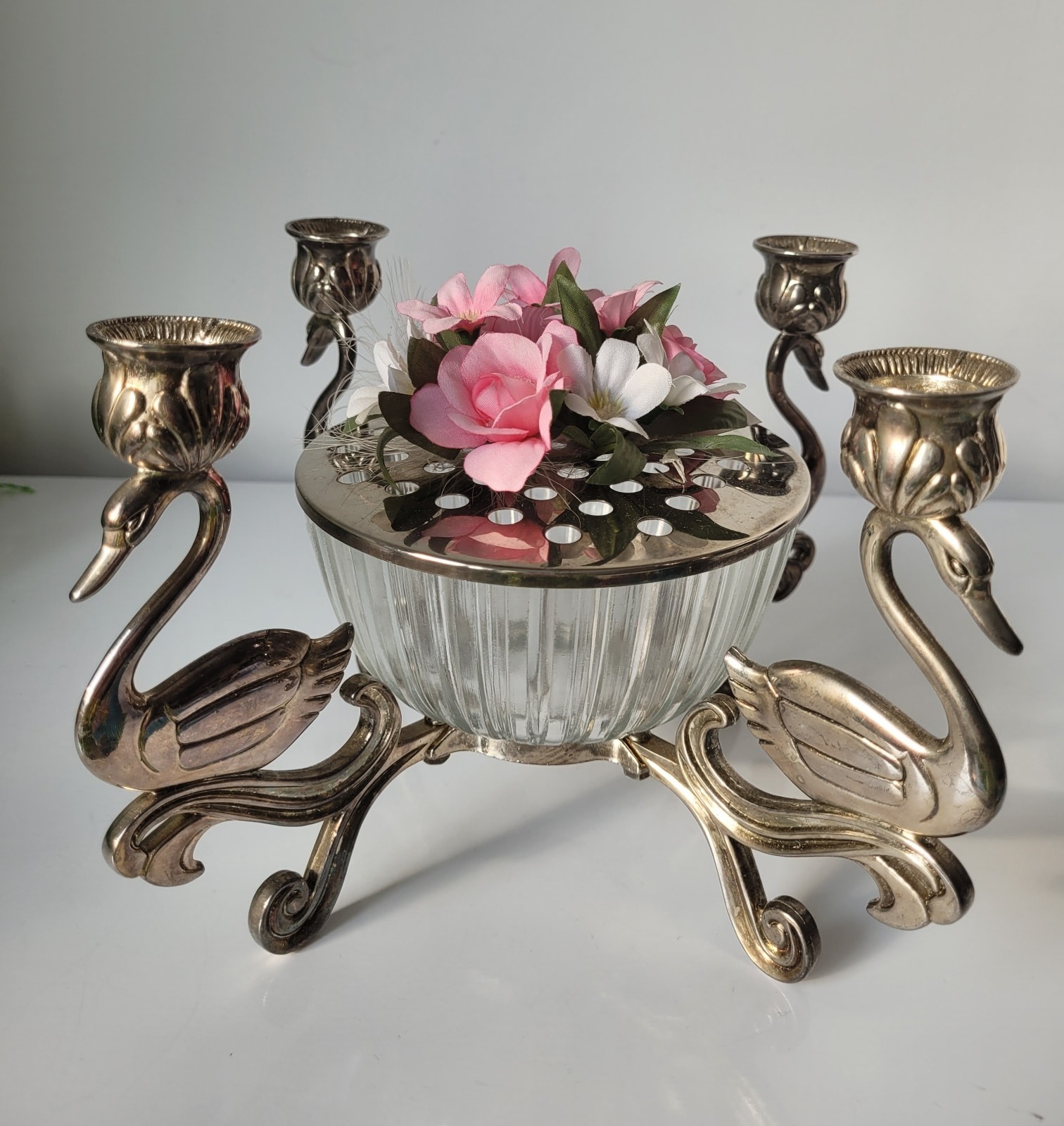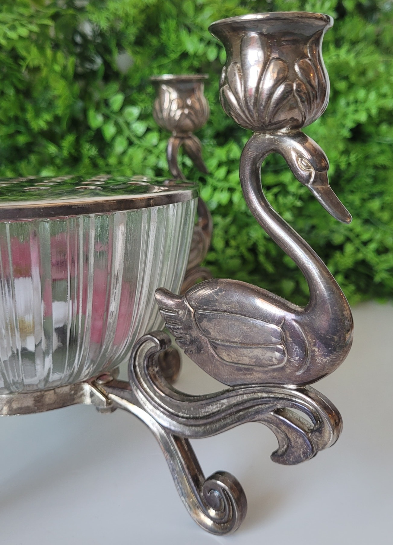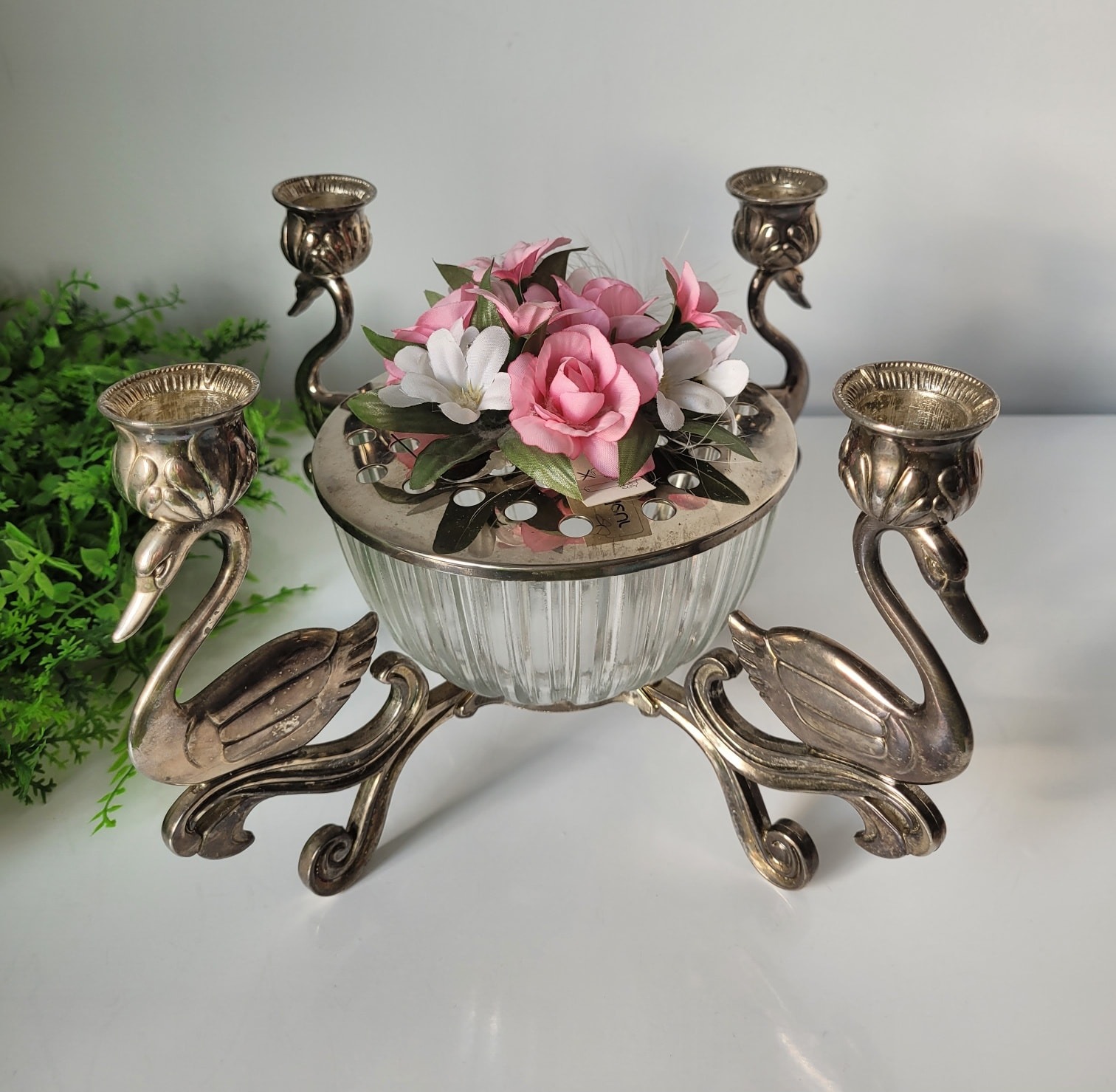 Suport de lumânări din metal argintat, cu 4 brațe în formă de lebede și bol central din sticlă, destinat unui aranjament floral, cu capac perforat pentru