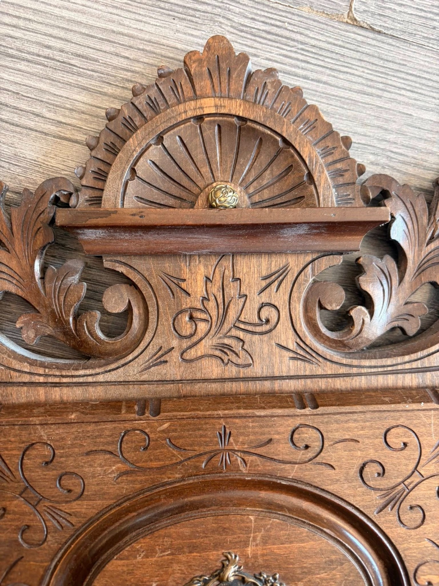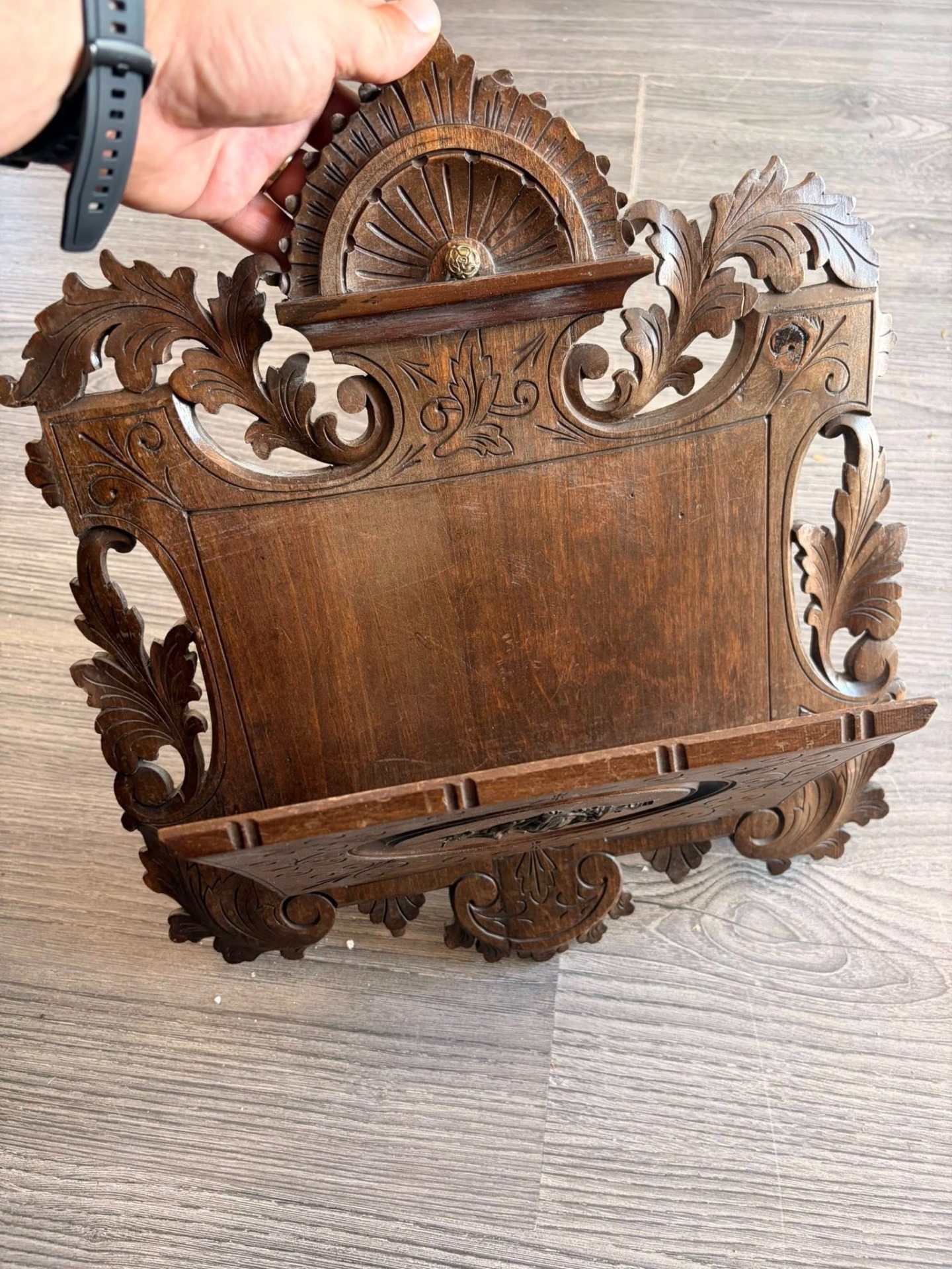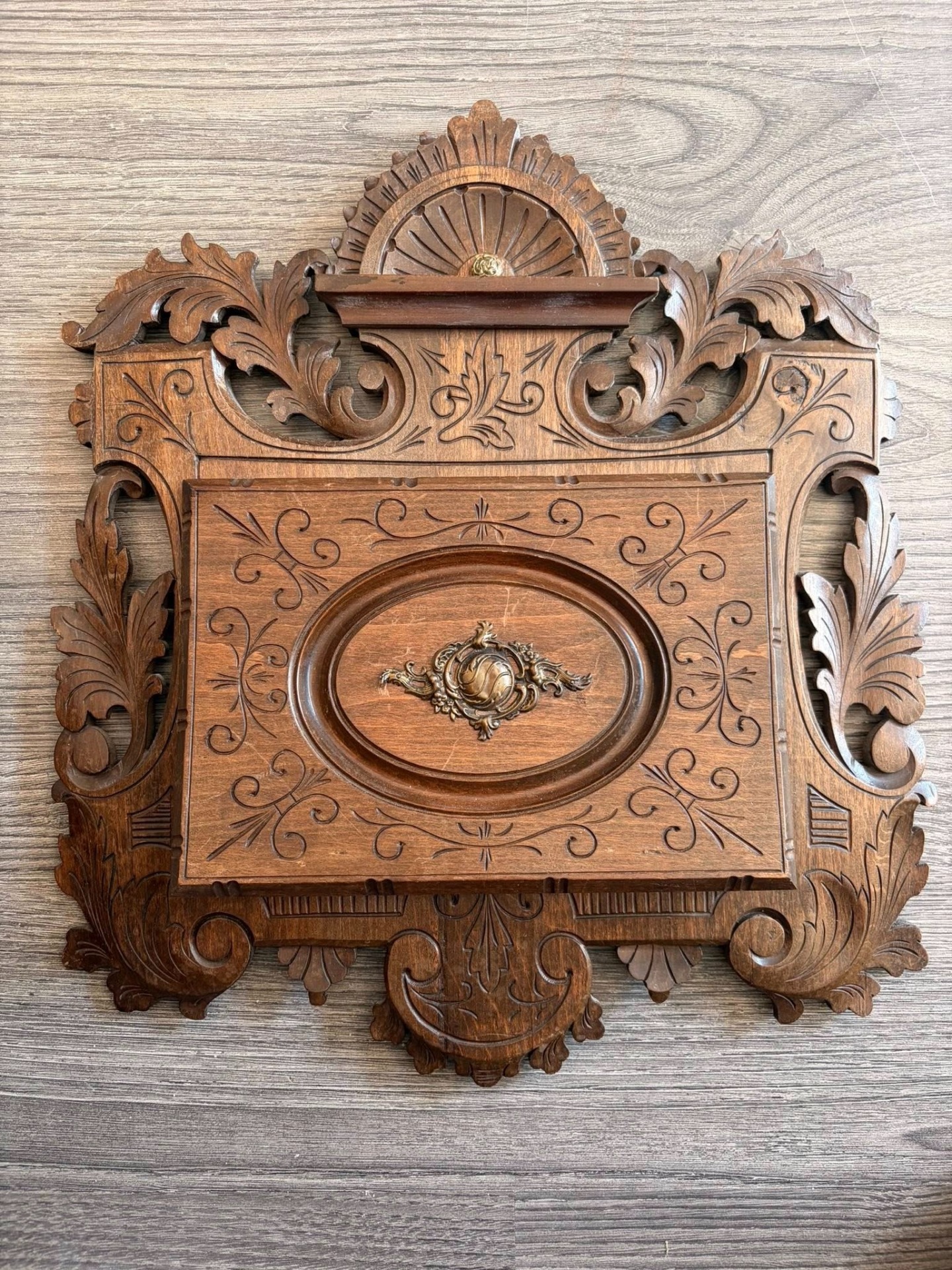 600 lei — Suport de scrisori victorian din lemn sculptat manual, cu detalii florale și ornament central din bronz. Piesă elegantă, realizată din lemn masiv, ideală