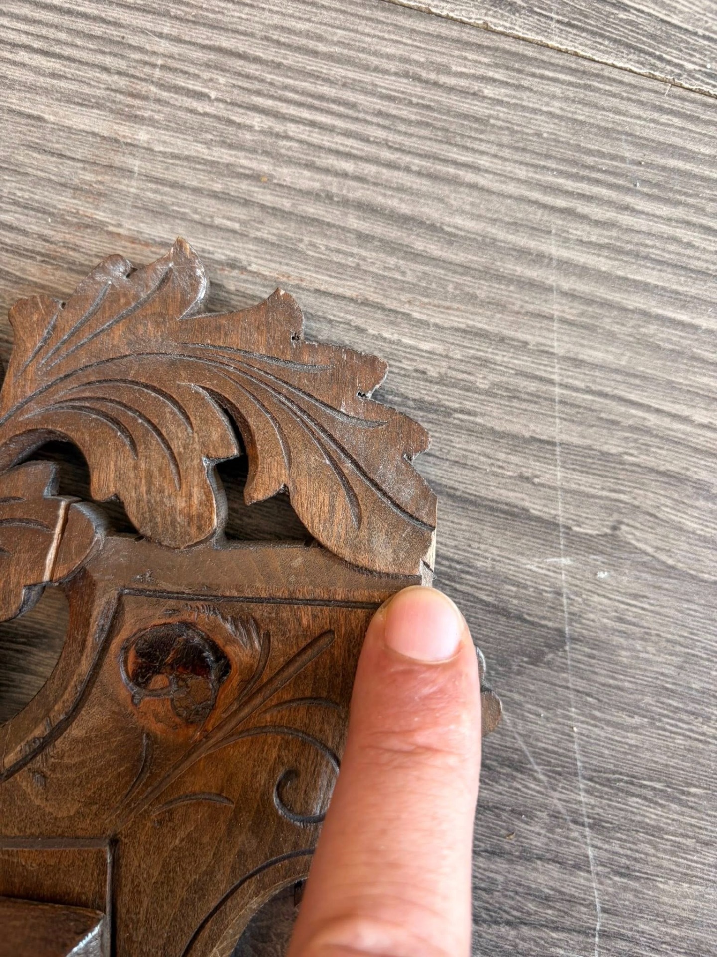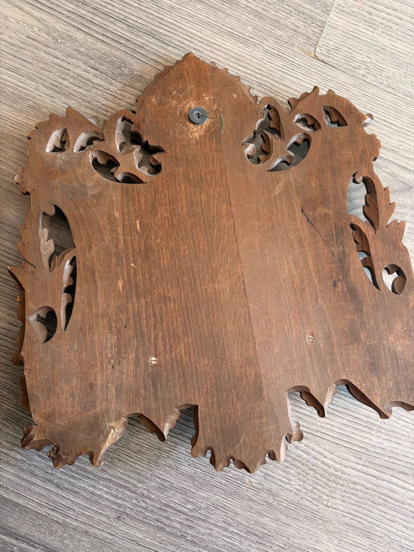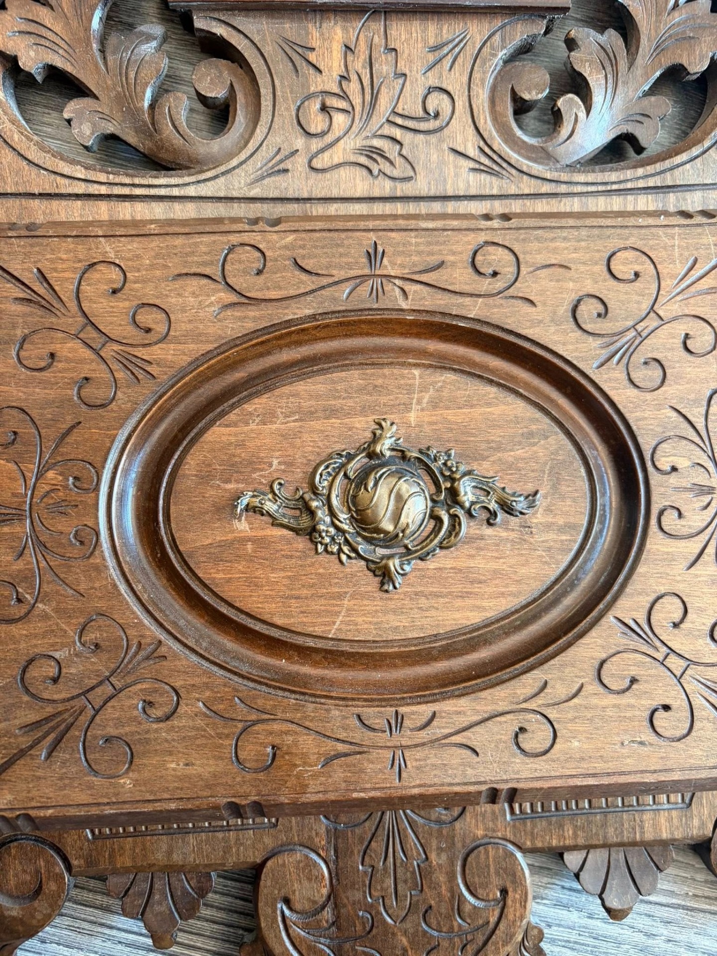 600 lei — Suport de scrisori victorian din lemn sculptat manual, cu detalii florale și ornament central din bronz. Piesă elegantă, realizată din lemn masiv, ideală
