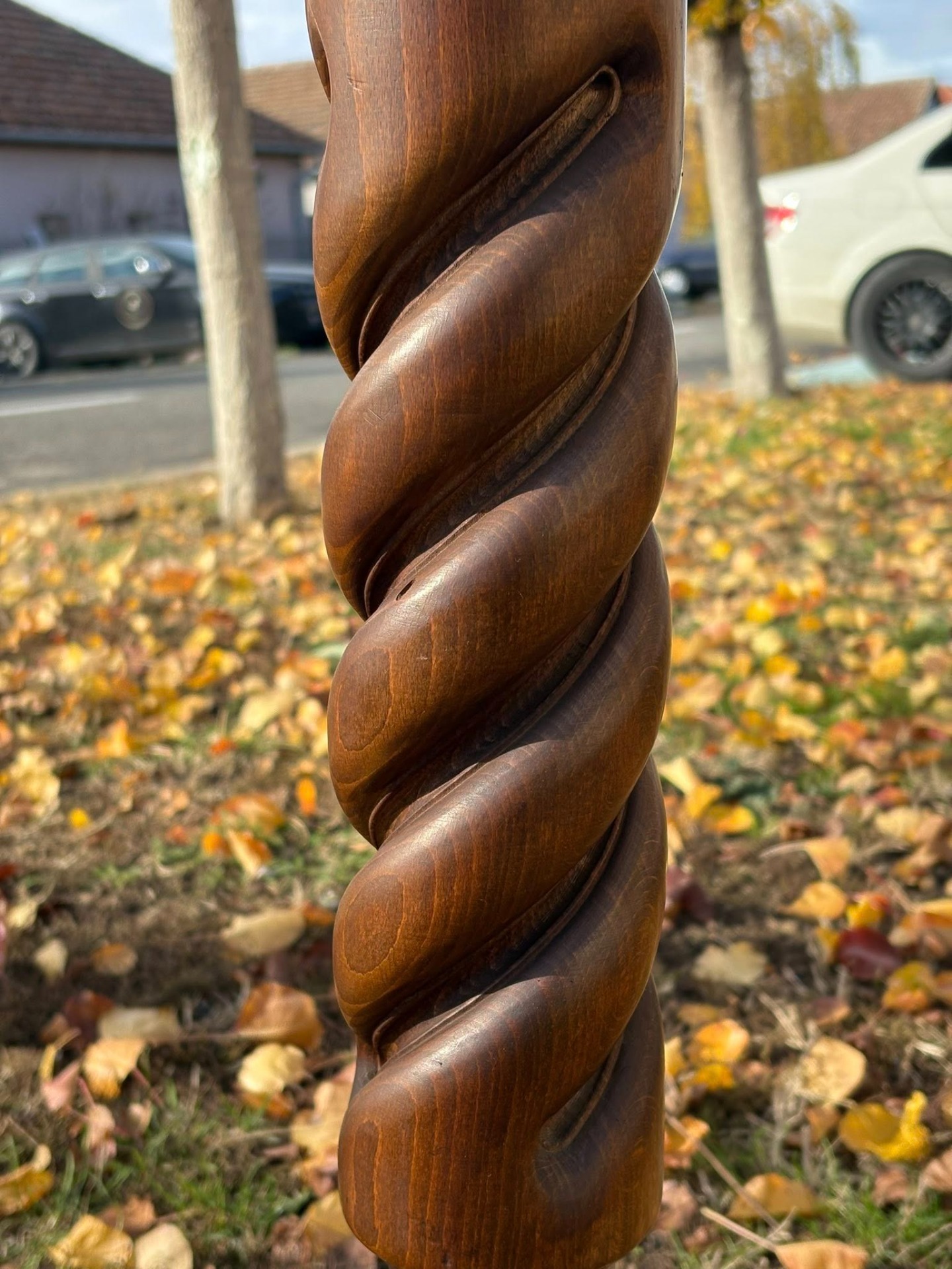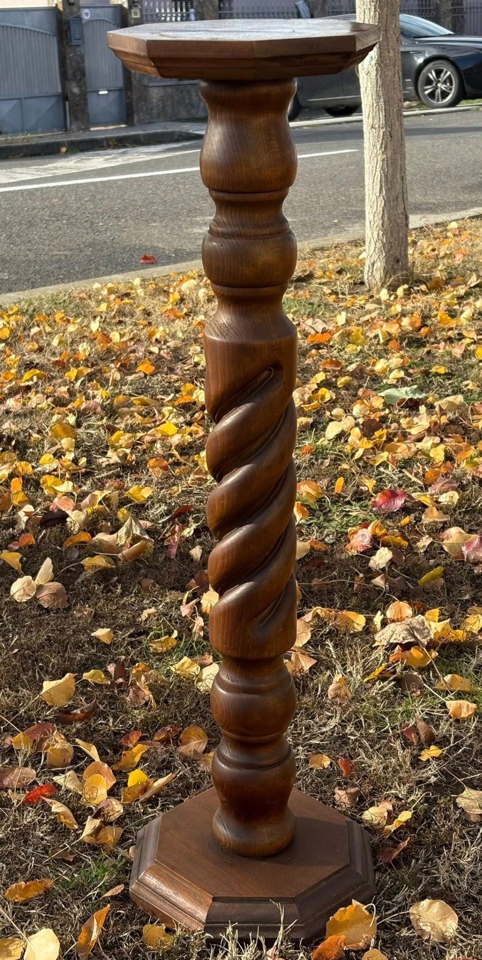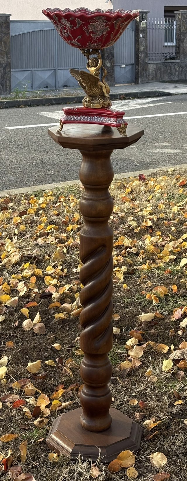 Suport decorativ din lemn masiv, realizat în stil clasic, cu picior sculptat în formă de spirală (model „twist”).