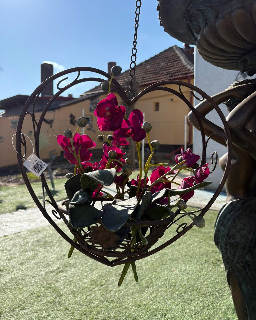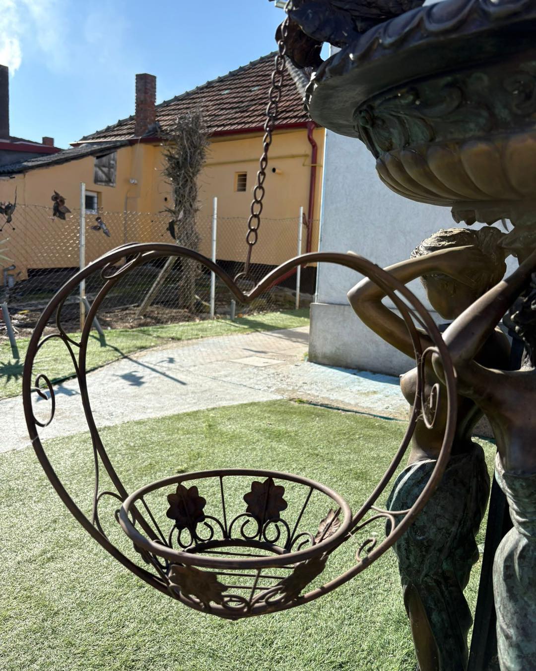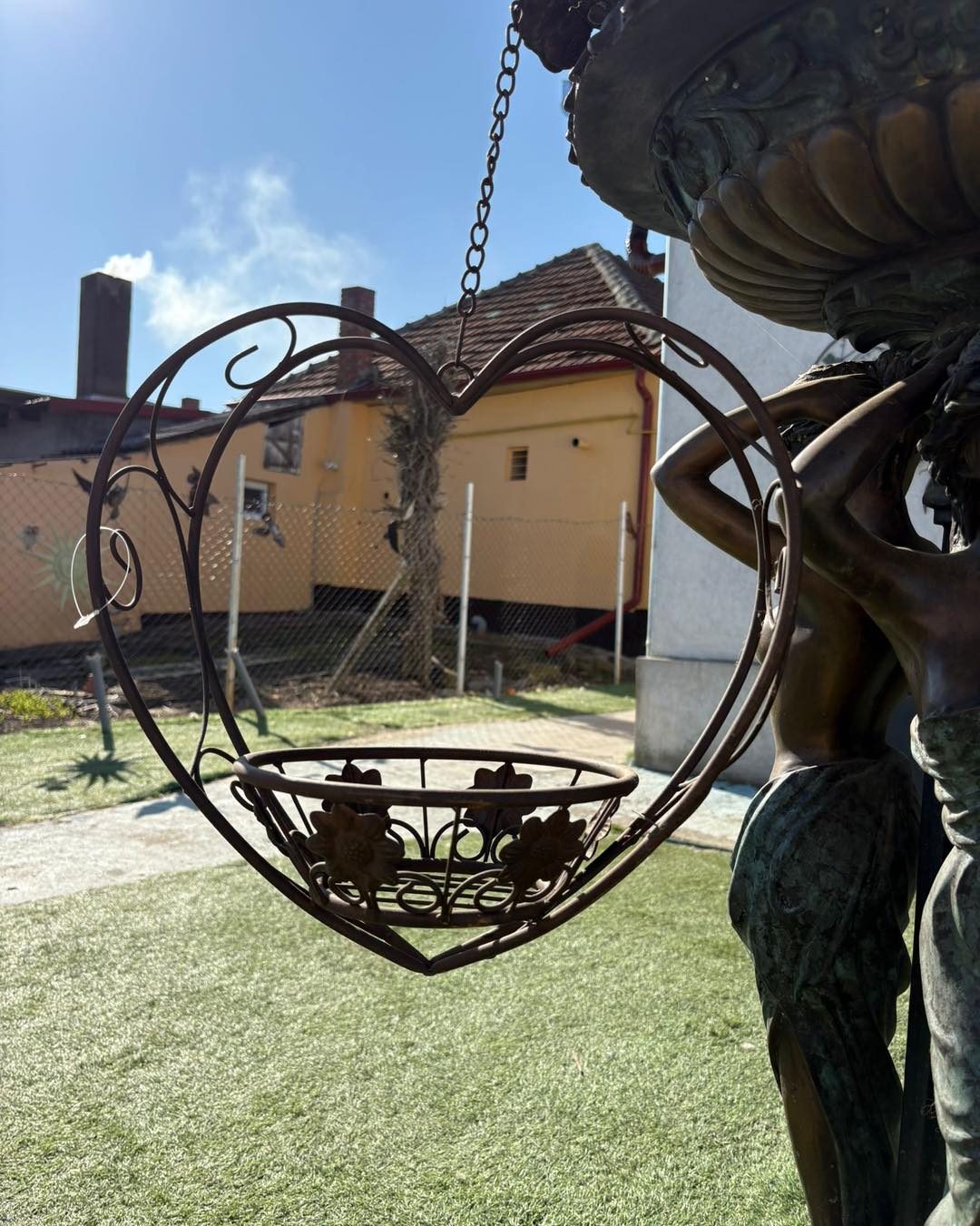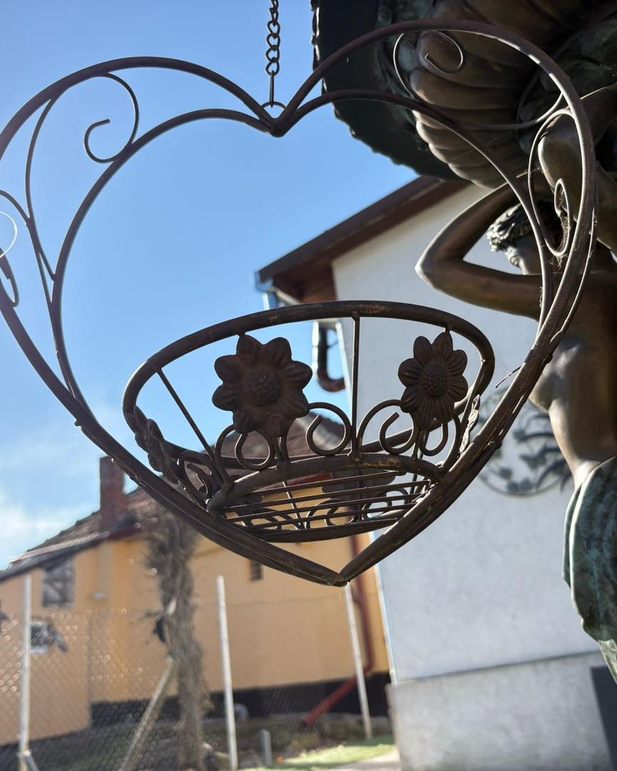 Piesa este suspendată cu lanț și are un suport rotund ornamentat, ideal pentru ghivece cu flori sau aranjamente decorative.