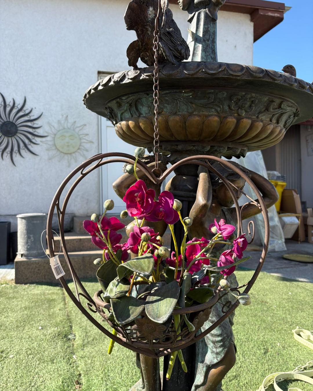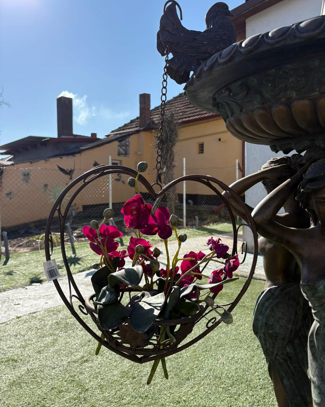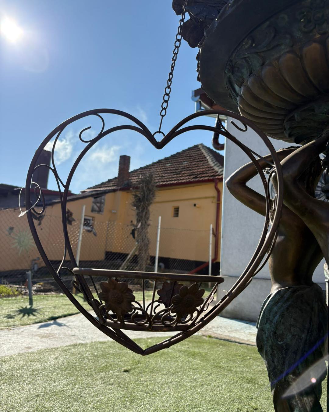 Piesa este suspendată cu lanț și are un suport rotund ornamentat, ideal pentru ghivece cu flori sau aranjamente decorative.