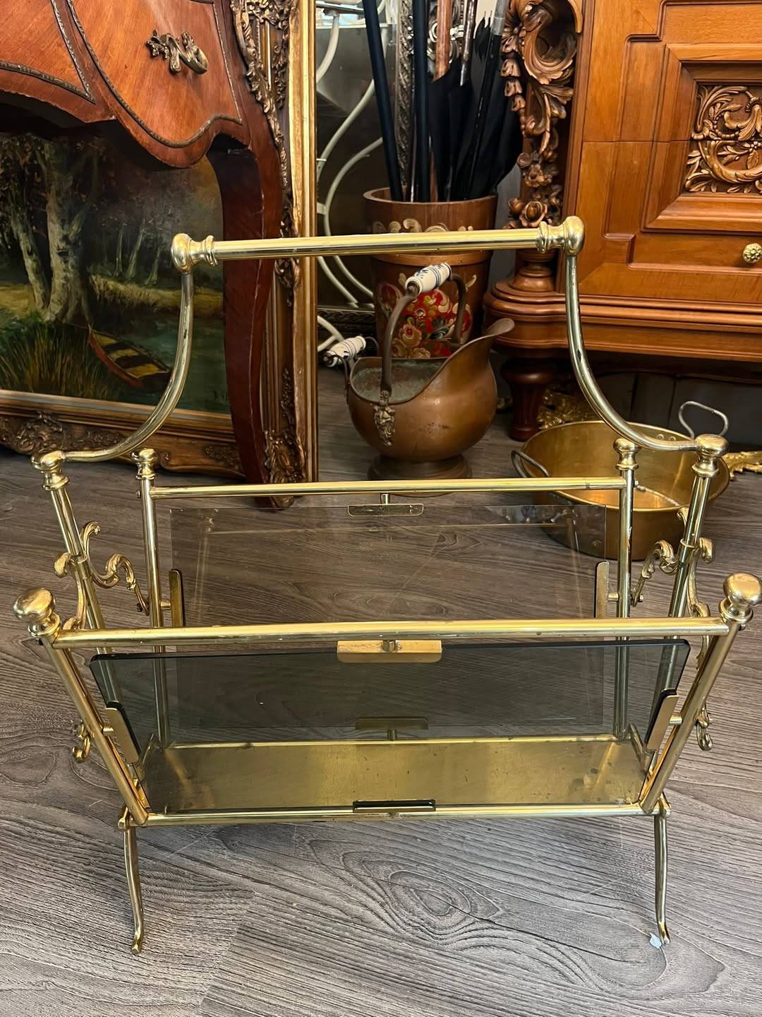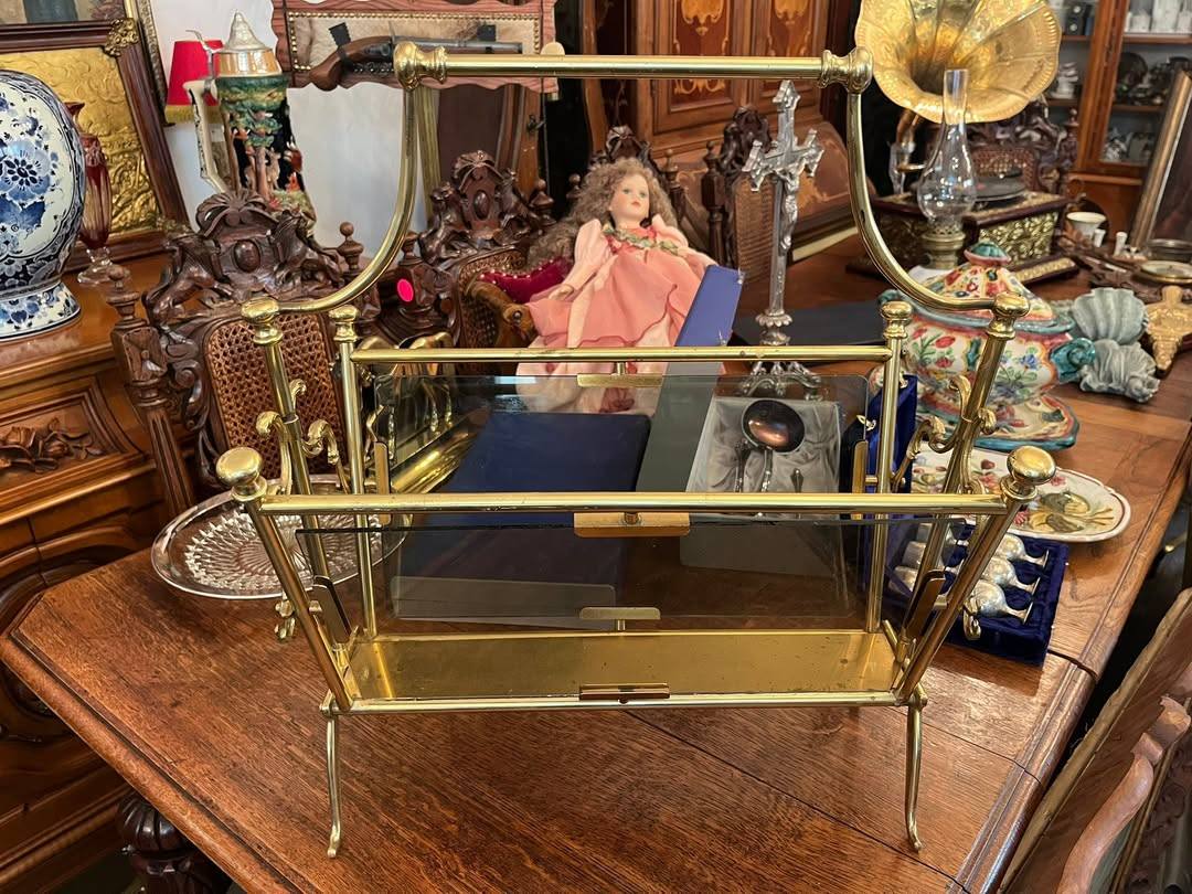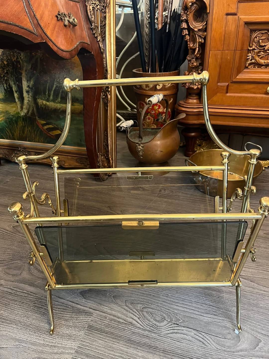 Suport decorativ pentru reviste sau ziare, realizat din alamă masivă cu panouri din sticlă , în stil clasic vintage. Design elegant, cu detalii curbate și