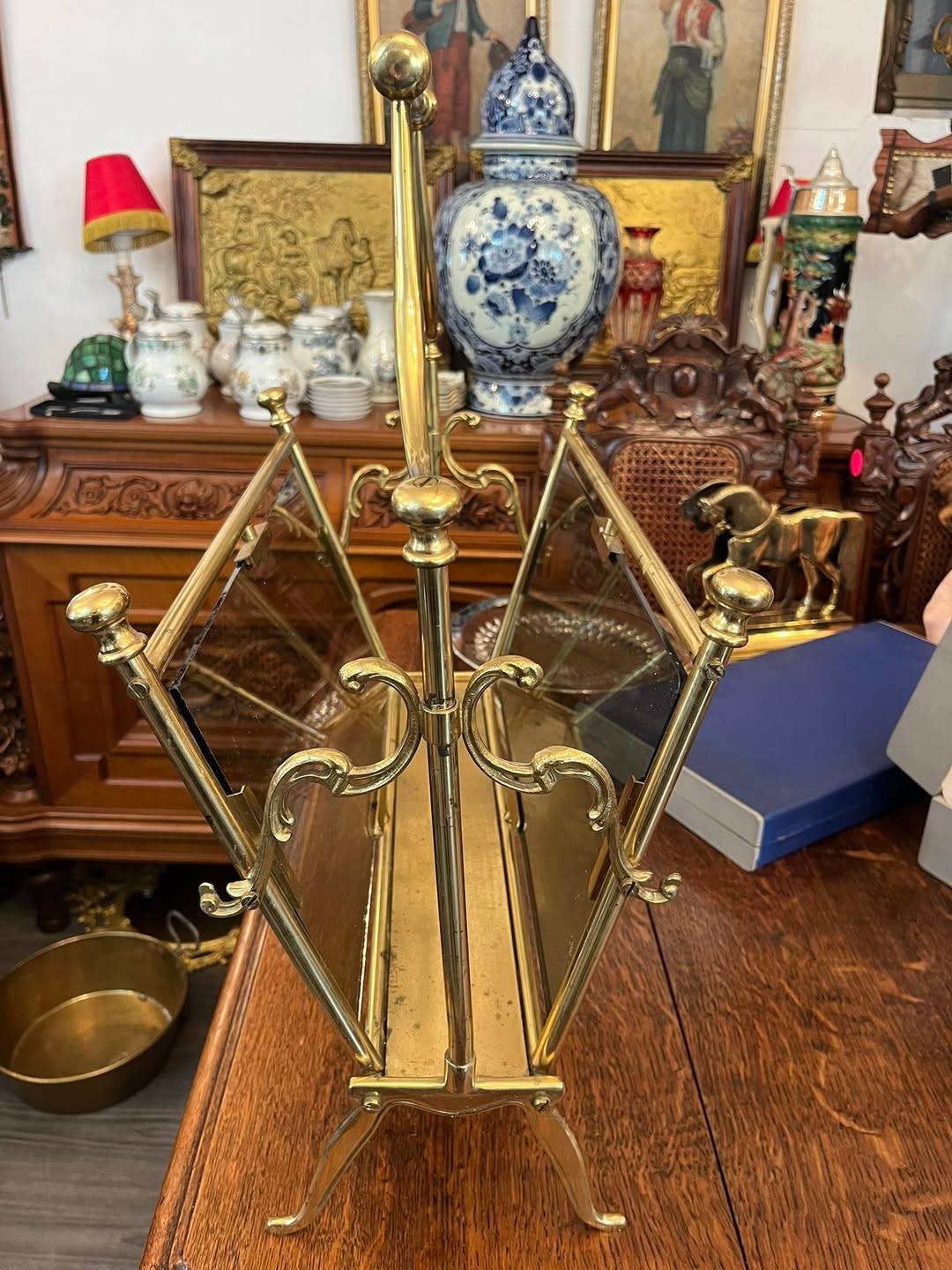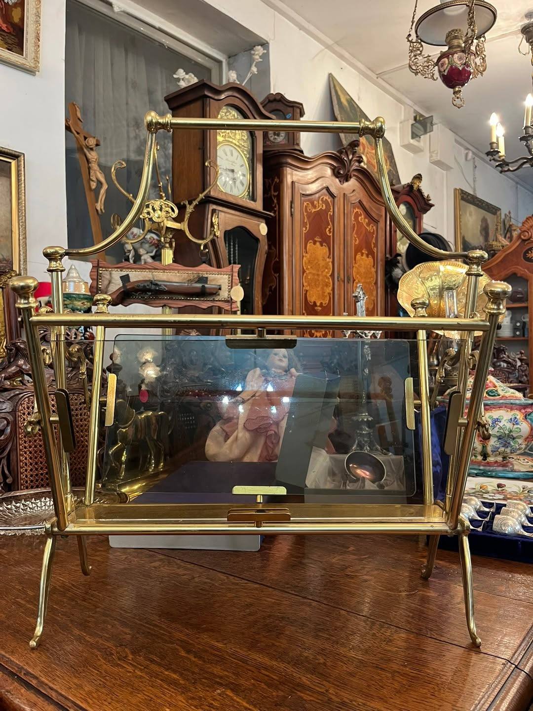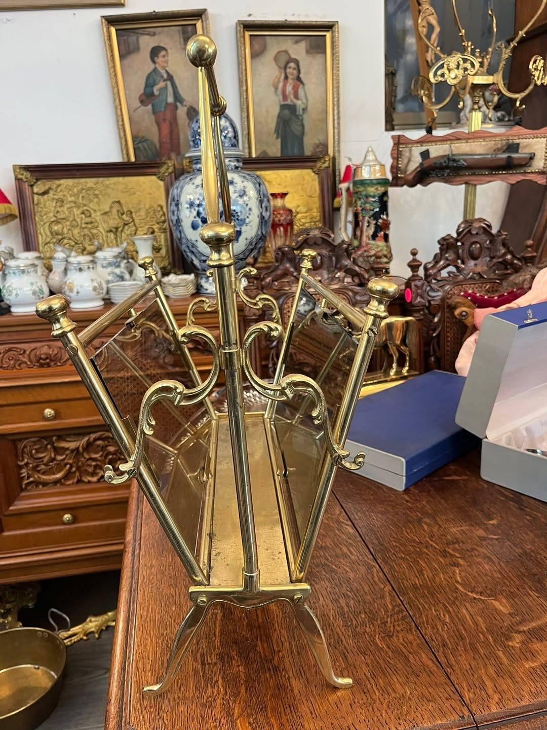 Suport decorativ pentru reviste sau ziare, realizat din alamă masivă cu panouri din sticlă , în stil clasic vintage. Design elegant, cu detalii curbate și