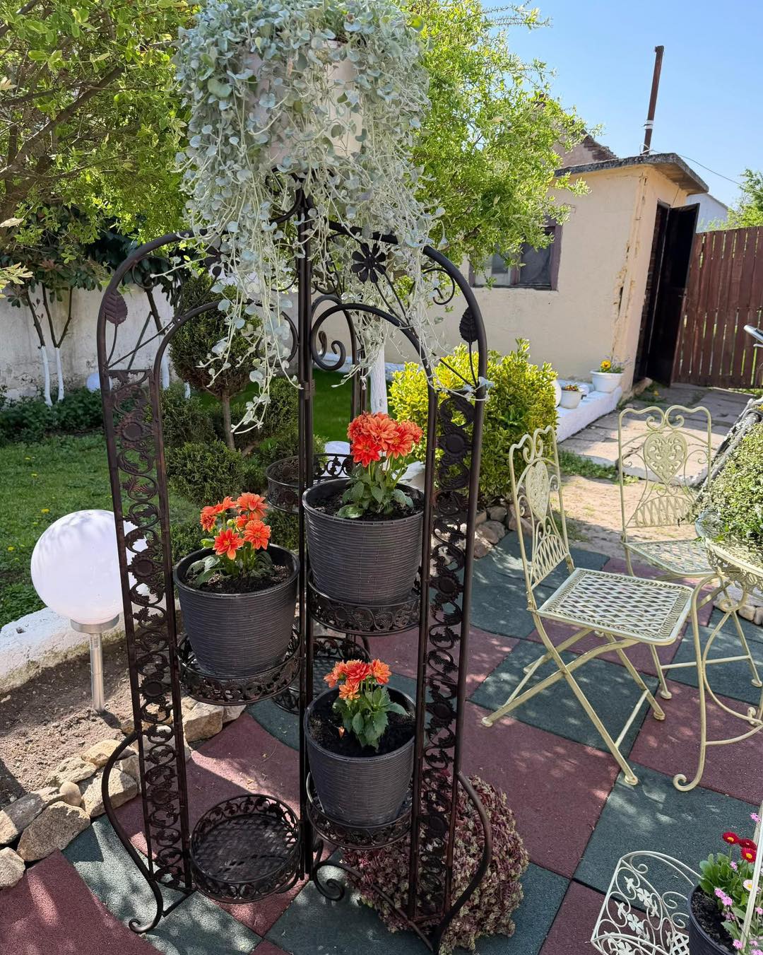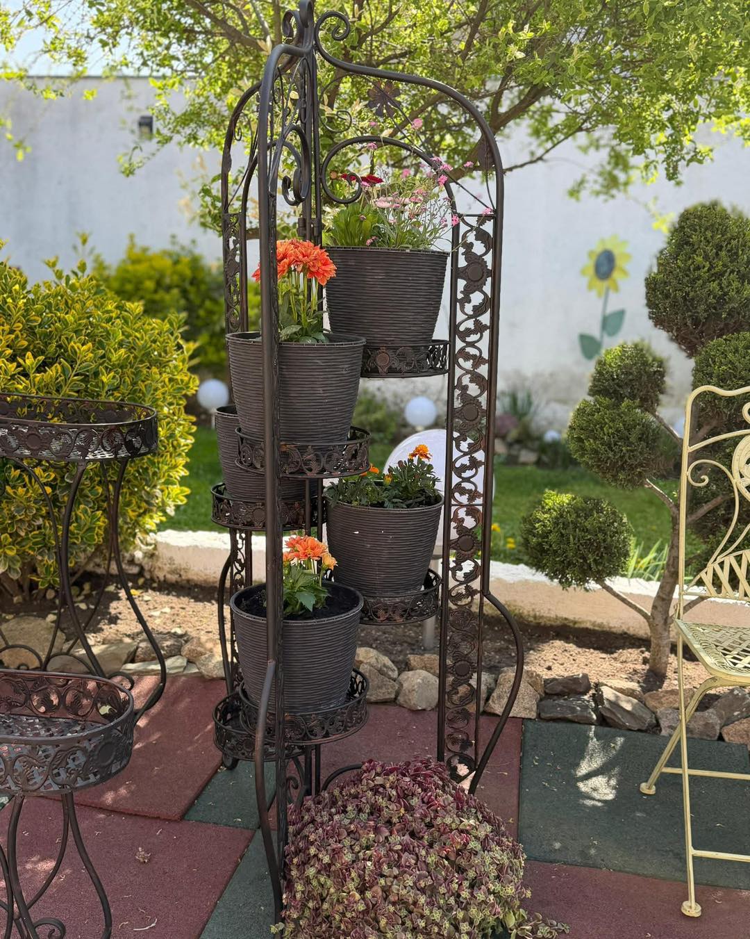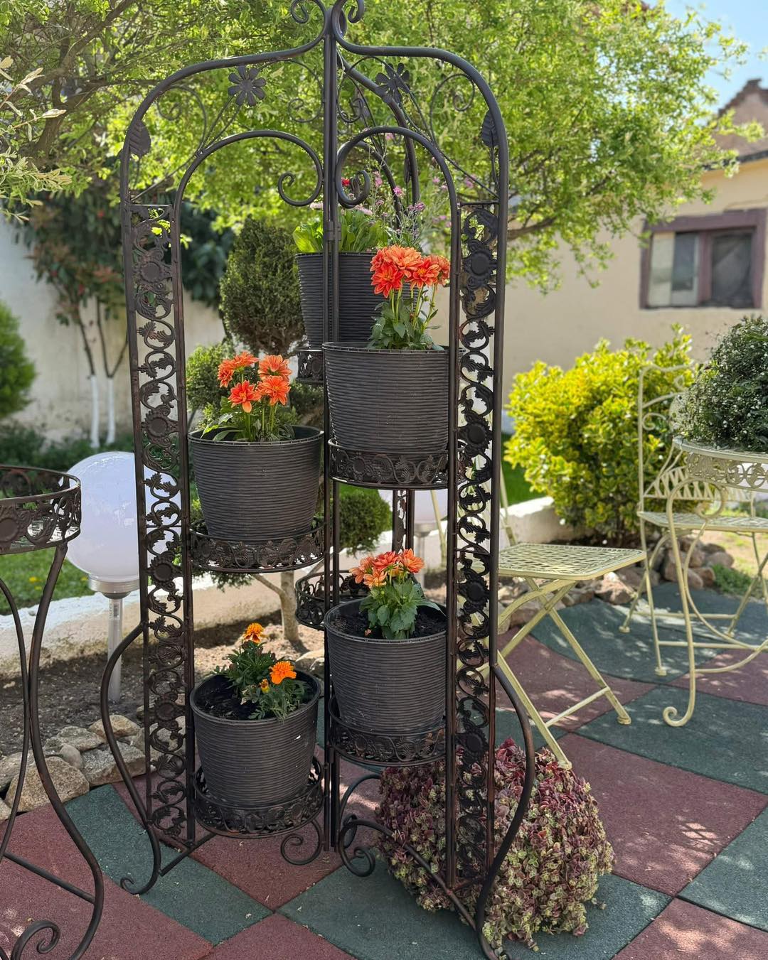 Suport Flori Tip Paravan din Fier Forjat – 6 Rafturi, Stil Vintage,deosebit pentru plante, realizat din fier forjat cu finisaj rustic, tip paravan (3 secțiuni articulate), ceea ce îi oferă stabilitate și permite poziționarea în diverse unghiuri.
