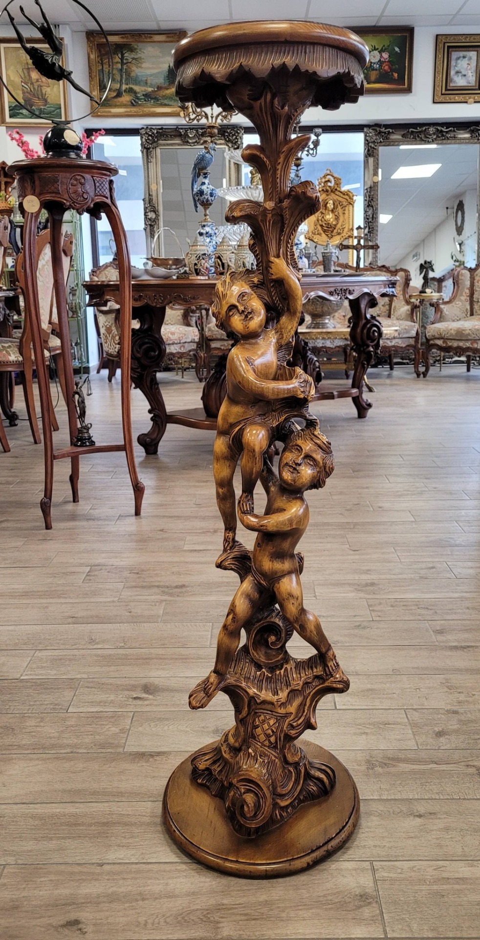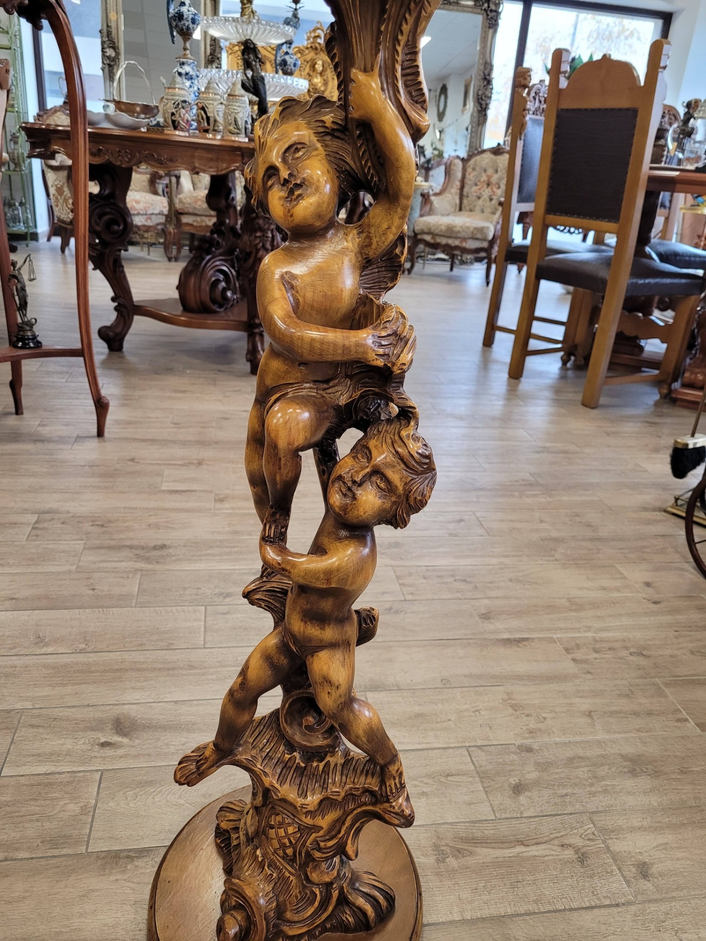 Suport-piedestal decorativ, piesă de excepție cu îngerași, cu bază din lemn sculptat manual în stil baroc/rococo, care prezintă doi îngerași "Putti".