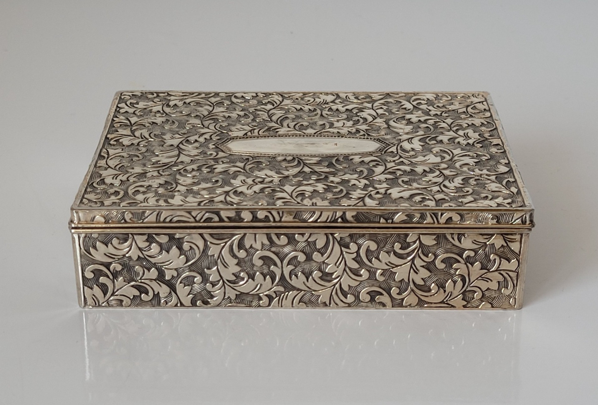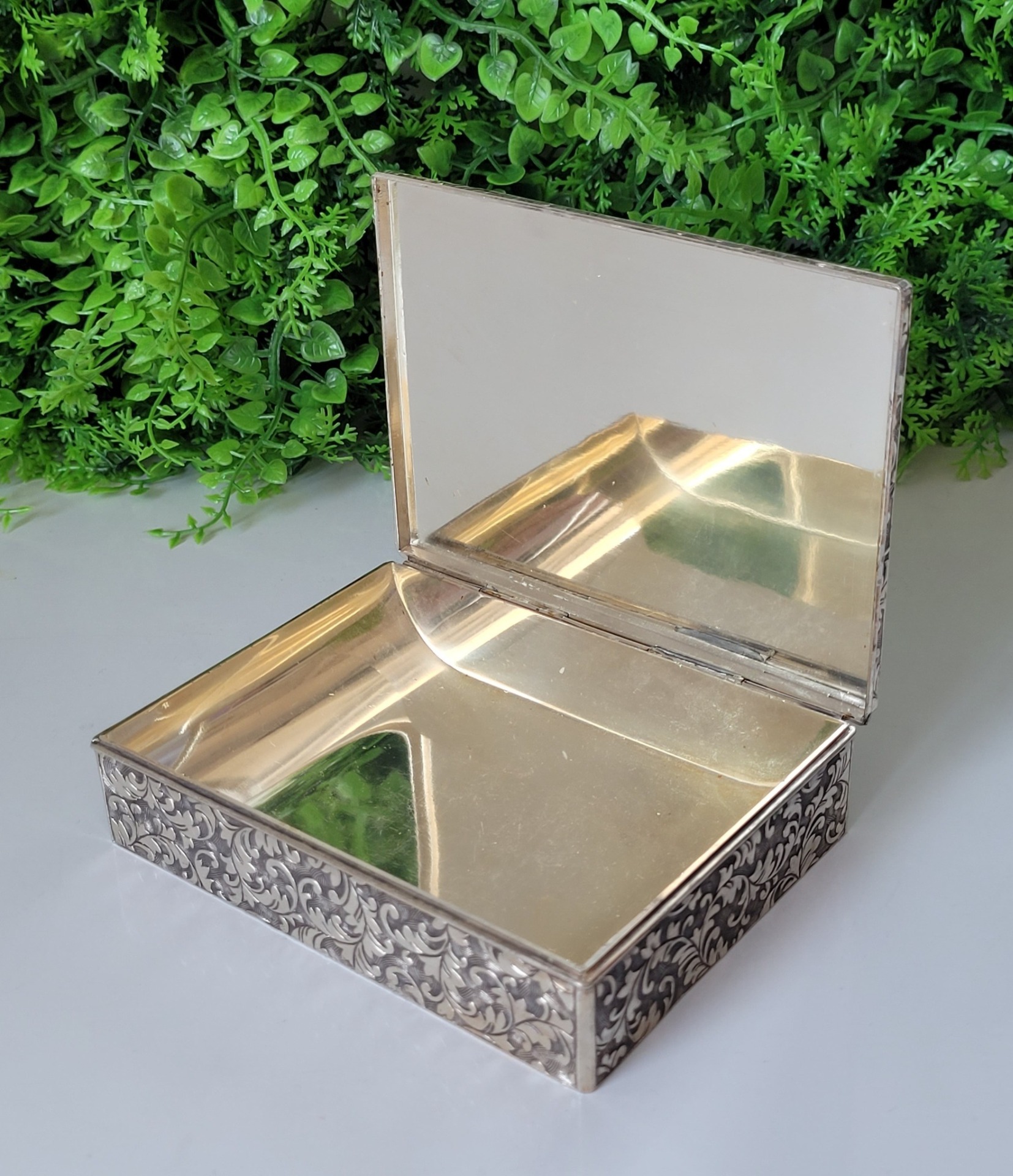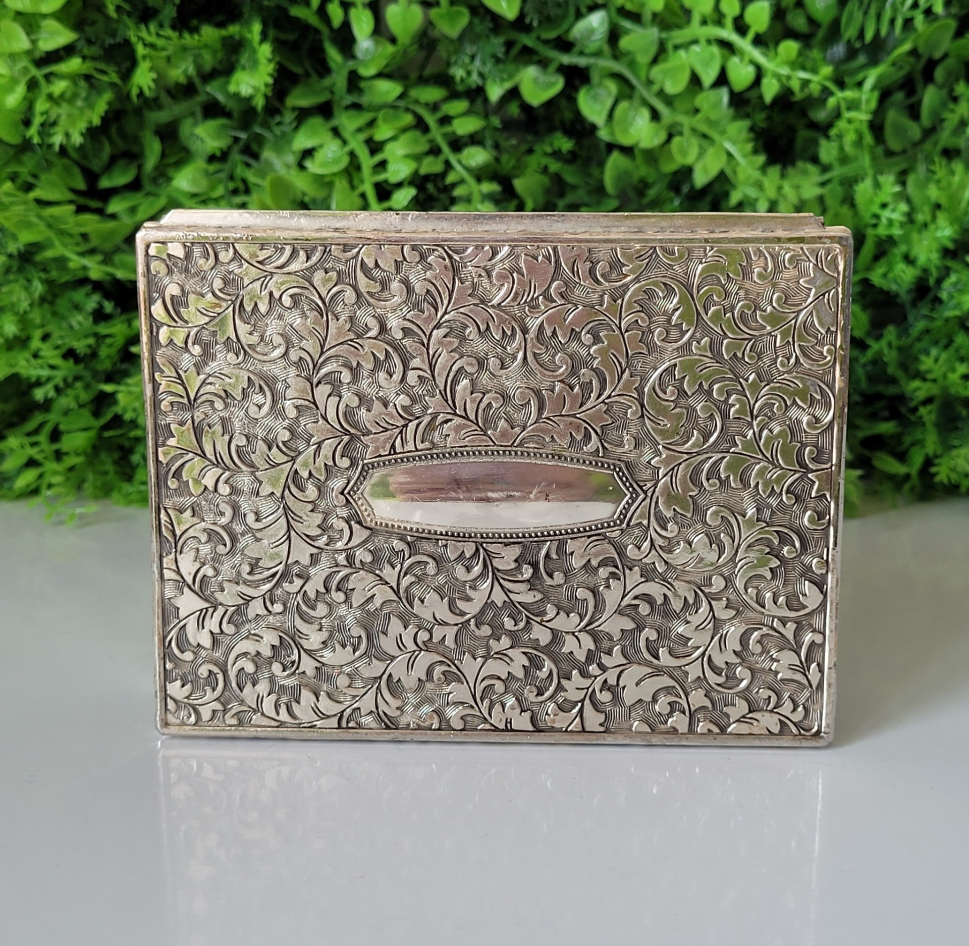 Tabacheră veche sau "trinket-box" (cutie pentru mărunțișuri), din metal argintat, decorată cu motive florale.