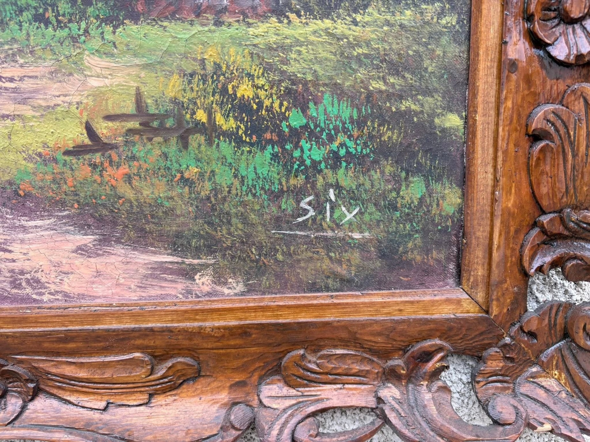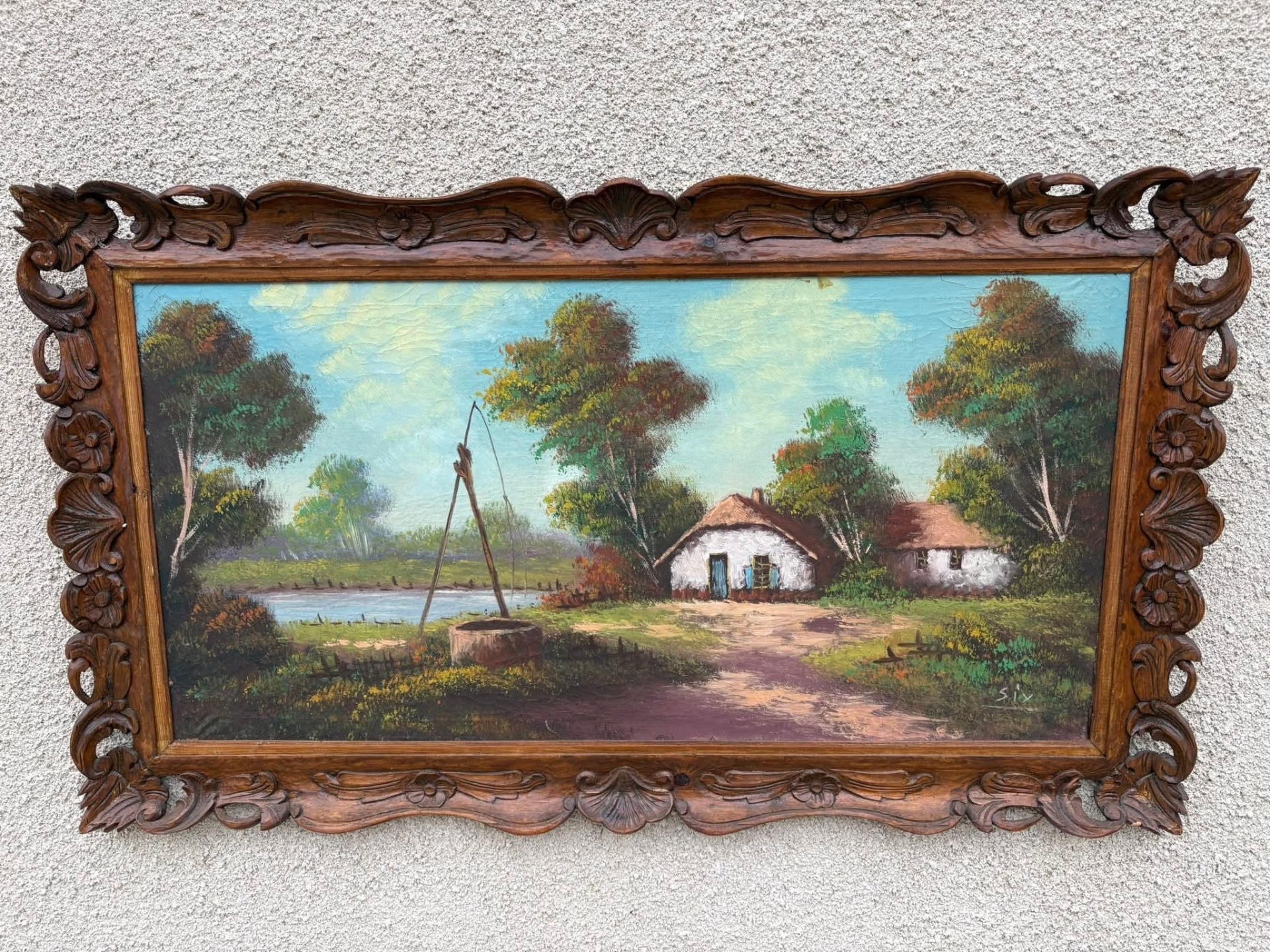 Tablou decorativ cu peisaj rustic, reprezentând căsuțe tradiționale lângă apă, copaci și fântână, realizat în culori calde, armonioase. Lucrarea este semnată.