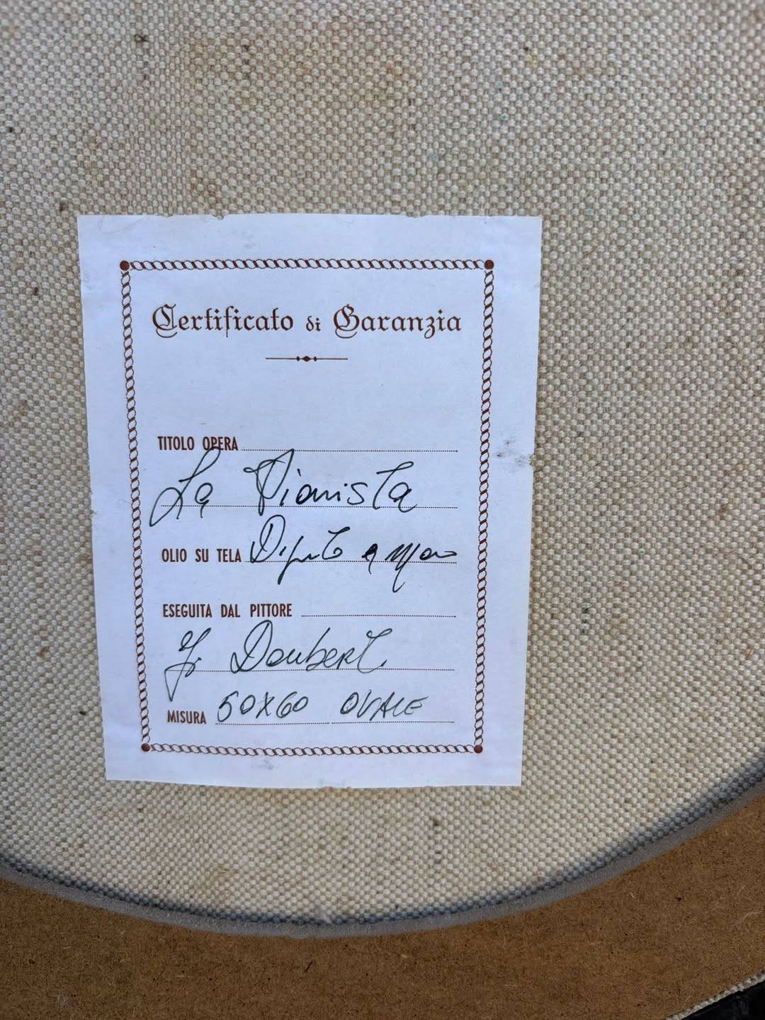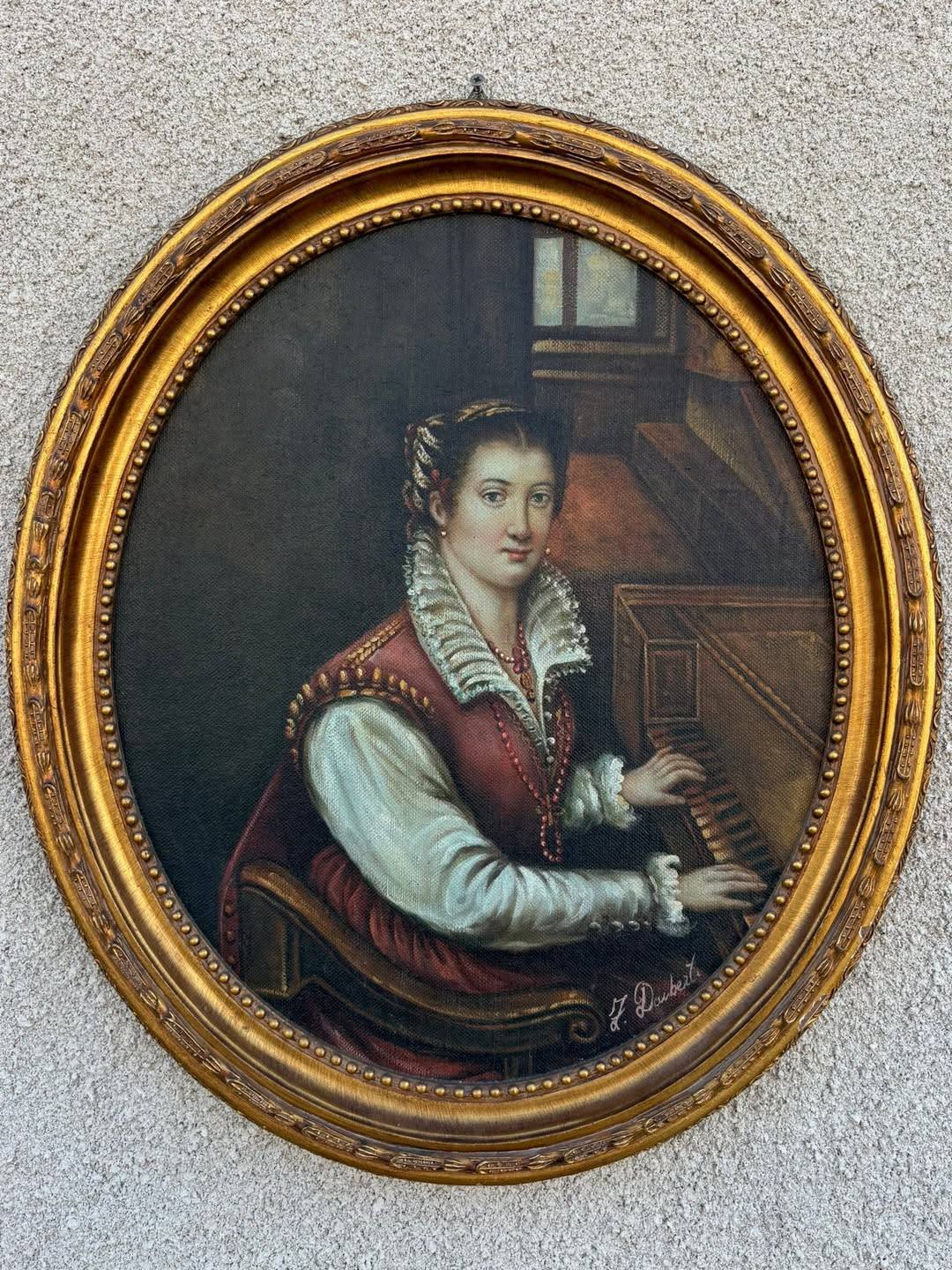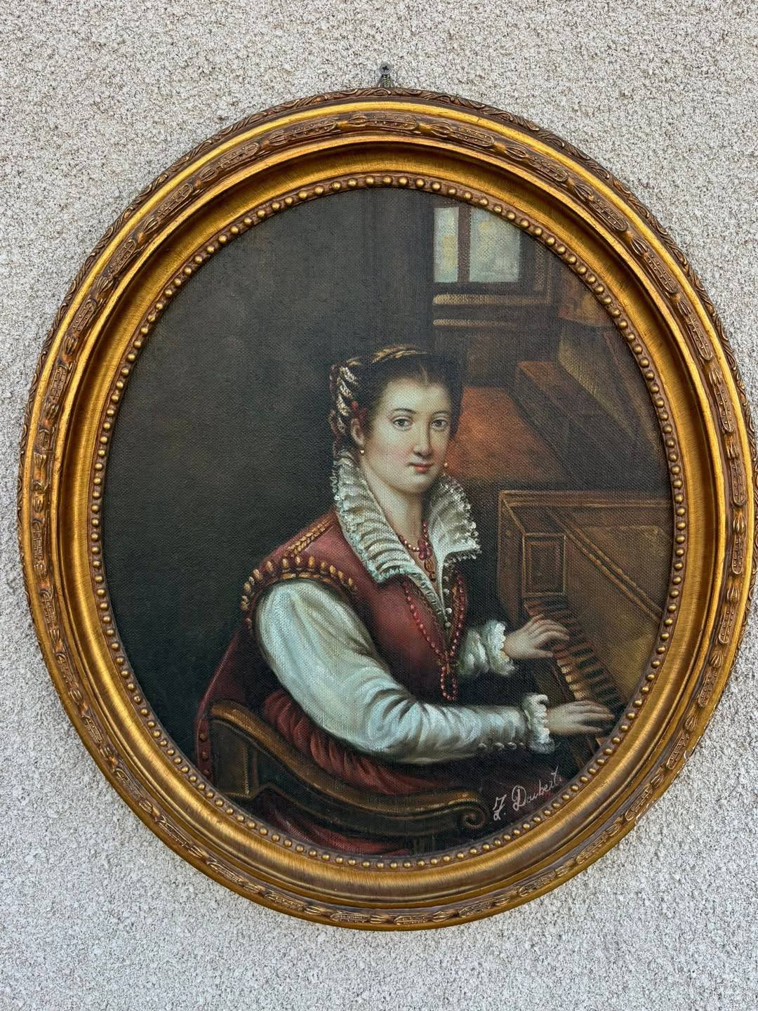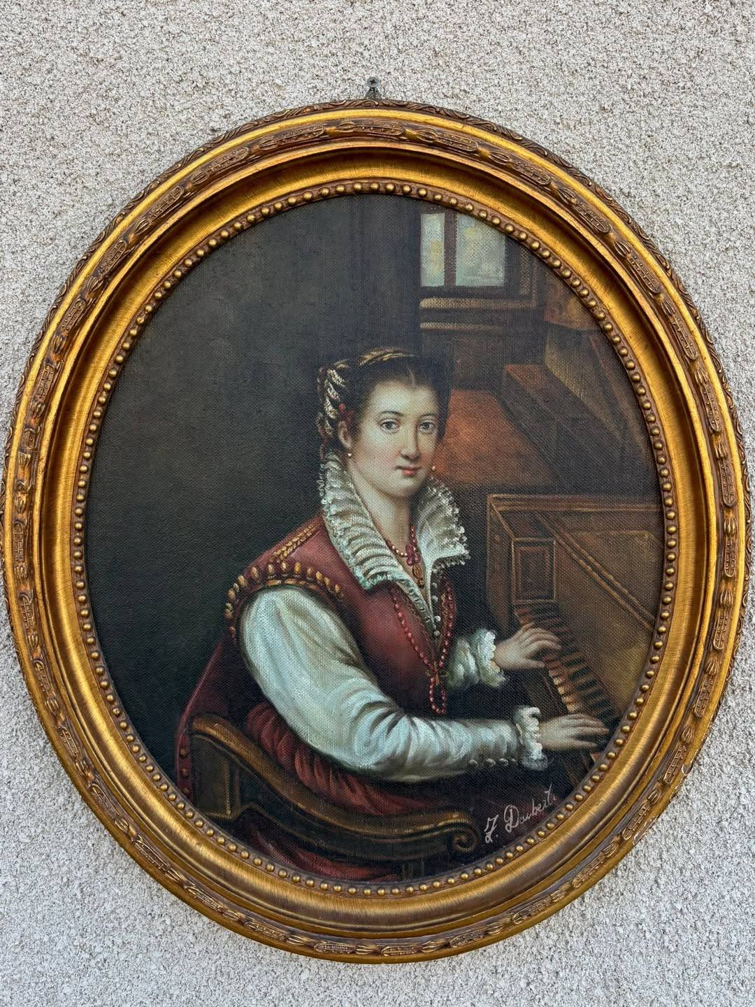 Tablou decorativ deosebit realizat în tehnica ulei pe pânză, reprezentând o tânără pianistă într-un interior clasic. Lucrarea este montată într-o ramă ovală aurie bogat ornamentată, care îi oferă un aspect elegant și rafinat, potrivit pentru un decor clasic sau vintage.