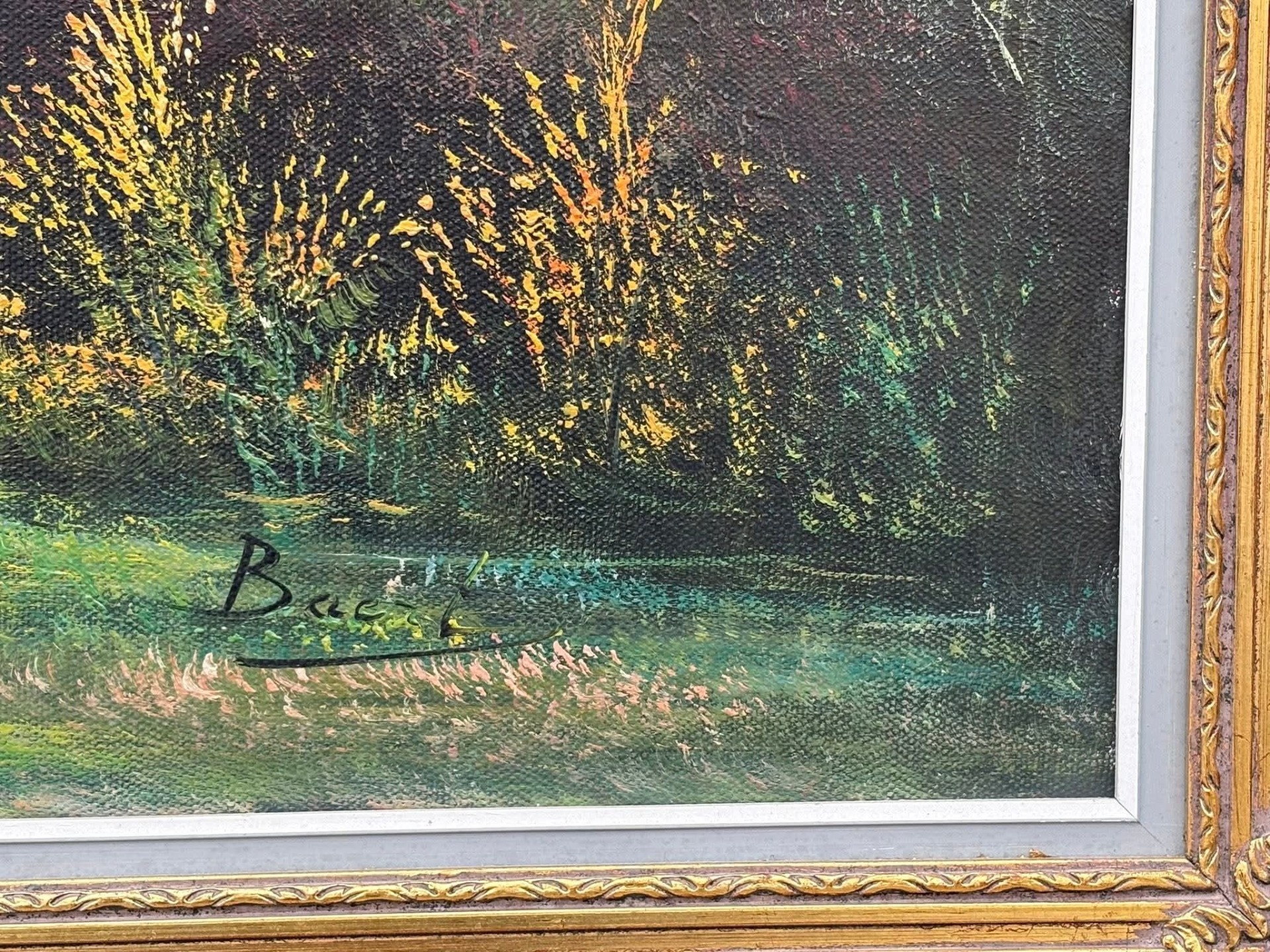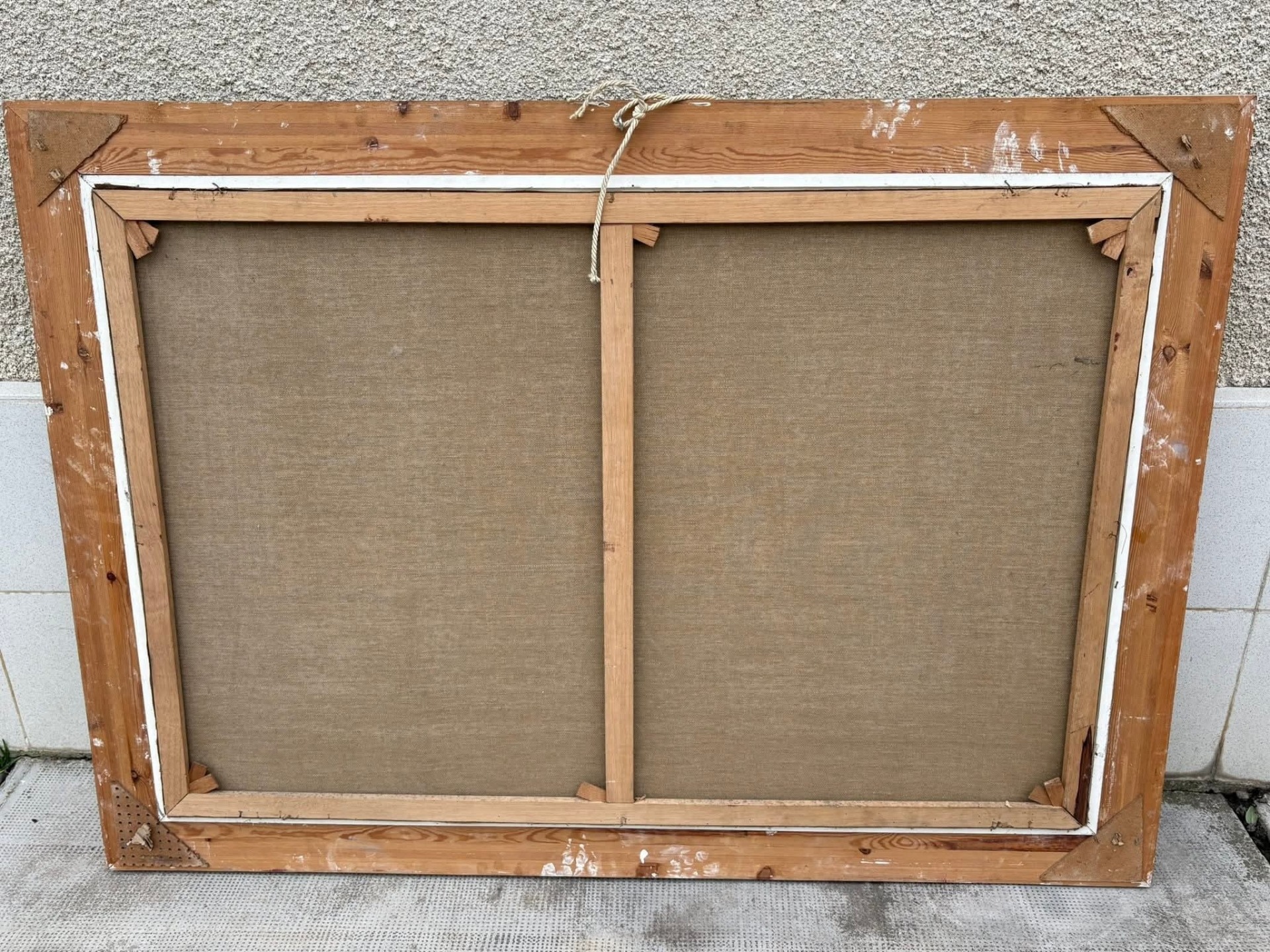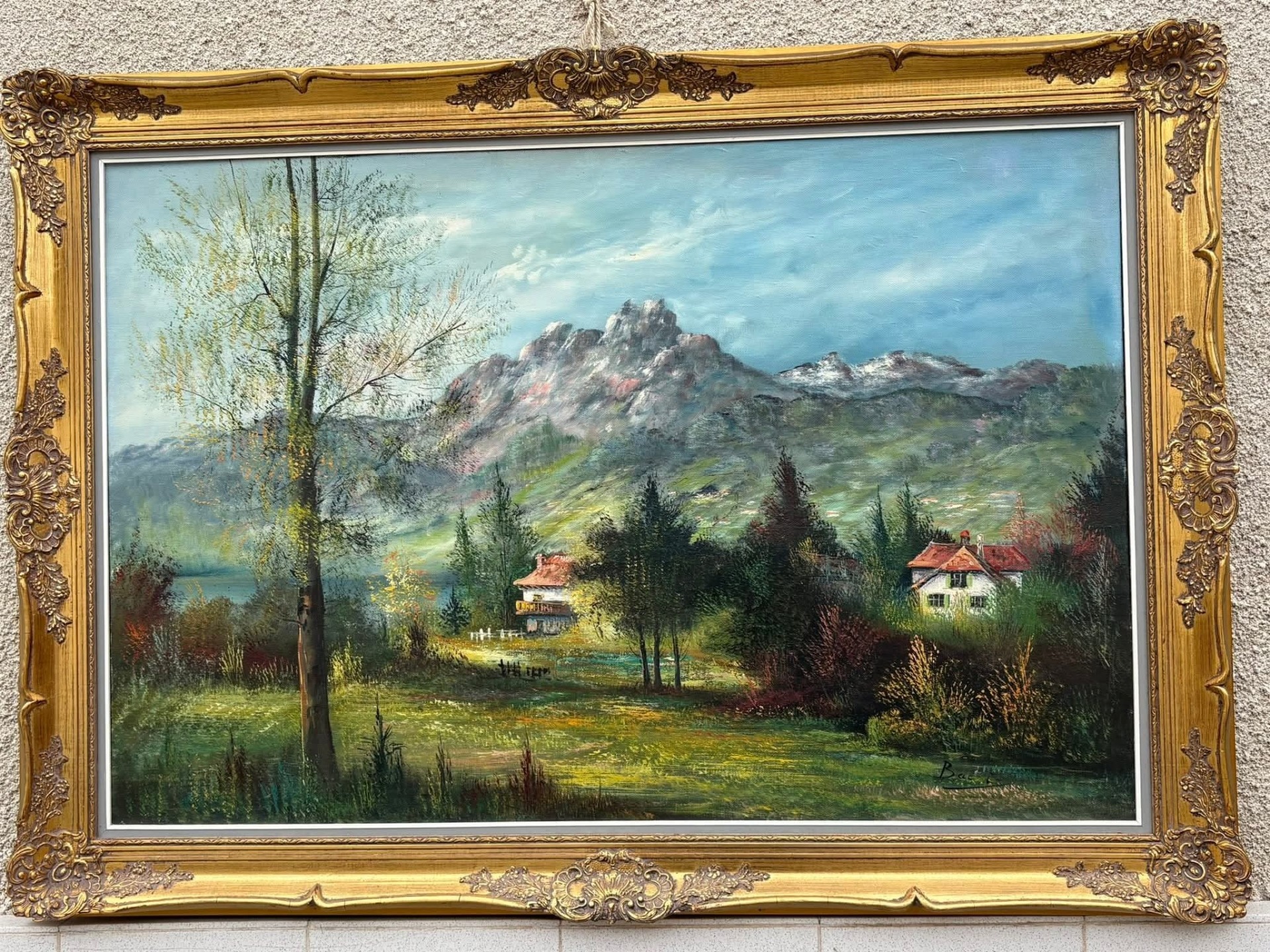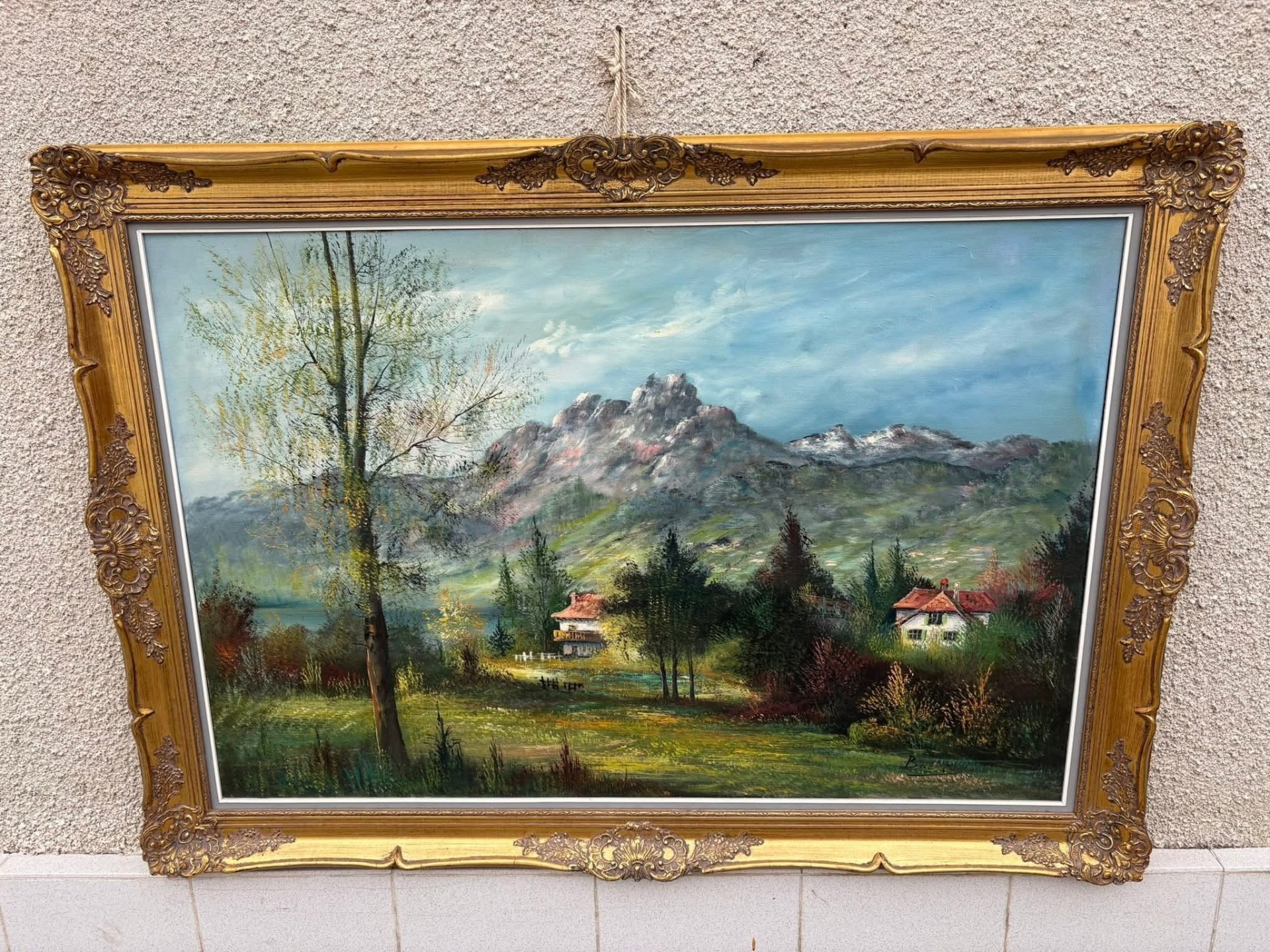 Tablou decorativ deosebit, reprezentând un peisaj montan spectaculos, cu munți impunători în fundal, căsuțe rustice și vegetație bogată în prim-plan. Lucrarea este realizată în culori vibrante, cu detalii fine și efecte de lumină foarte bine evidențiate.