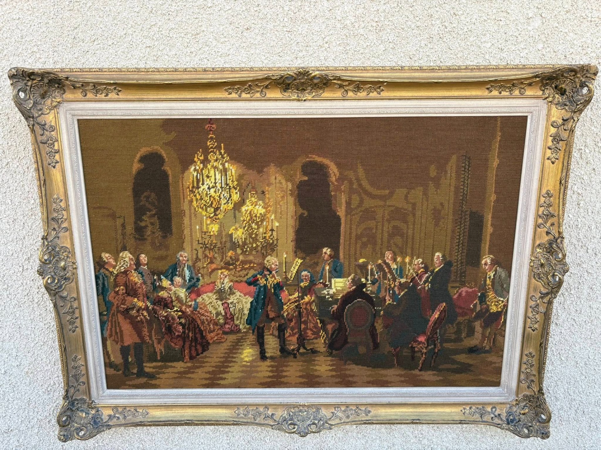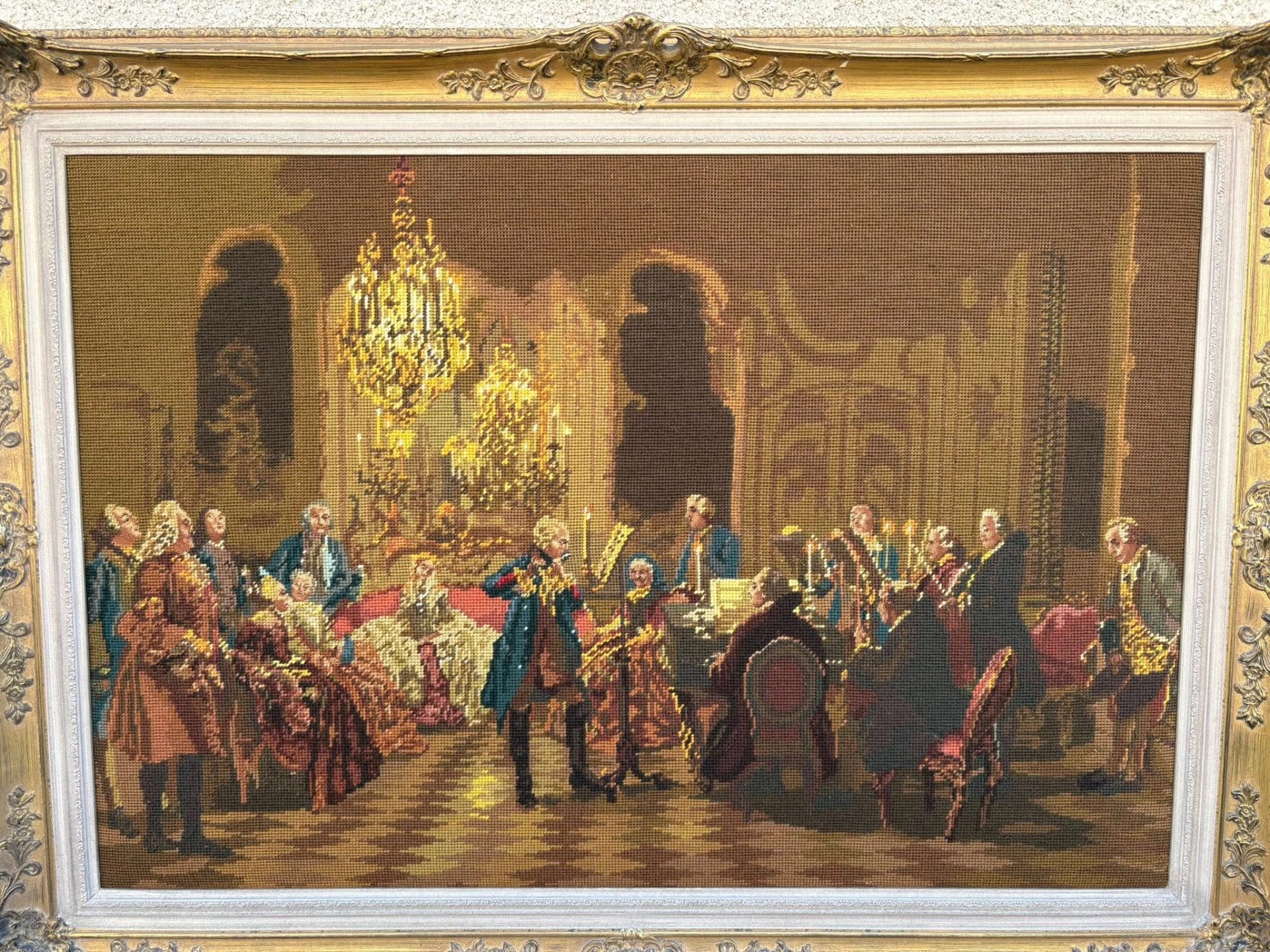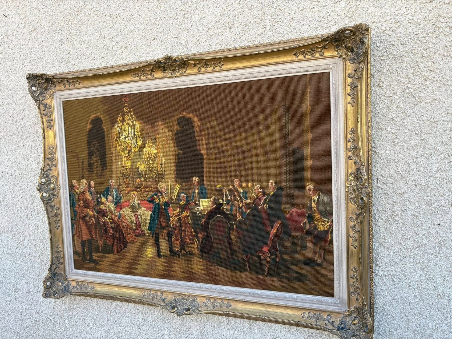 Tablou decorativ goblen clasic, reprezentând o scenă aristocratică de salon (stil secol XVIII), cu personaje elegante și atmosferă barocă, iluminată de candelabre. Lucrare tip goblen / tapiserie fină, înrămată într-o ramă aurie ornamentată, deosebit de decorativă.