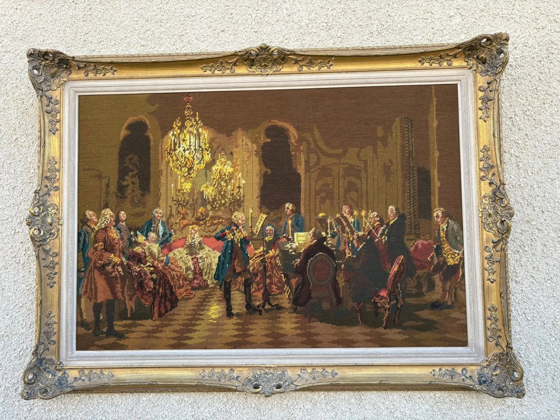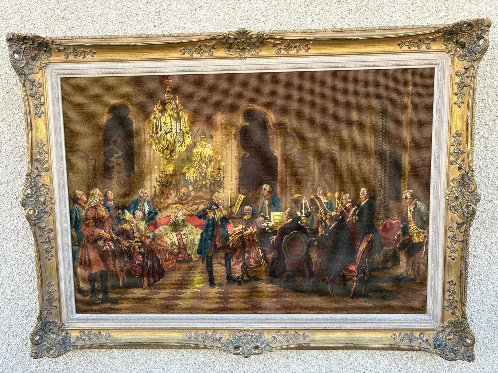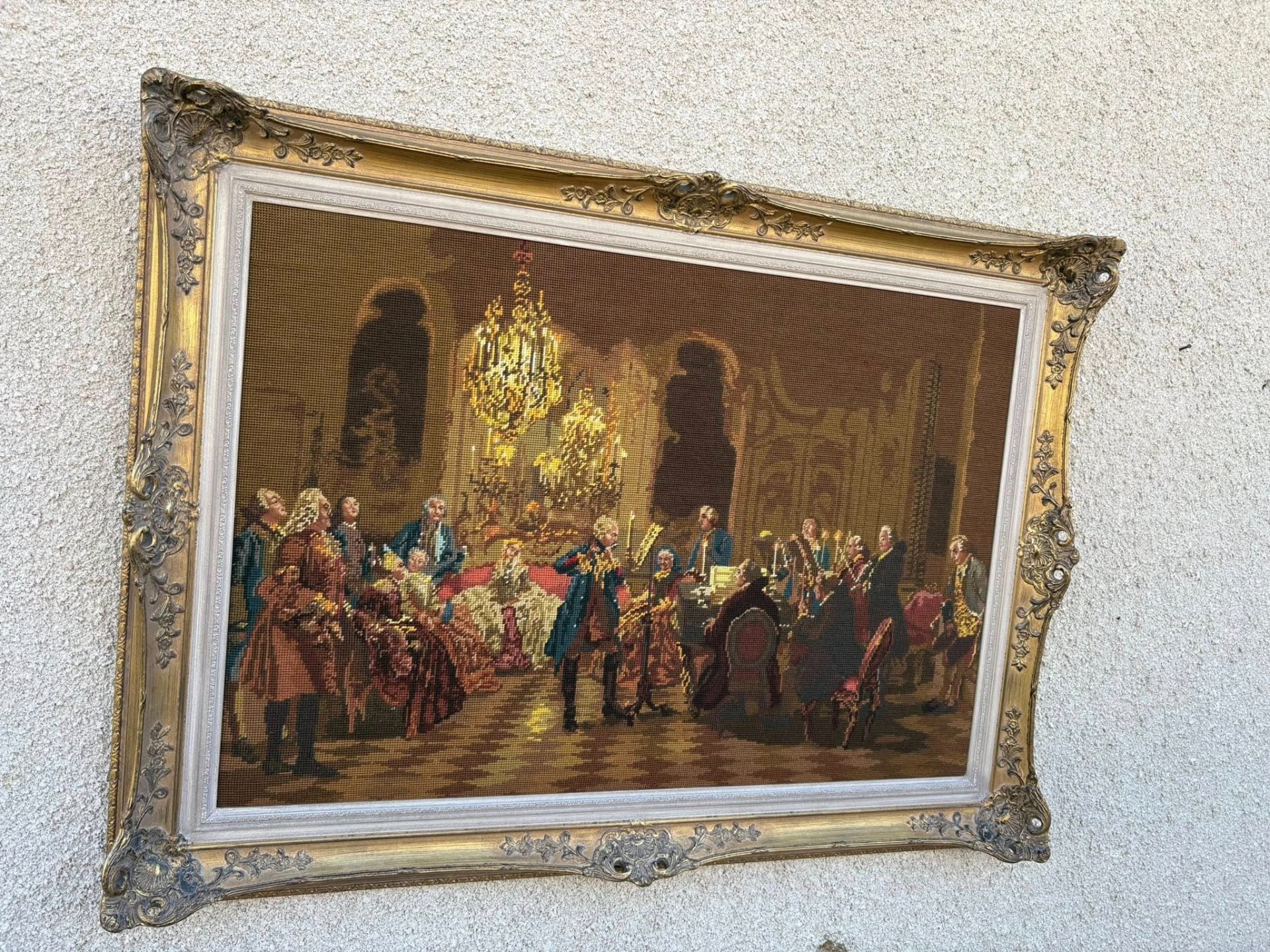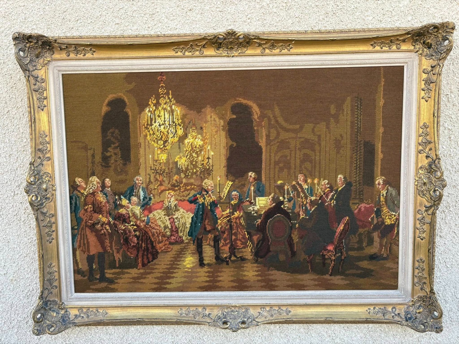 Tablou decorativ goblen clasic, reprezentând o scenă aristocratică de salon (stil secol XVIII), cu personaje elegante și atmosferă barocă, iluminată de candelabre. Lucrare tip goblen / tapiserie fină, înrămată într-o ramă aurie ornamentată, deosebit de decorativă.
