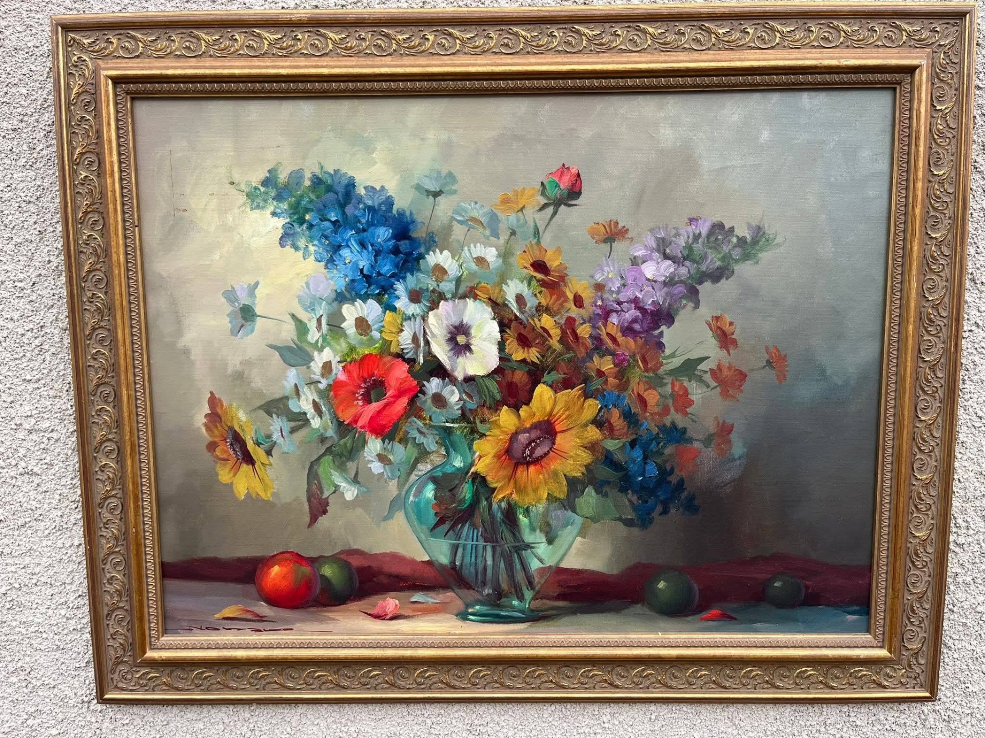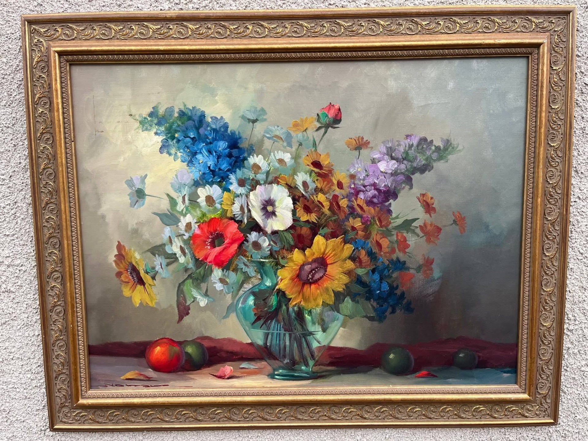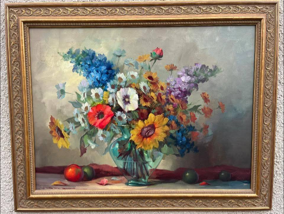 Tablou decorativ realizat în ulei pe pânză, reprezentând un buchet bogat de flori într-o vază de sticlă, în stil clasic. Culori vii, armonioase, cu un fundal elegant, potrivit atât pentru living, birou sau spații cu aer vintage.
