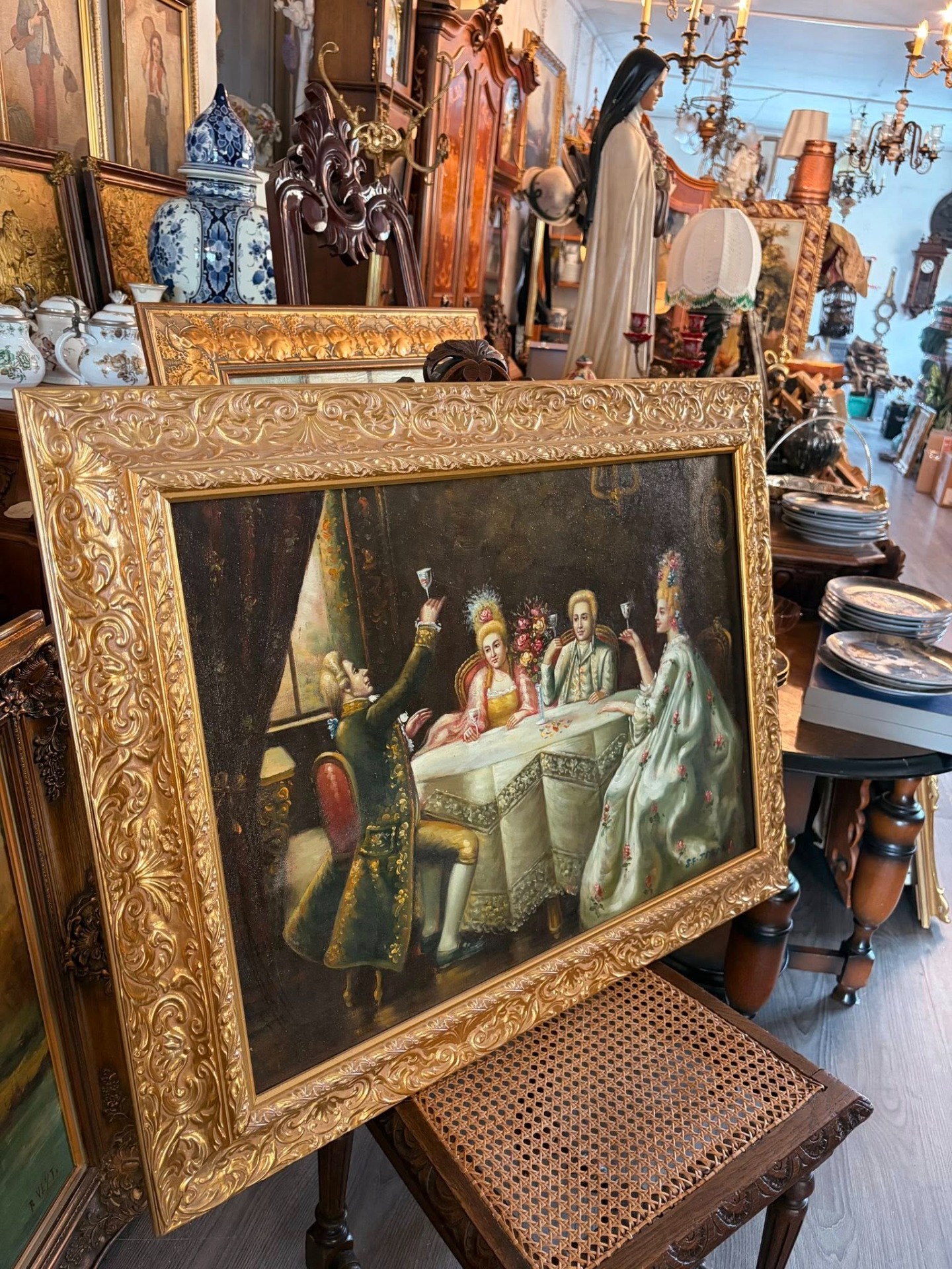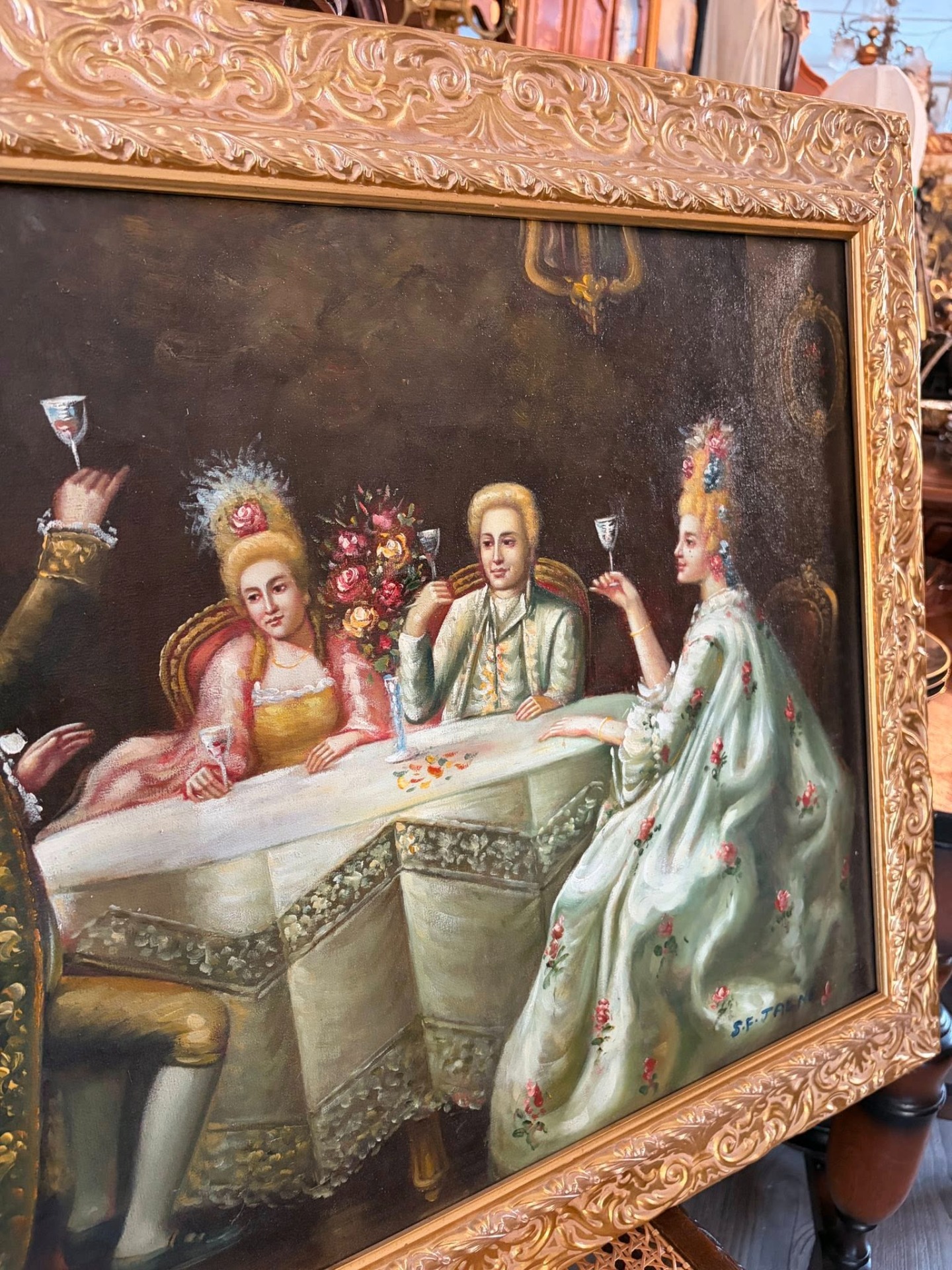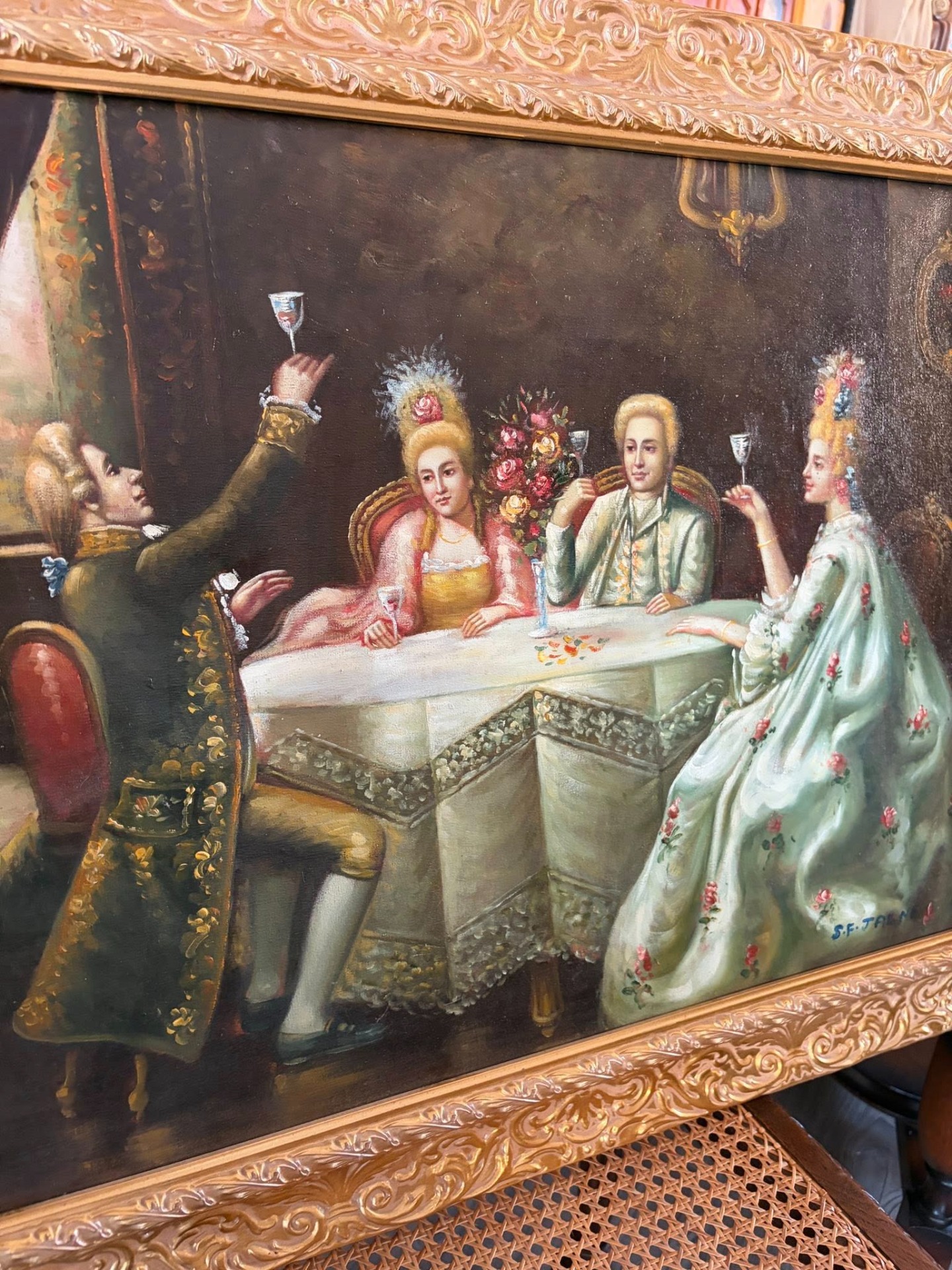 pahare ridicate. Lucrarea este realizată în stil rococo, cu atenție la detalii, cromatică rafinată și atmosferă nobilă.
