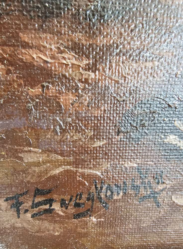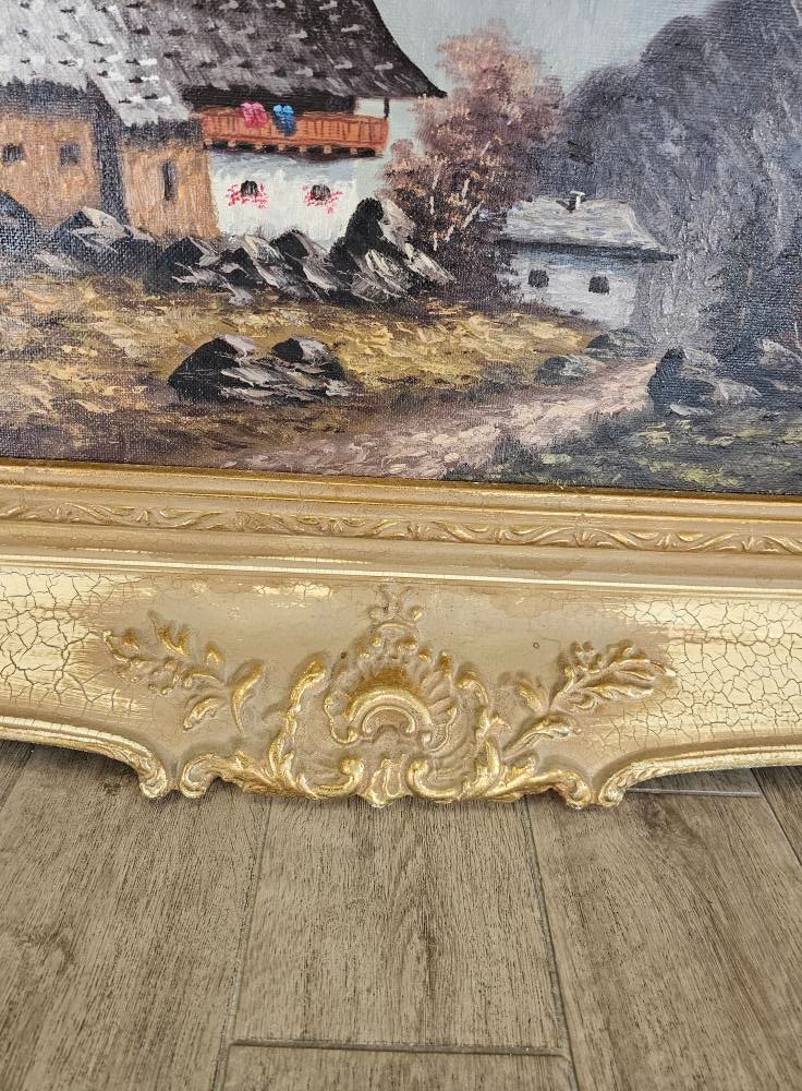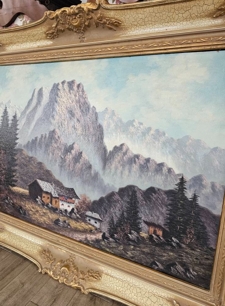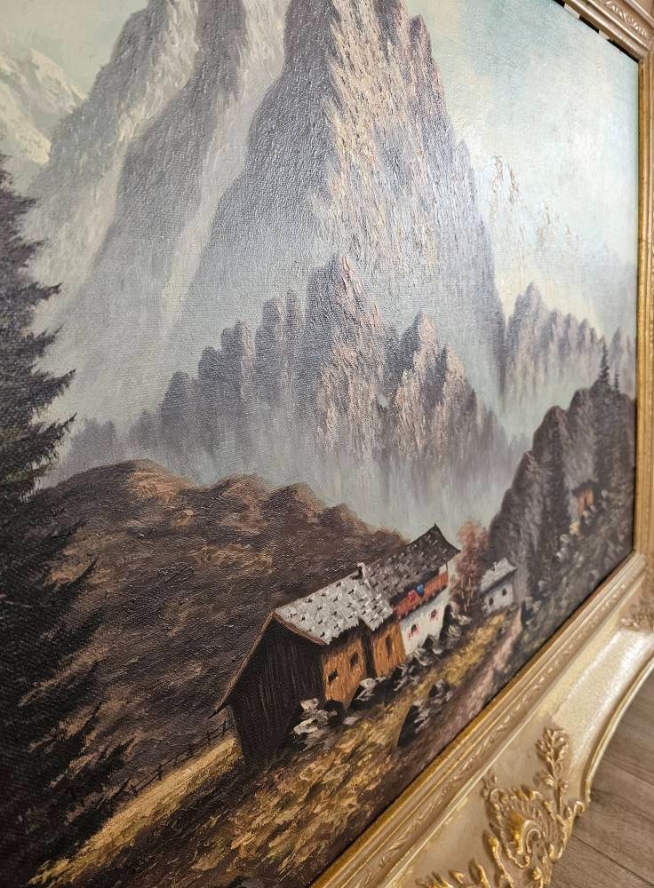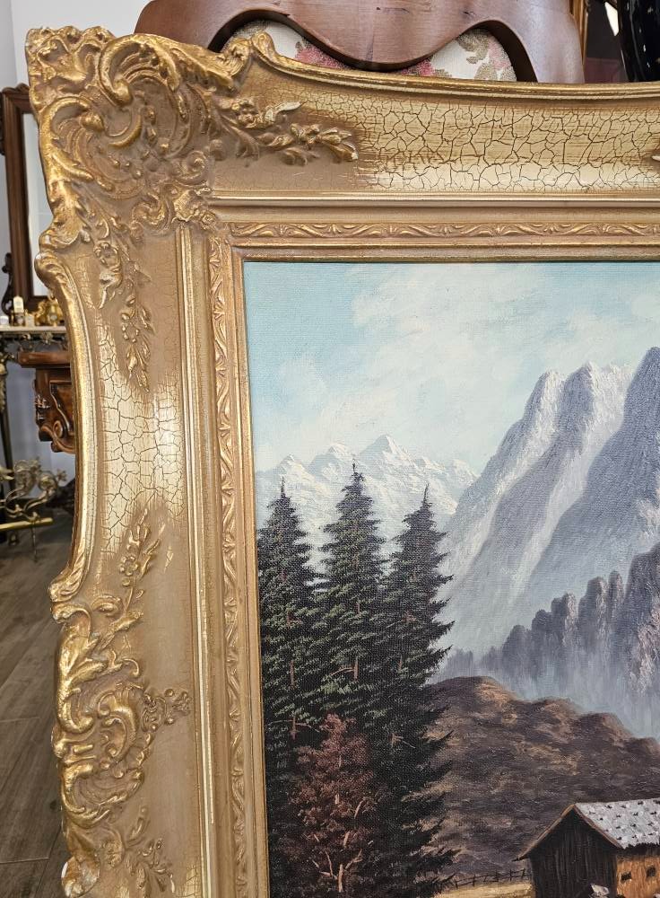 Tablou deosebit, pictat în ulei reprezentând un peisaj montan alpin, cu o cabană tradițională și creste înalte în fundal.