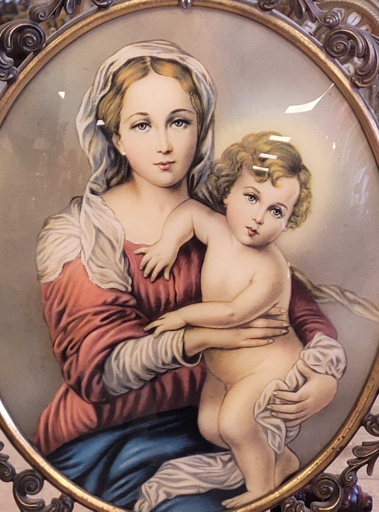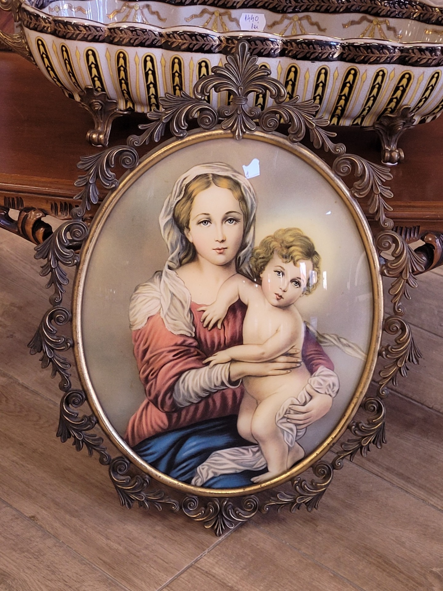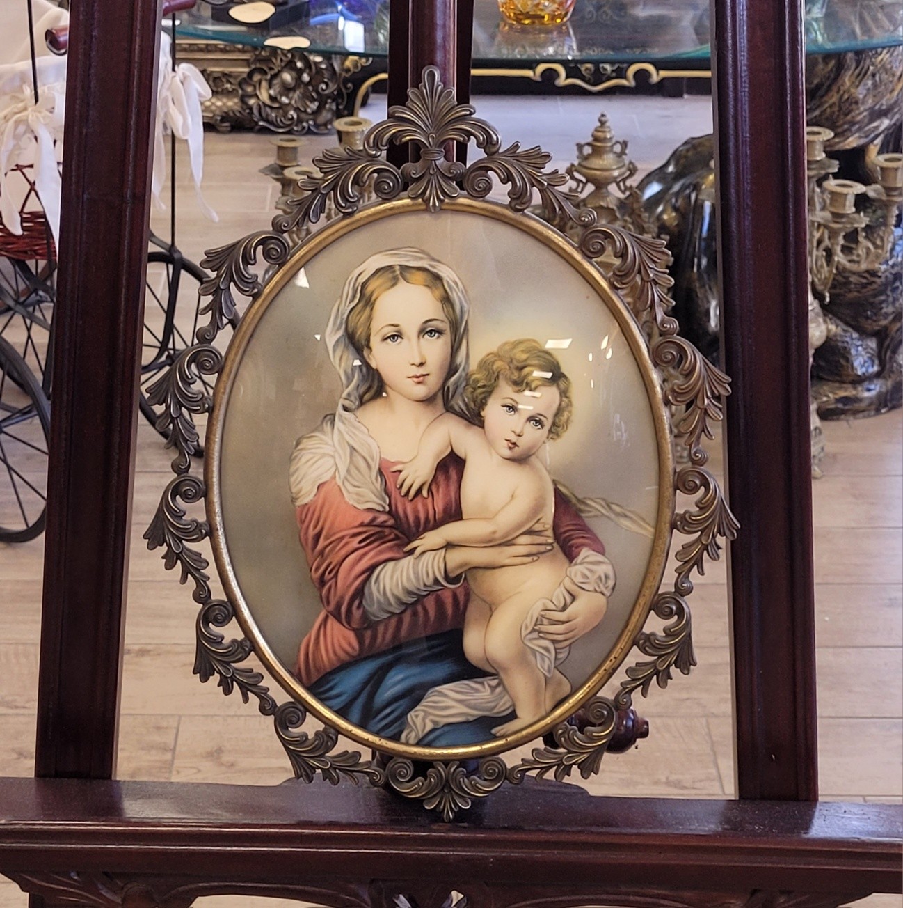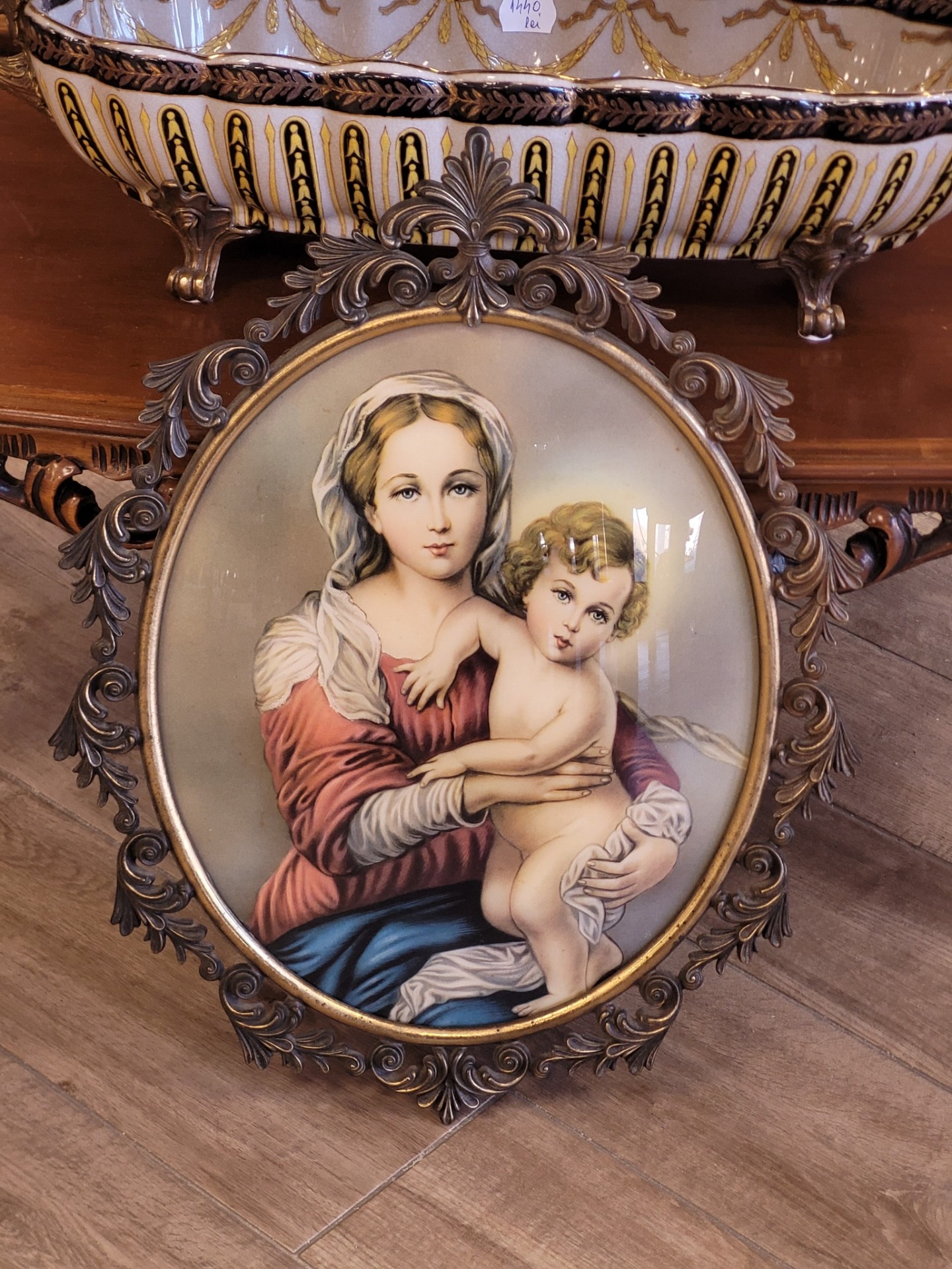 Tablou "Madona cu Pruncul", în ramă ovală din metal, cu motive florale în stil rococo, prevăzută cu un fronton decorativ proeminent (stil evantai/scoică).
