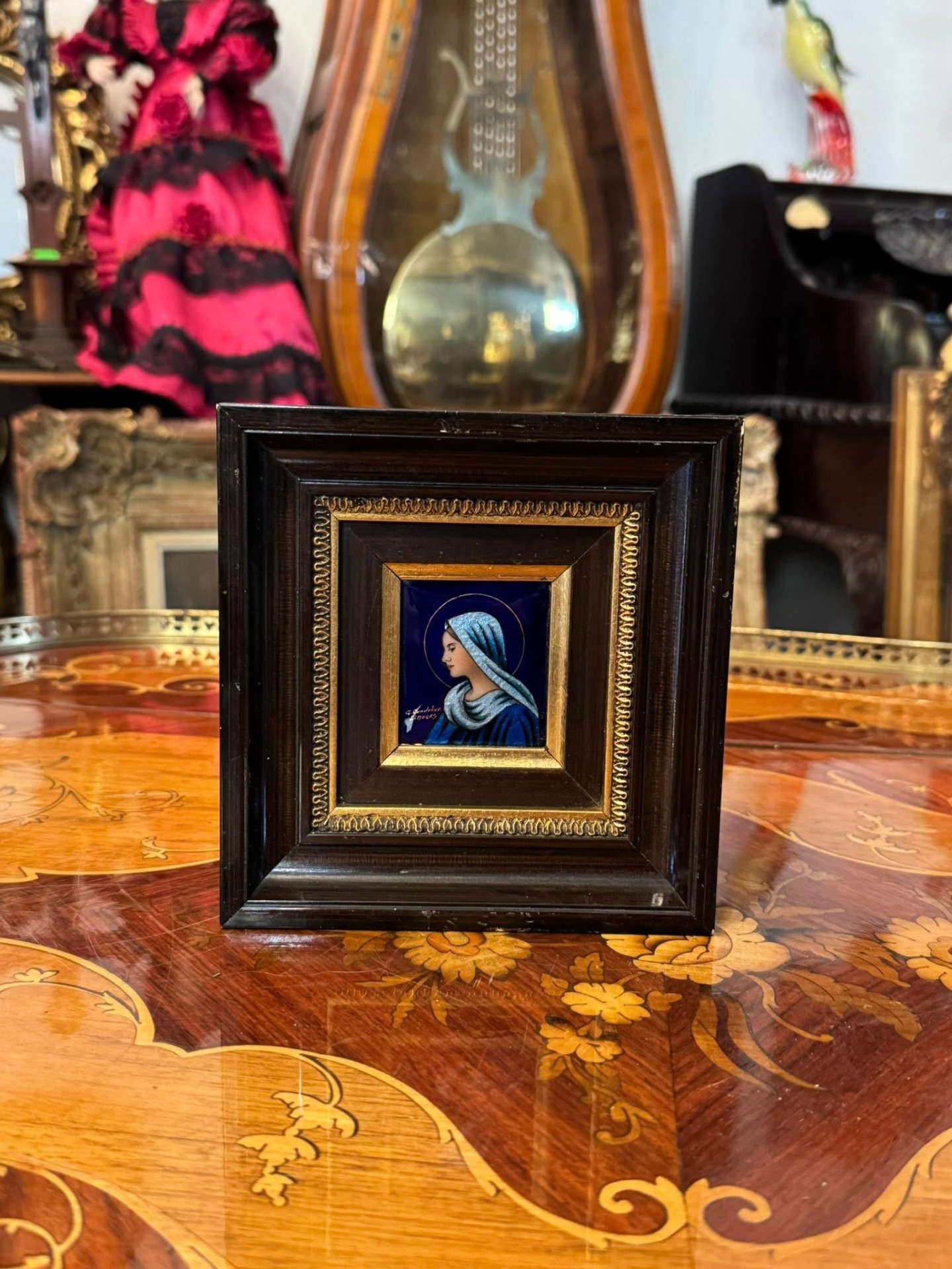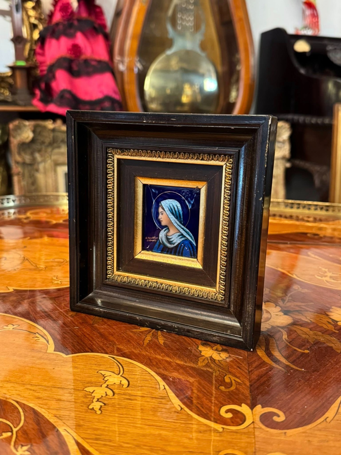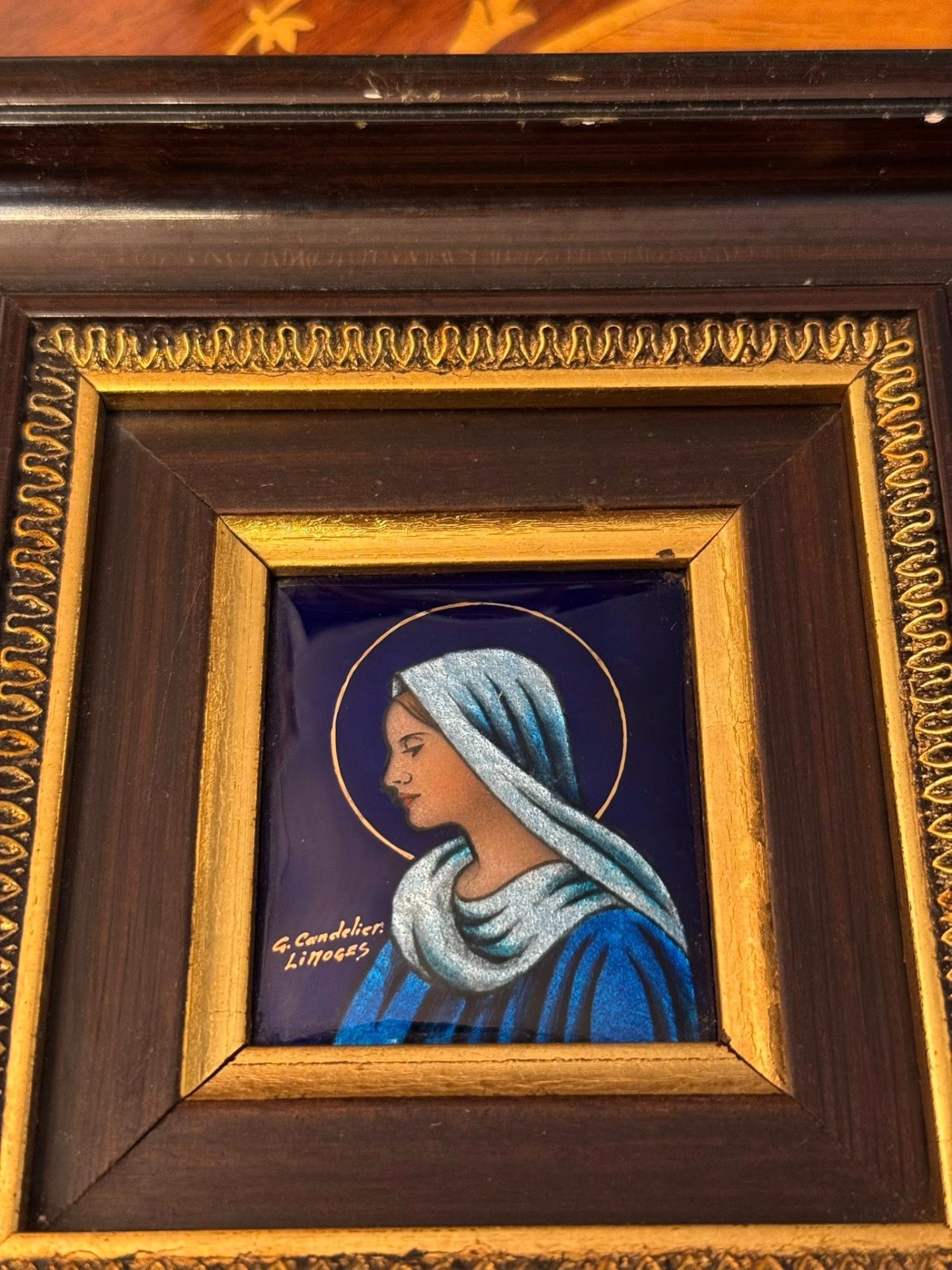 Tablou miniatură în email, reprezentare a Fecioarei Maria- Limoges. Piesa este semnată G. Candelier, un artist recunoscut pentru lucrările în email din Limoges, Franța.(cca 1960)