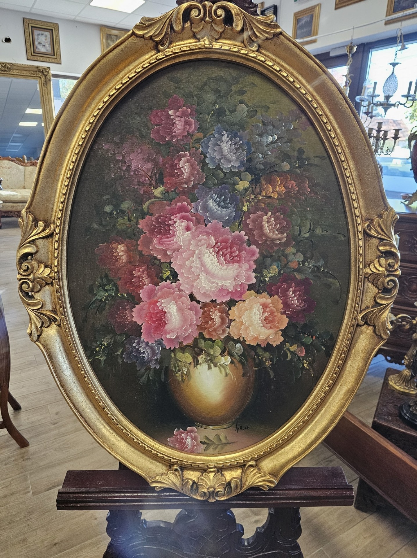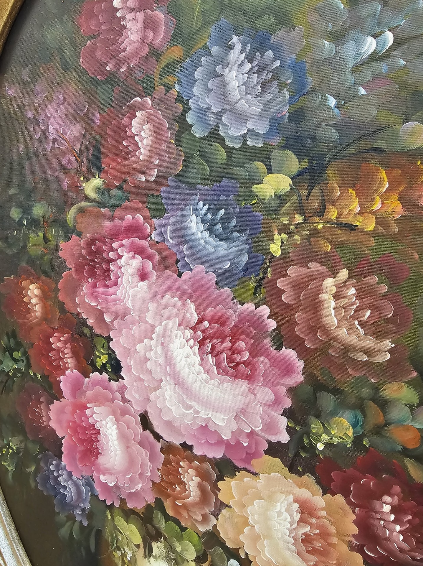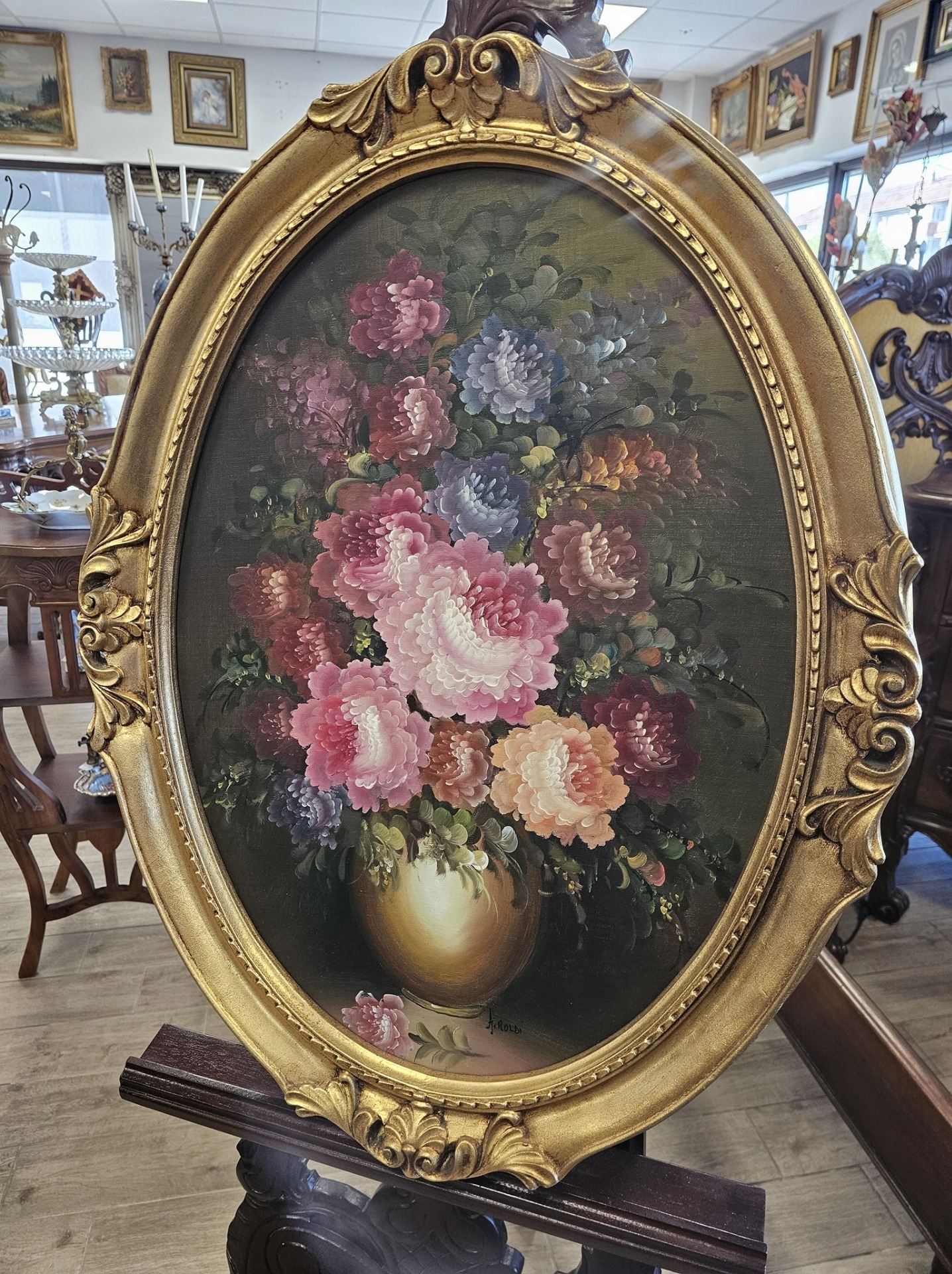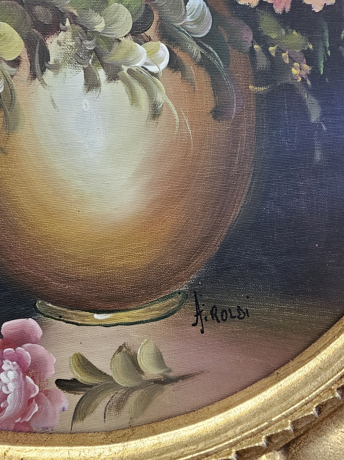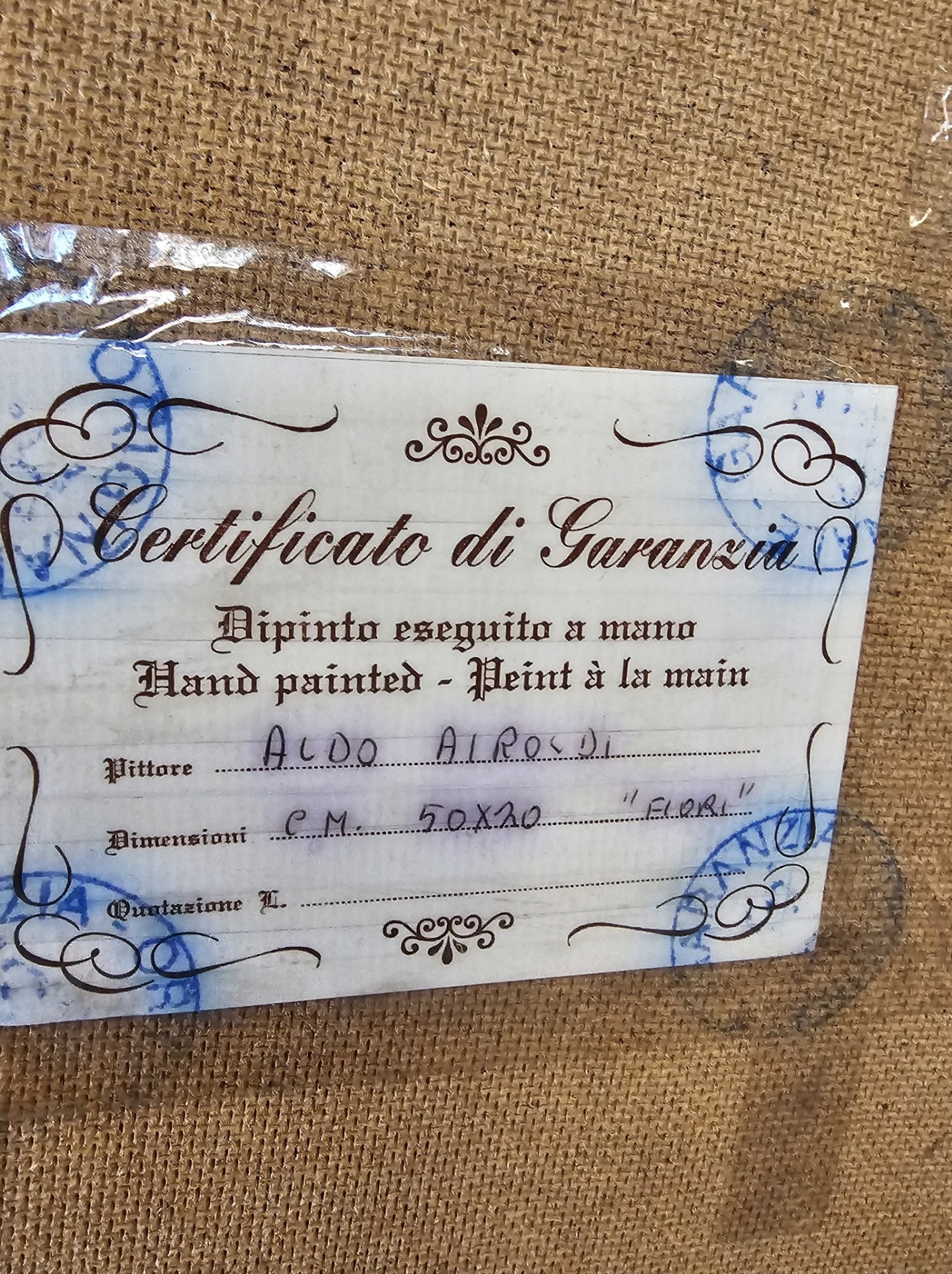 Tablou elegant, pictat manual în ulei pe lemn , semnat de artistul italian Aldo Airoldi. Lucrarea reprezintă un frumos buchet de flori viu colorate, dispuse într-o vază aurie, într-un stil clasic și rafinat.