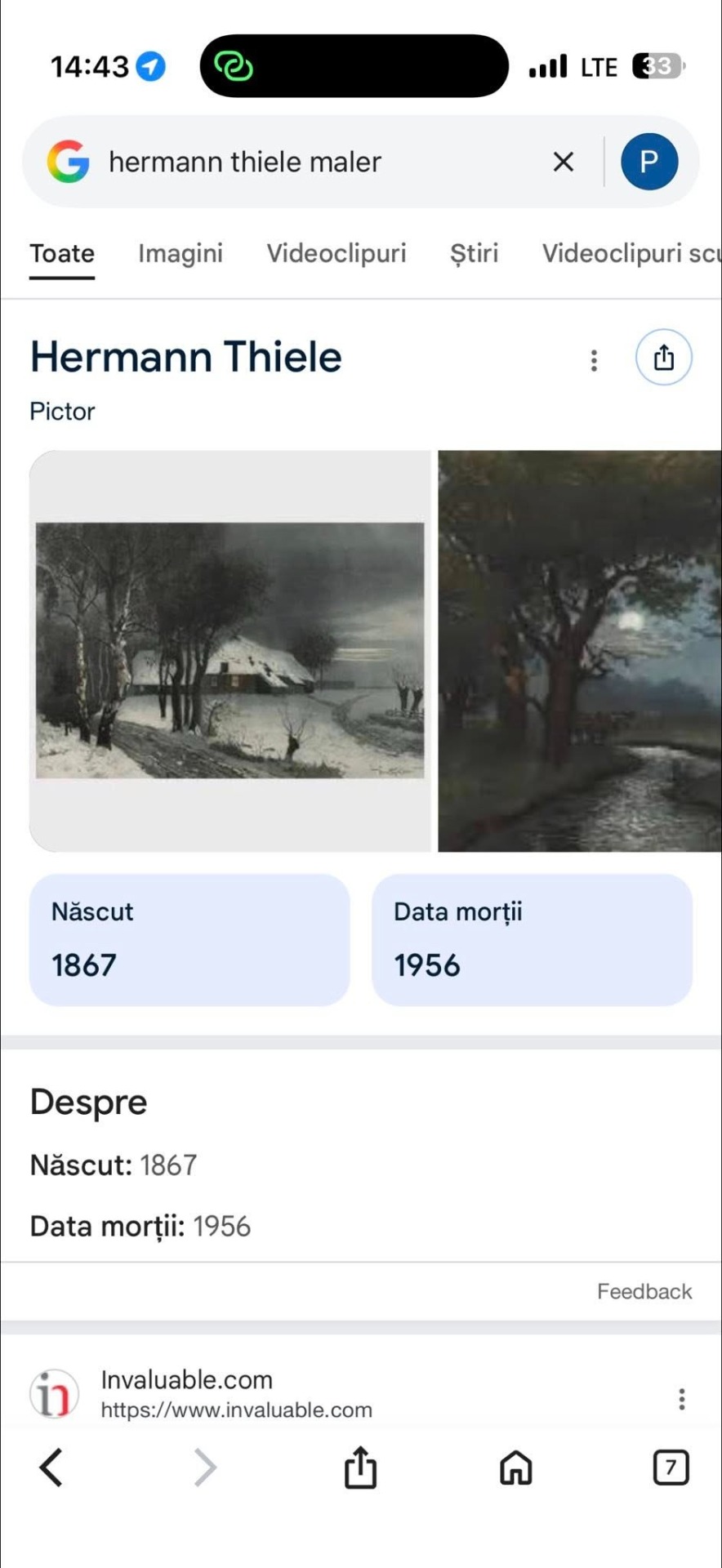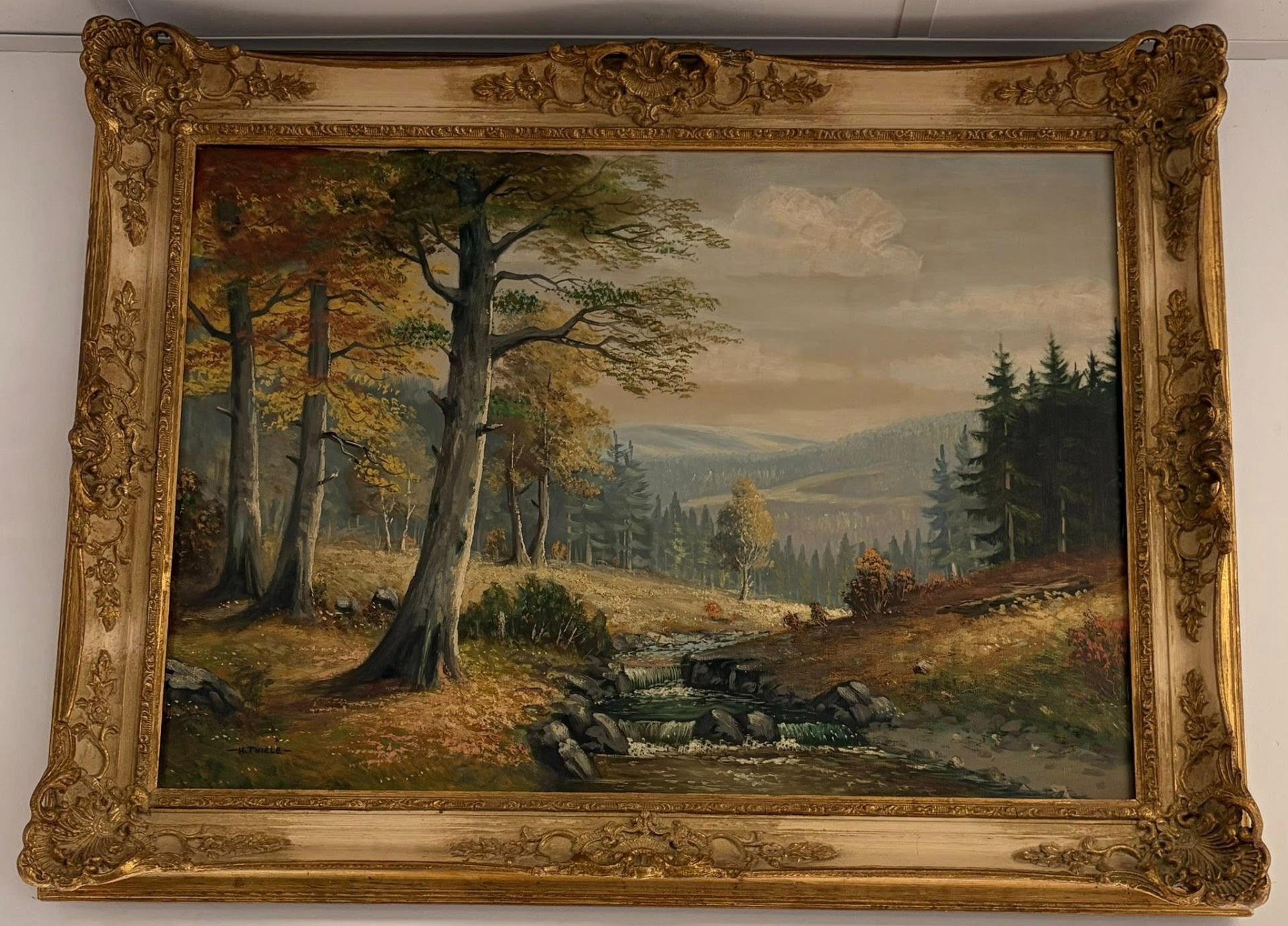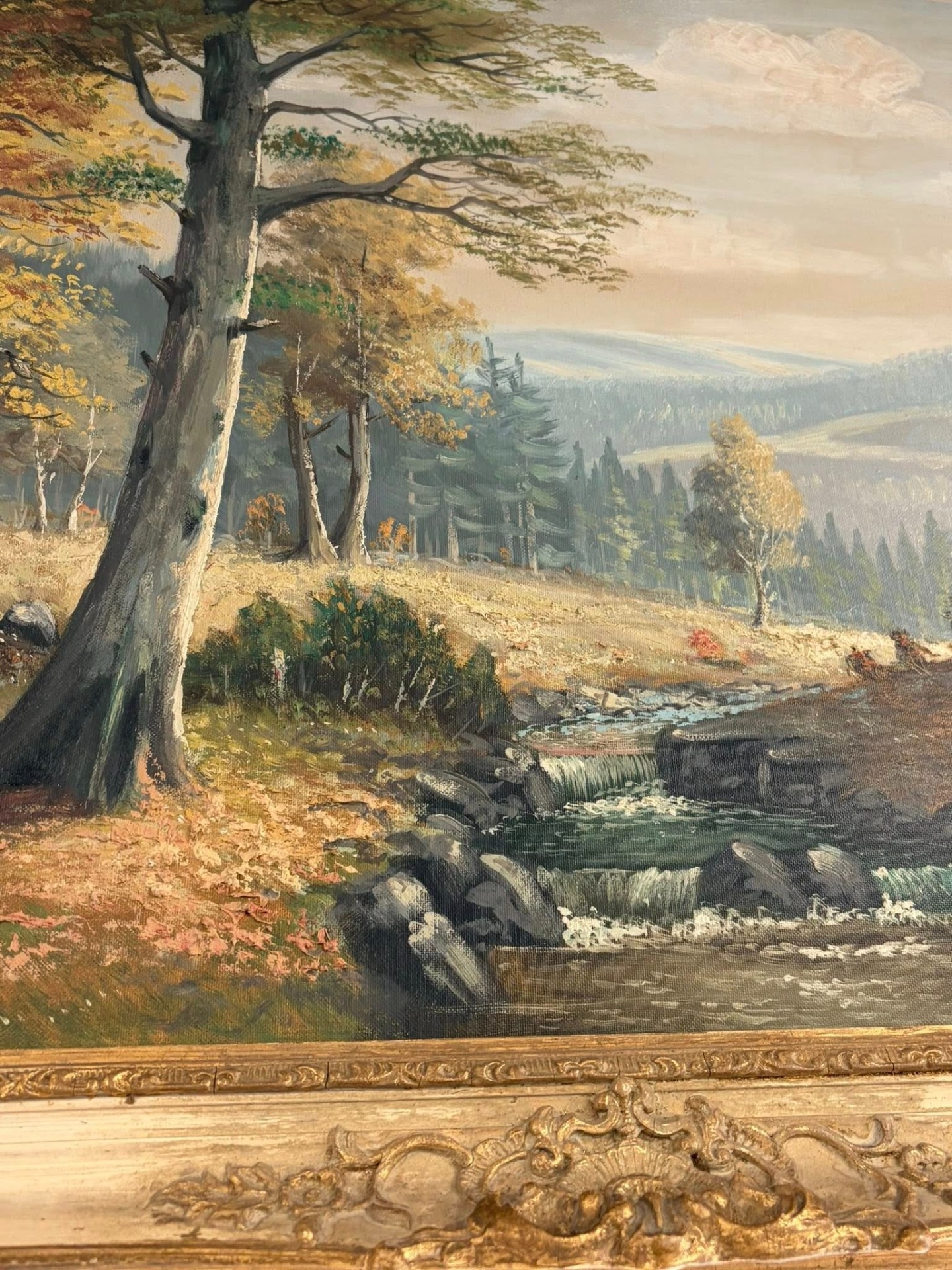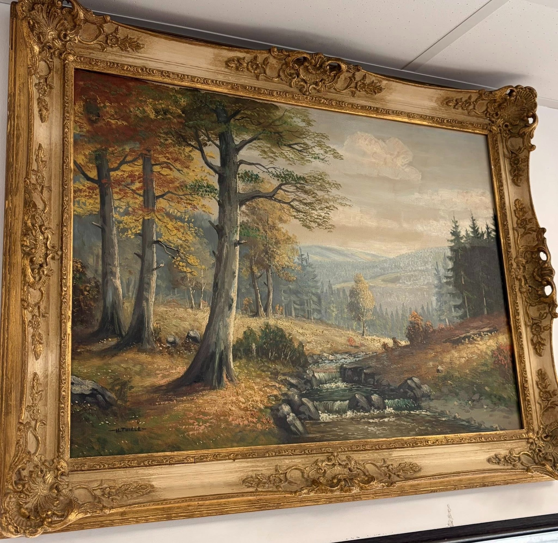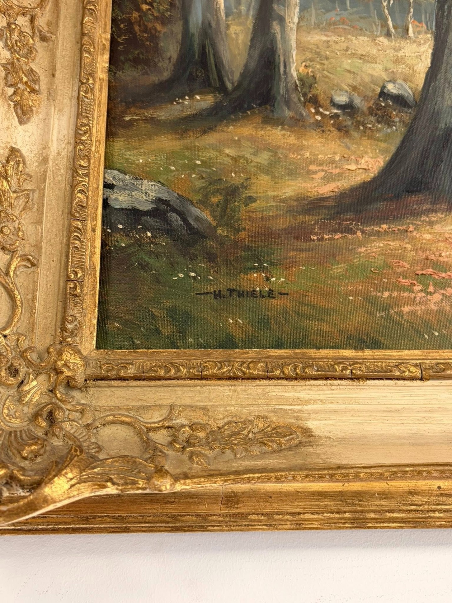 tablou semnat de artistul *H. Thiele*, realizat în perioada anilor 1940–1950, reprezentând un peisaj montan de toamnă, cu pădure, pârâu și dealuri în fundal. Lucrarea este realizată în ulei pe pânză, în stil realist, cu o cromatică caldă și detalii atent lucrate.