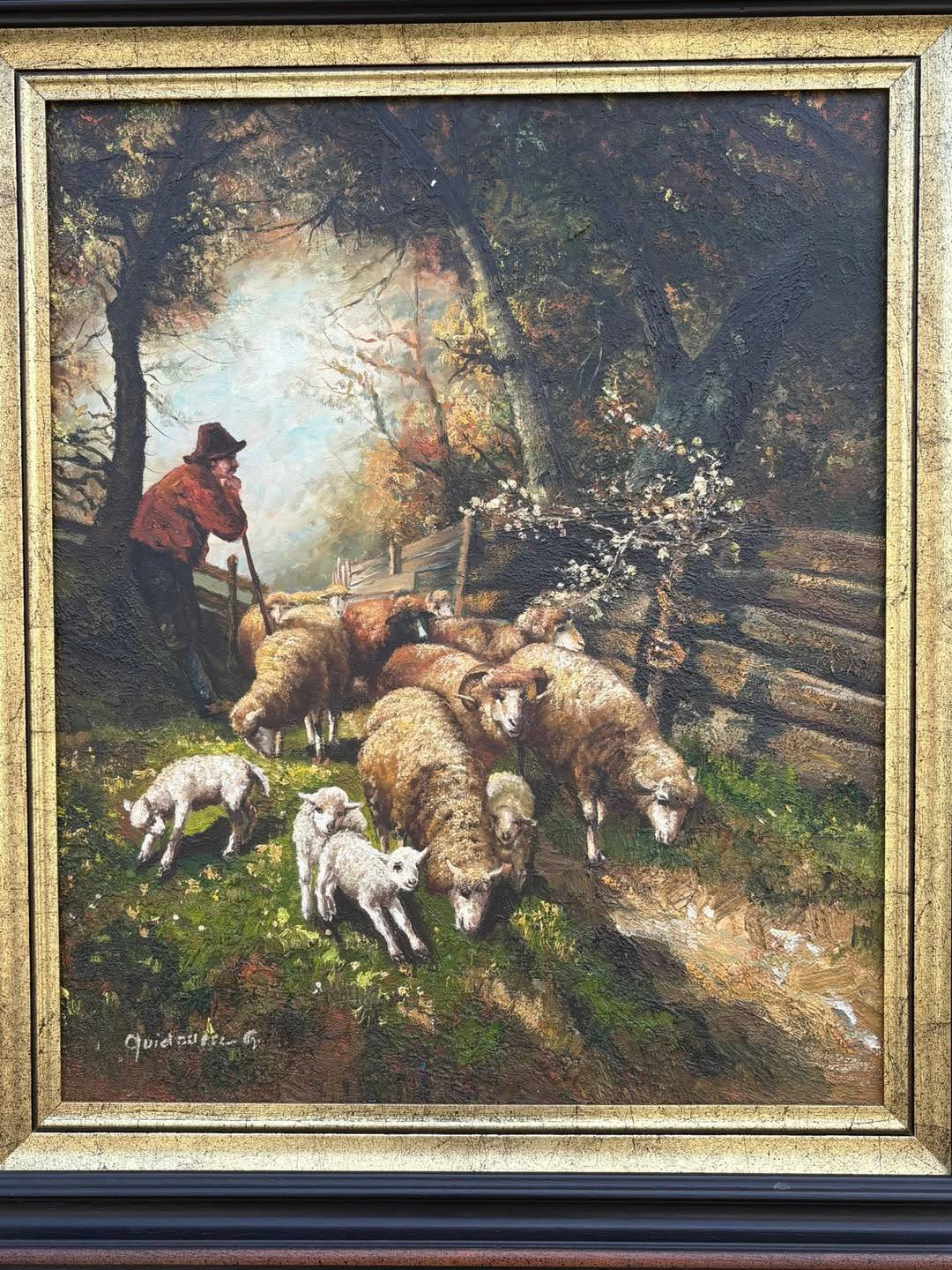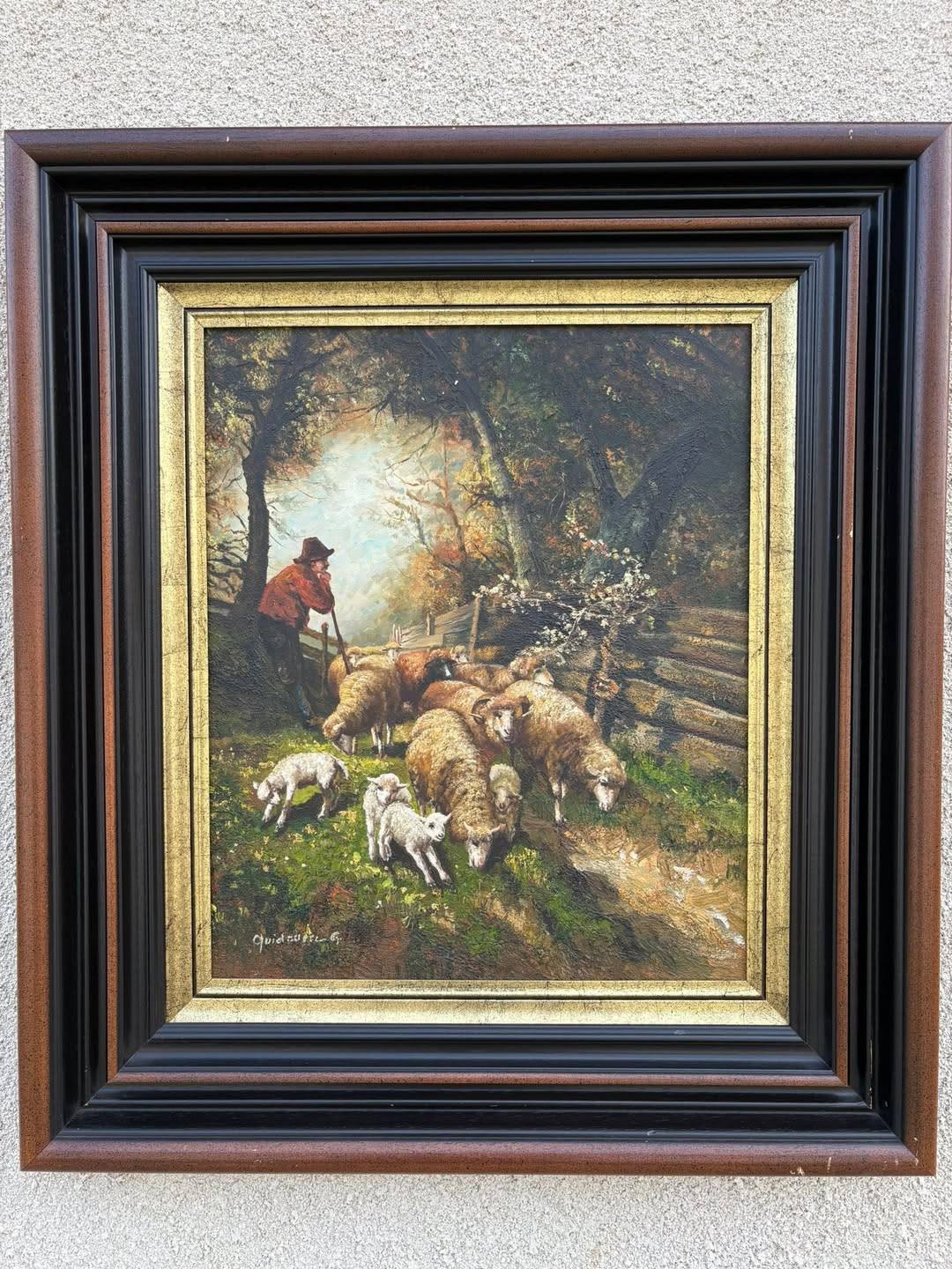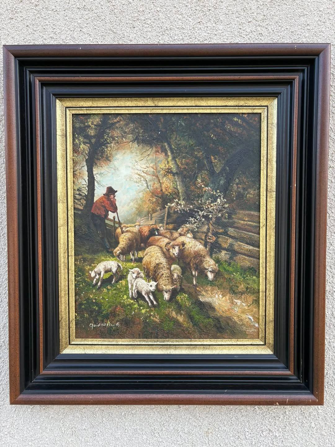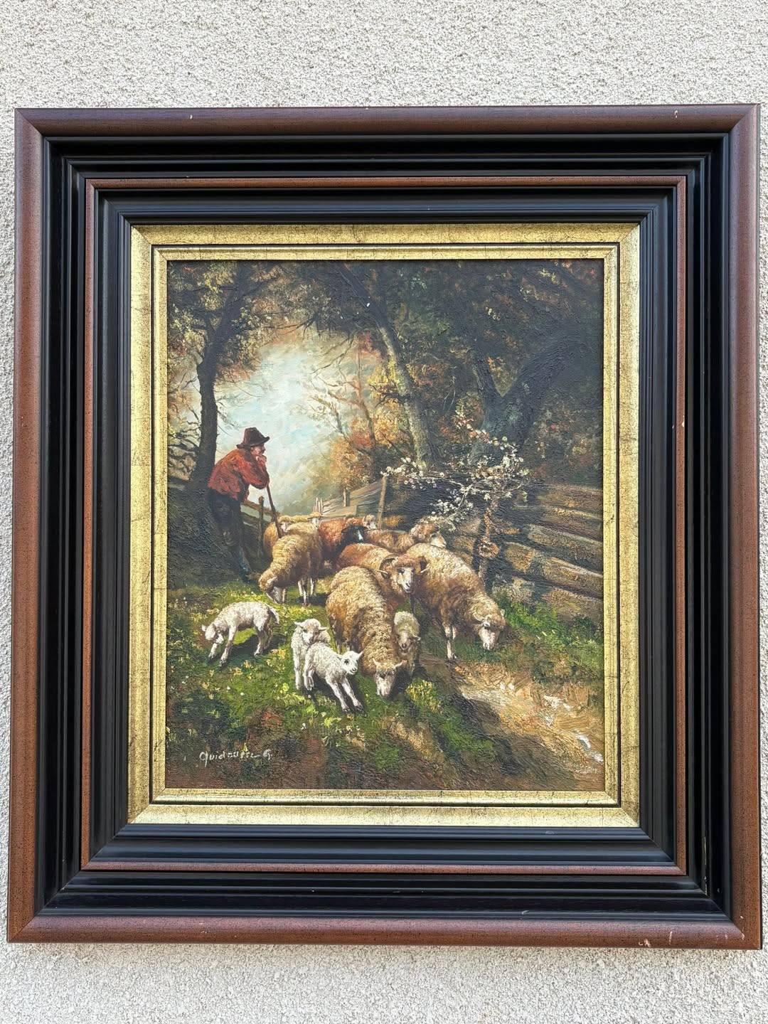 Tablou pictură pe pânză – scenă pastorală cu cioban și oi – înrămat