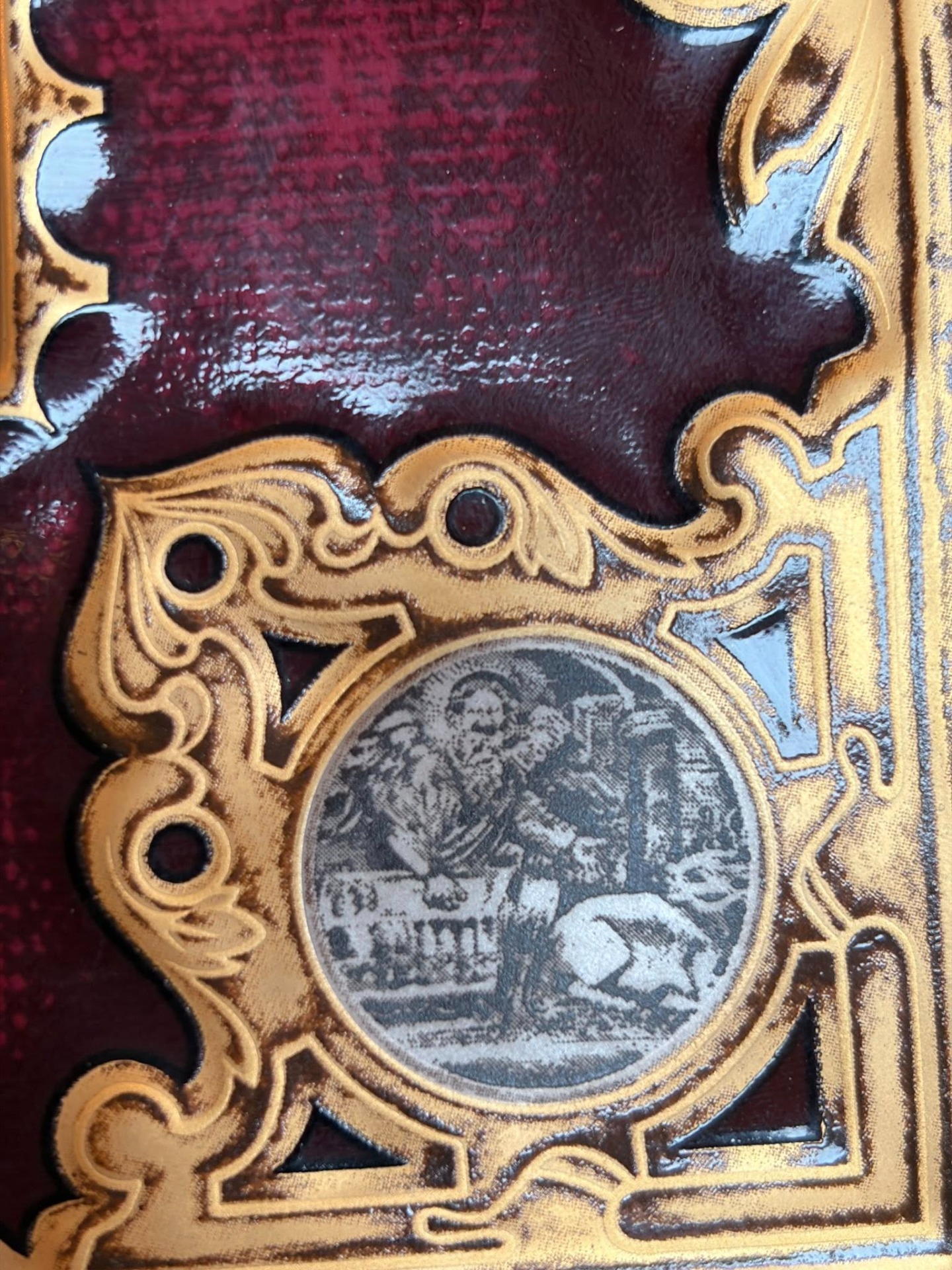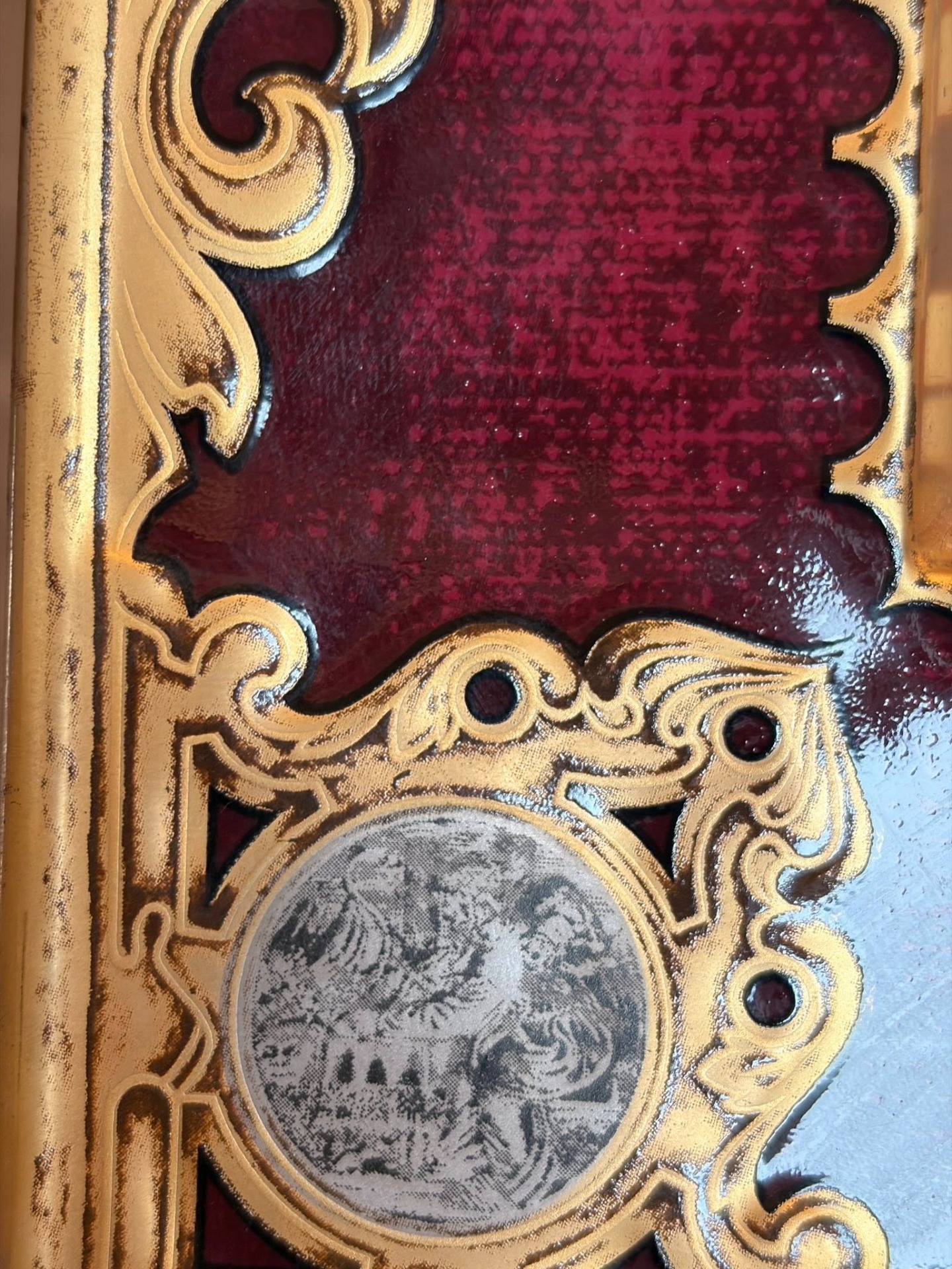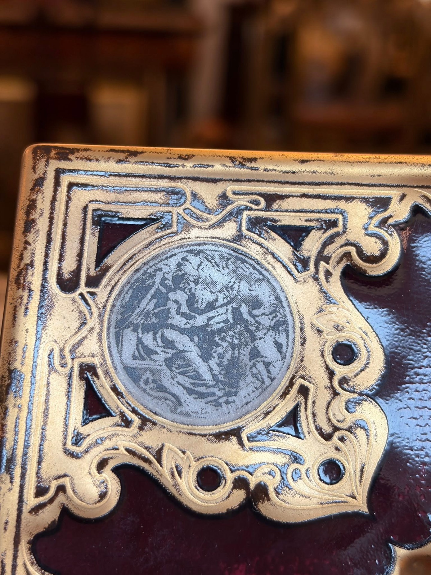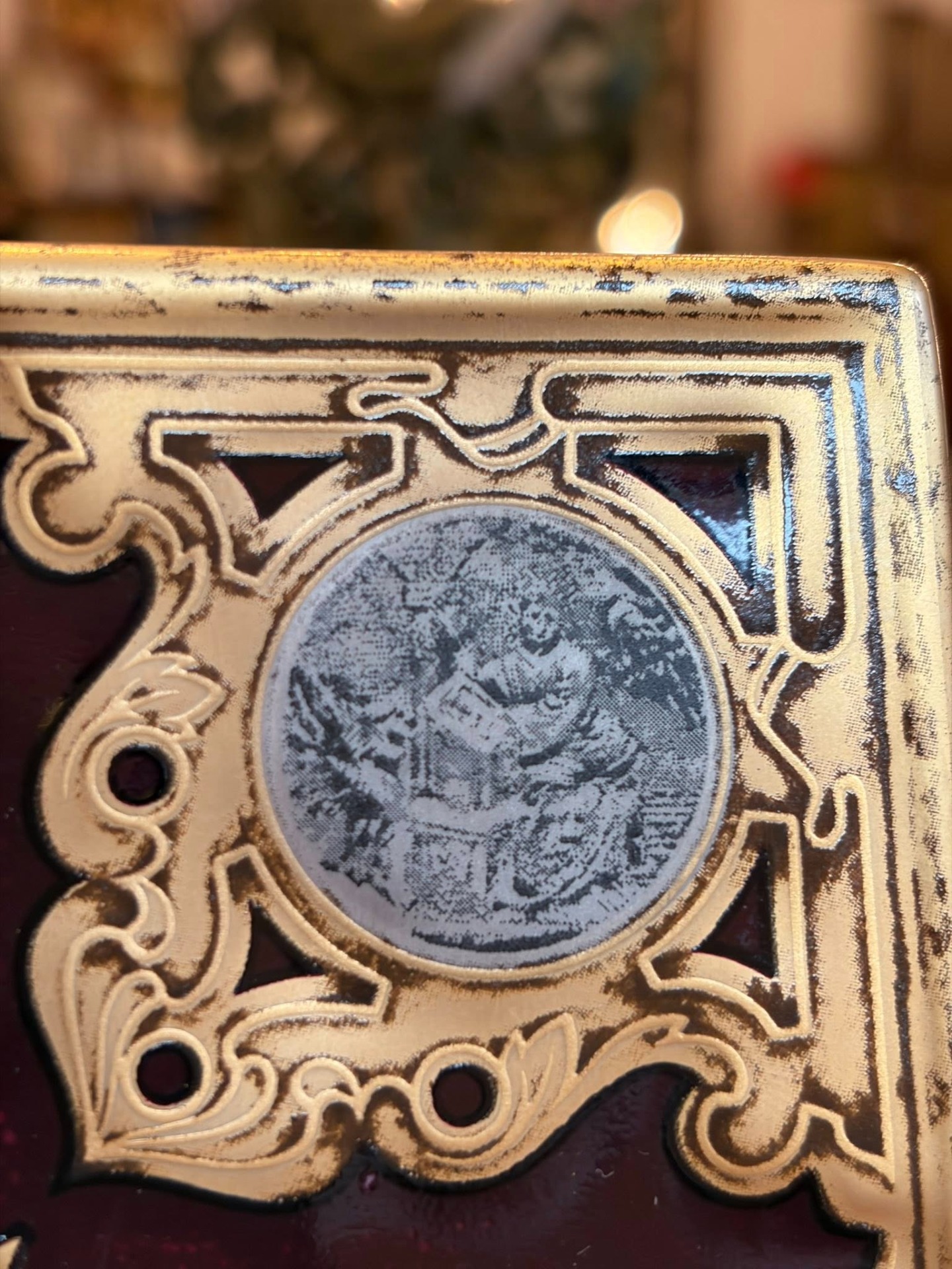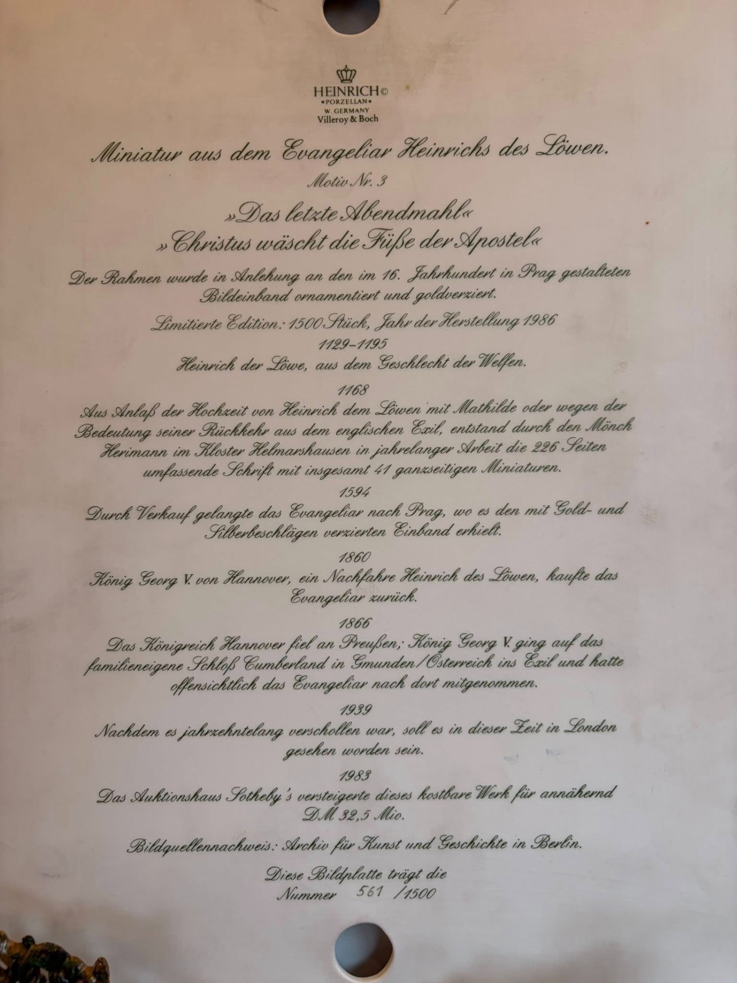 Piesă rară și deosebit de elegantă, realizată de Heinrich Porzellan – Villeroy & Boch, Germania, parte dintr-o colecție dedicată Evangheliarului lui Heinrich der Löwe (Heinrich Leul), unul dintre cele mai valoroase manuscrise medievale.