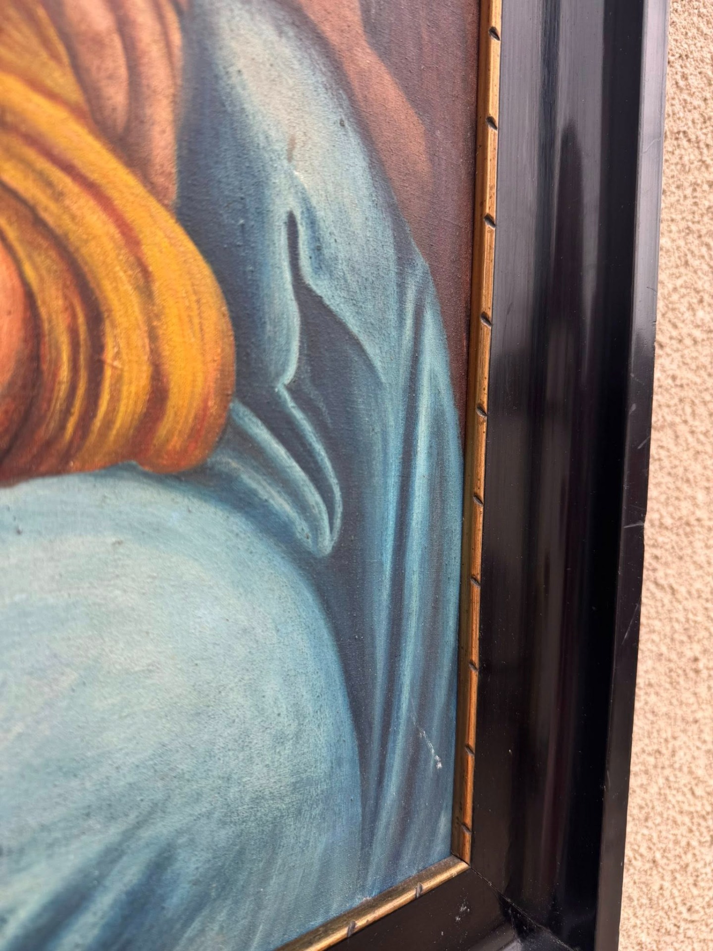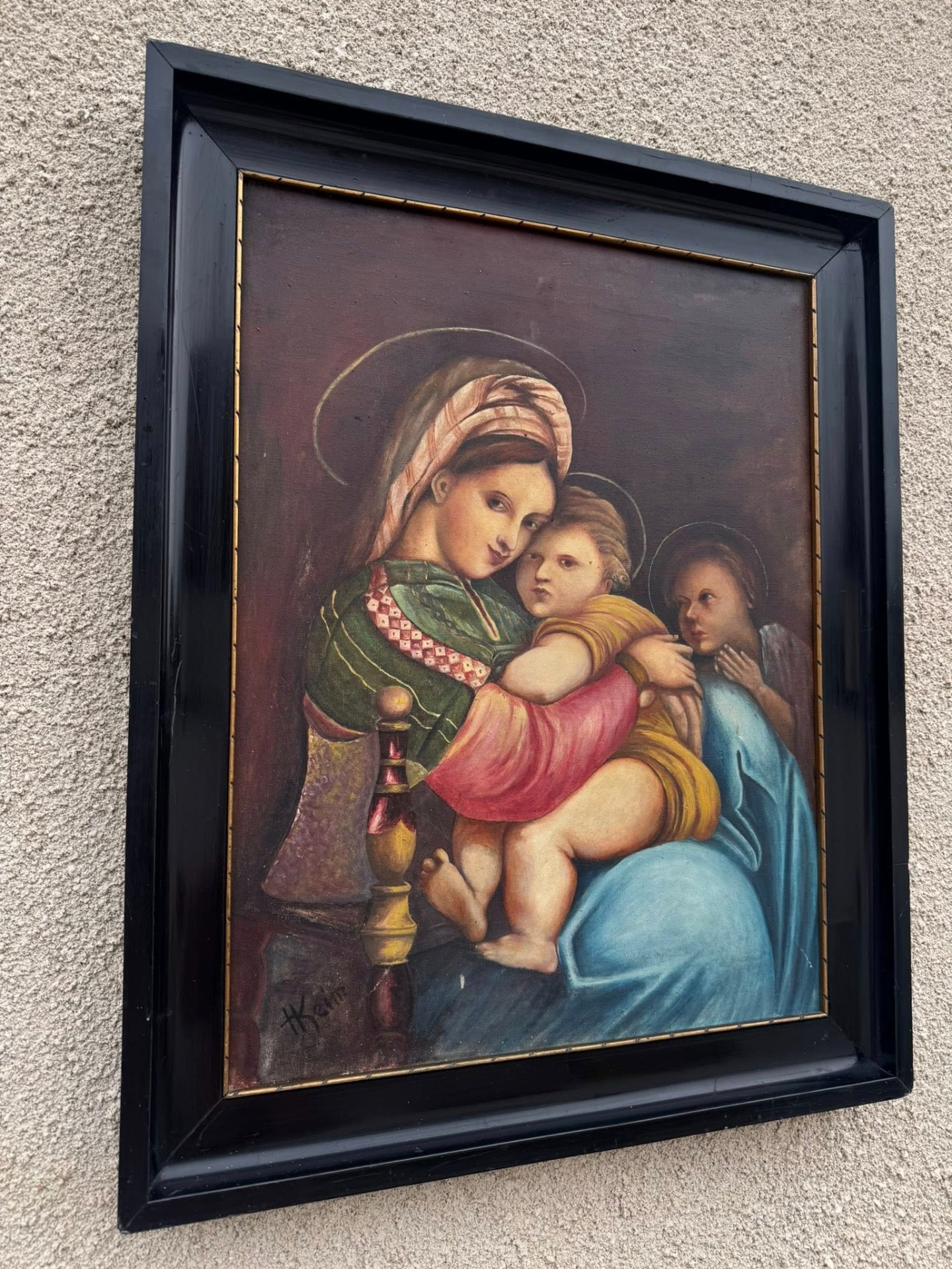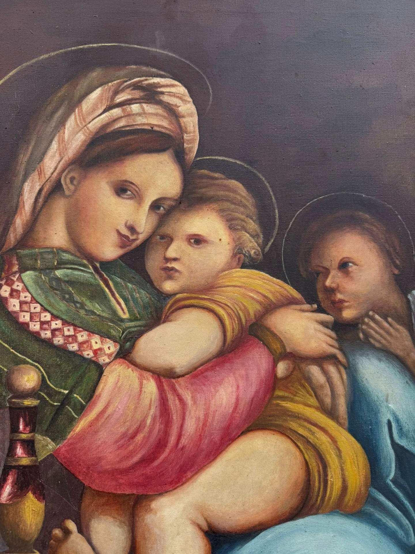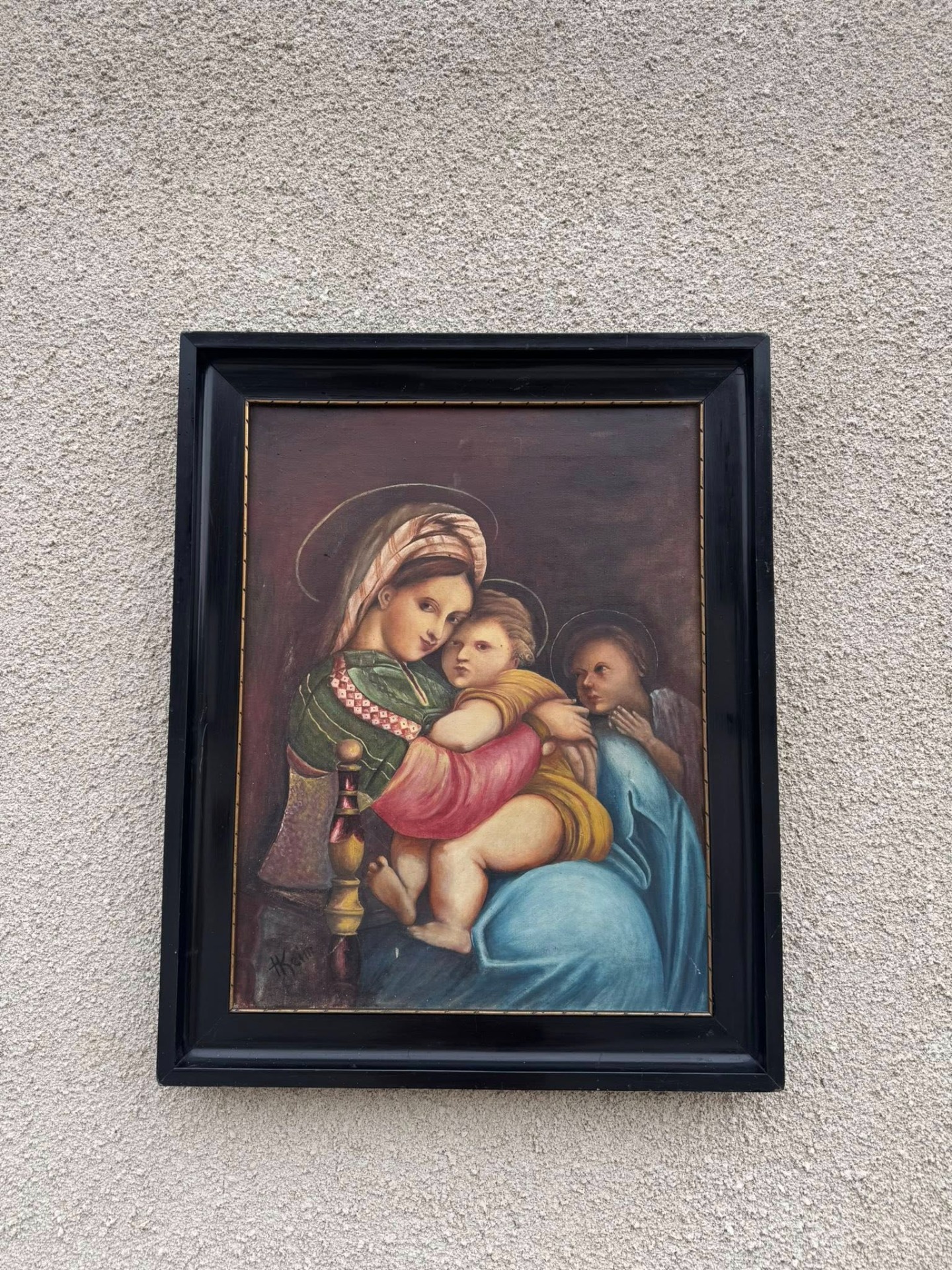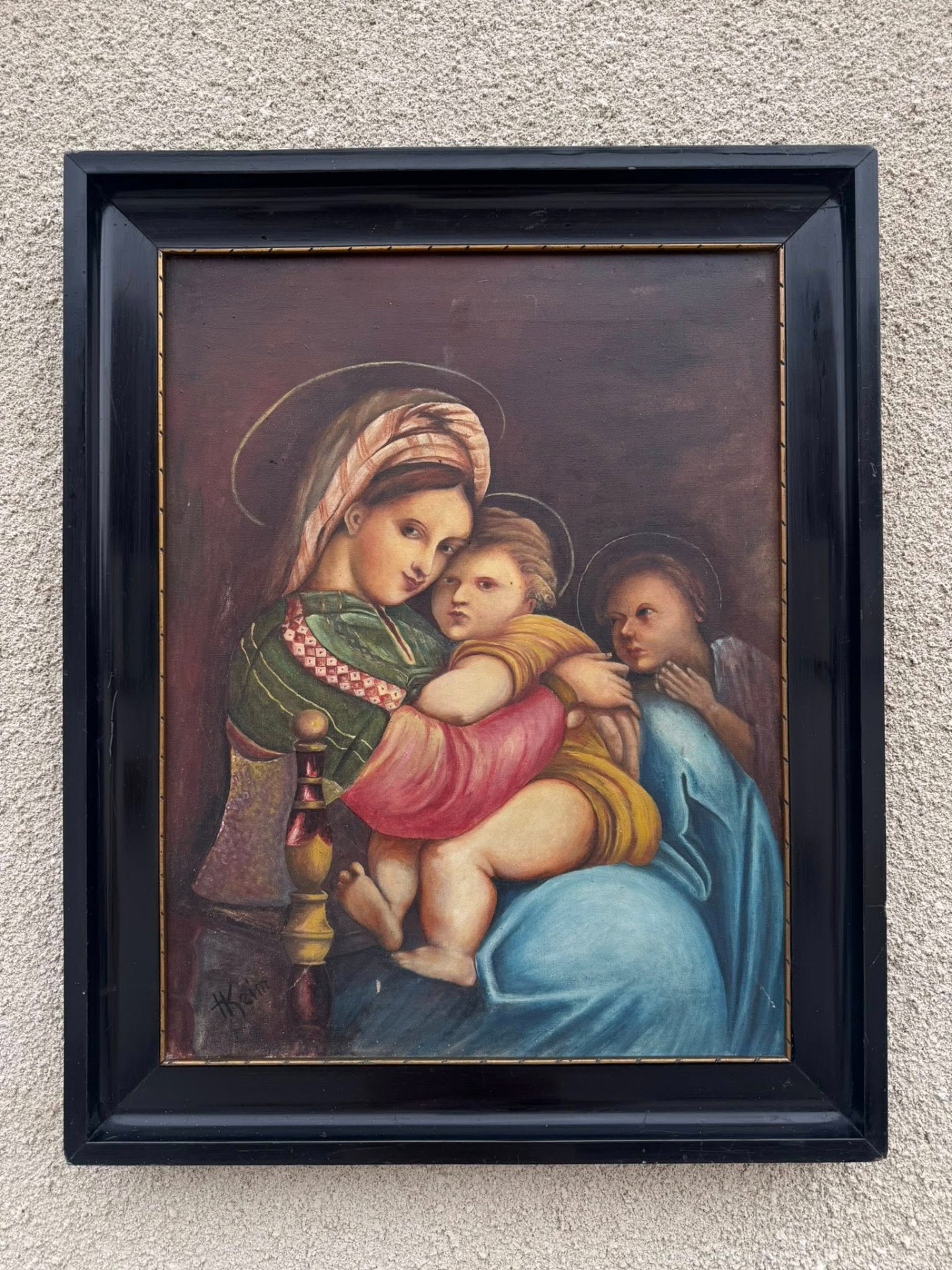 Reprezinta pe Fecioara Maria , care îl ține în brațe pe Pruncul Iisus, alături de o a treia figură care pare a fi un înger sau Sfântul Ioan Botezătorul copil. Toate personajele poartă aureole, sugerând sfințenia.