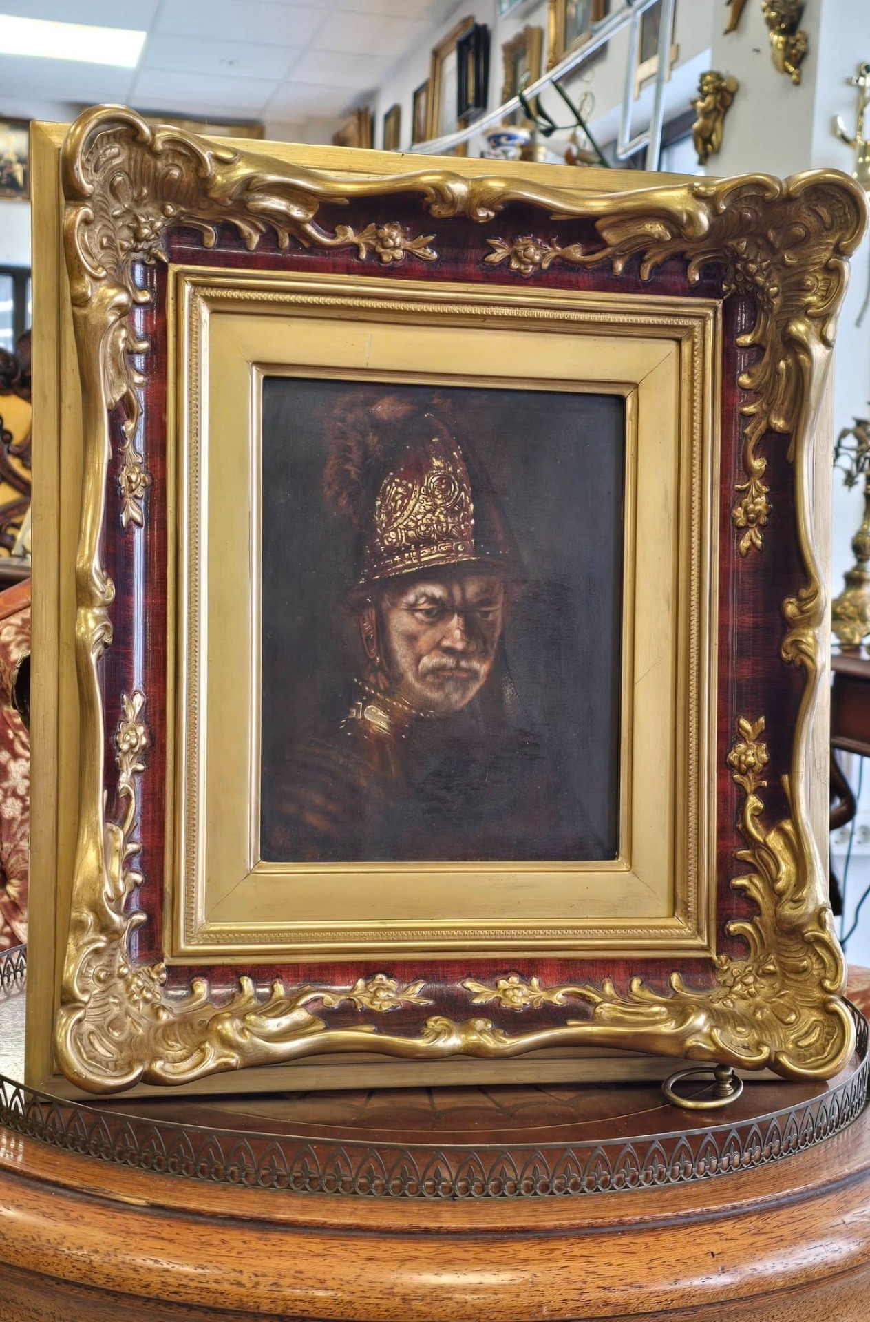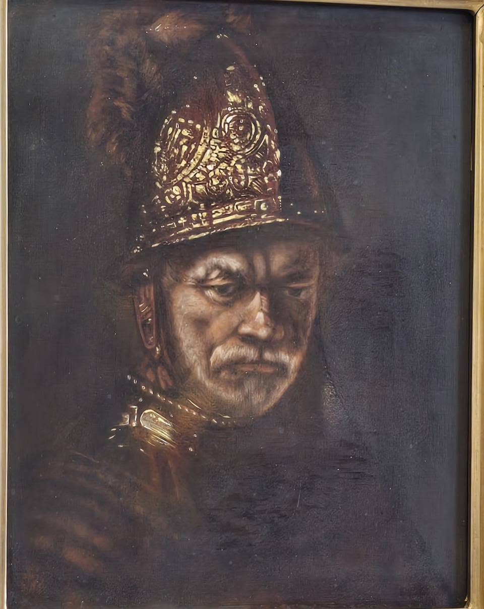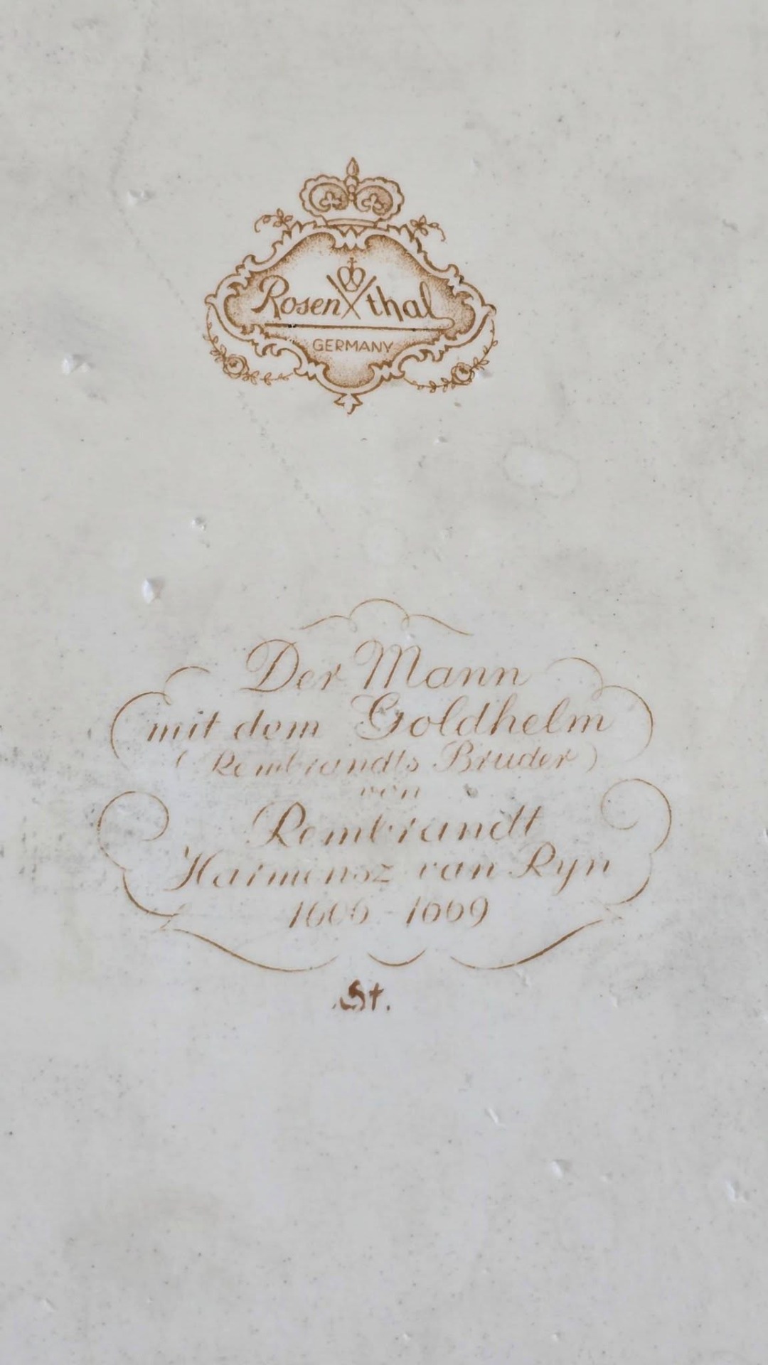 Tablou ROSENTHAL de colecție, realizat pe porțelan, reproducere după celebra lucrare "Omul cu coiful de aur" atribuită lui Rembrandt, cu ramă superbă, masivă,