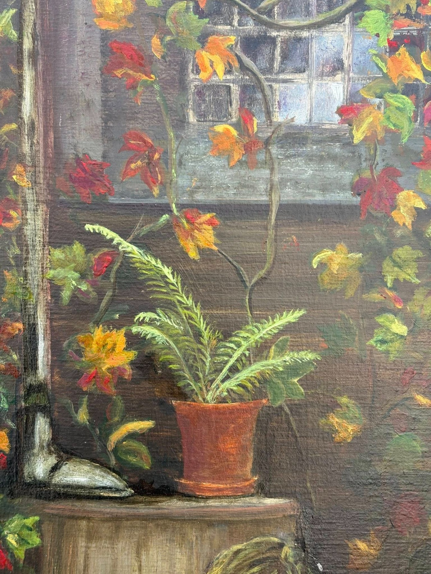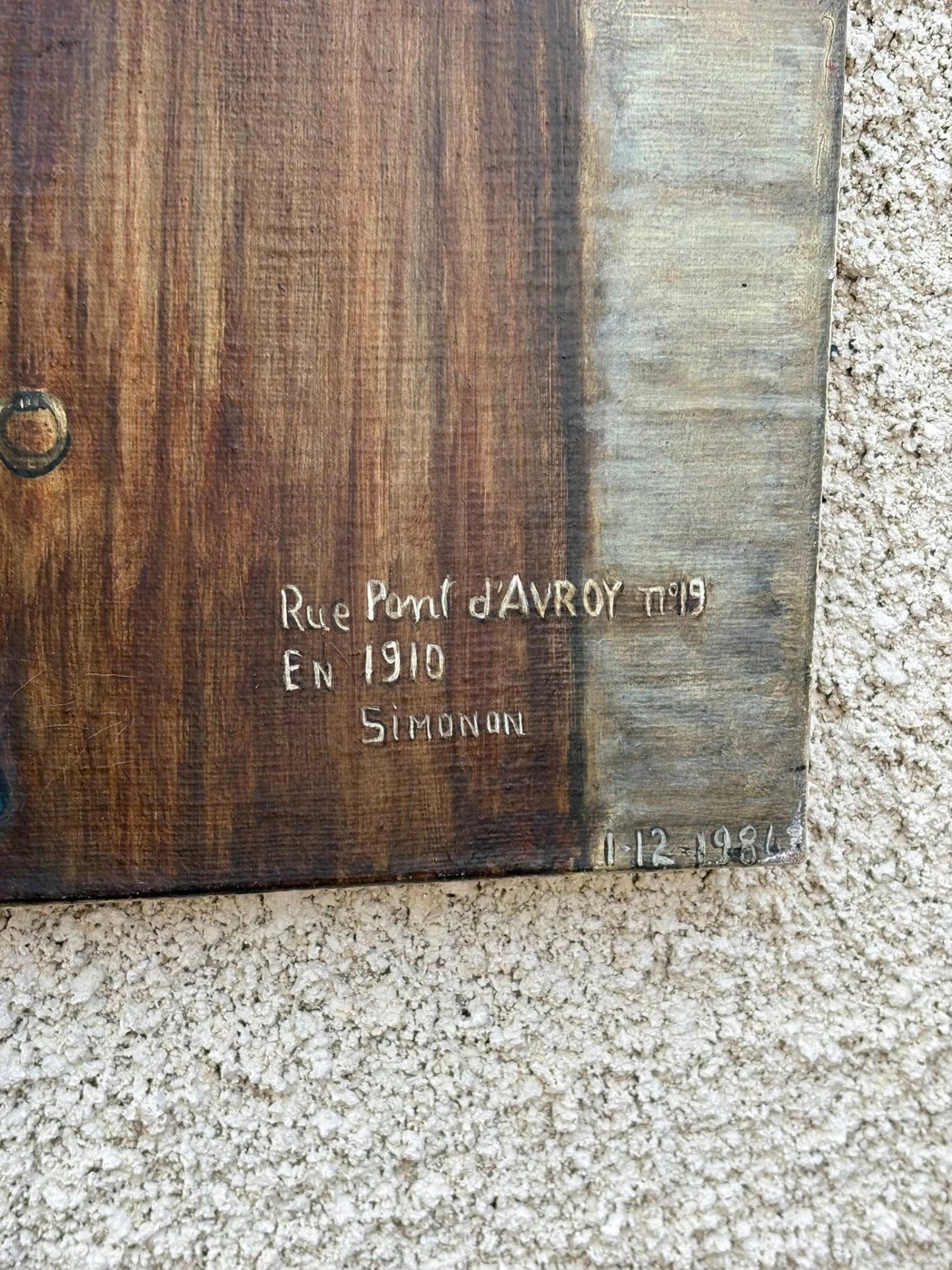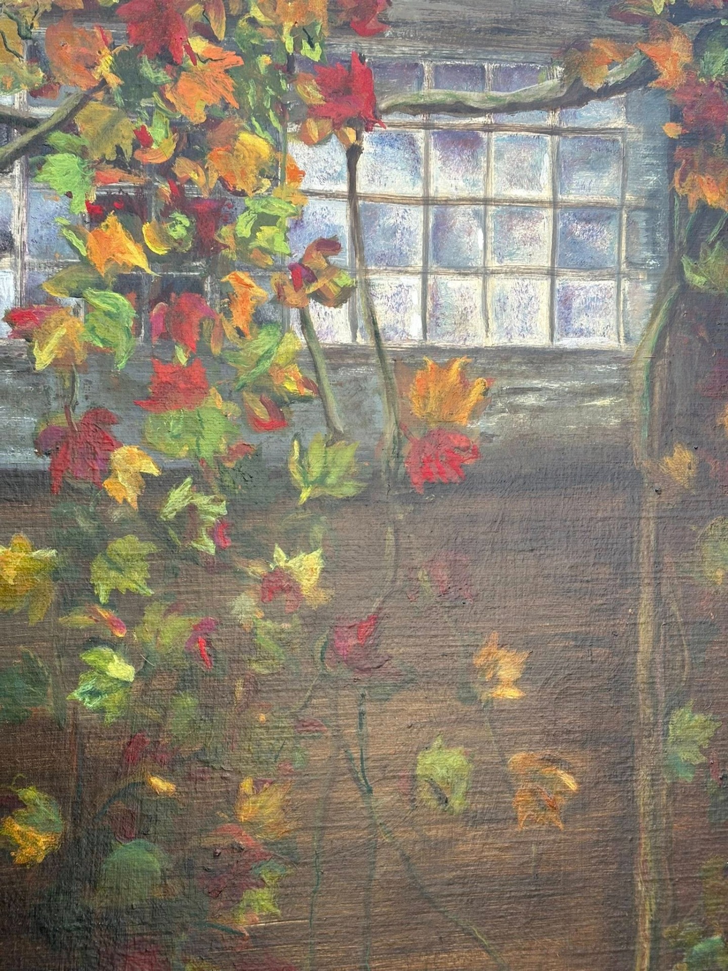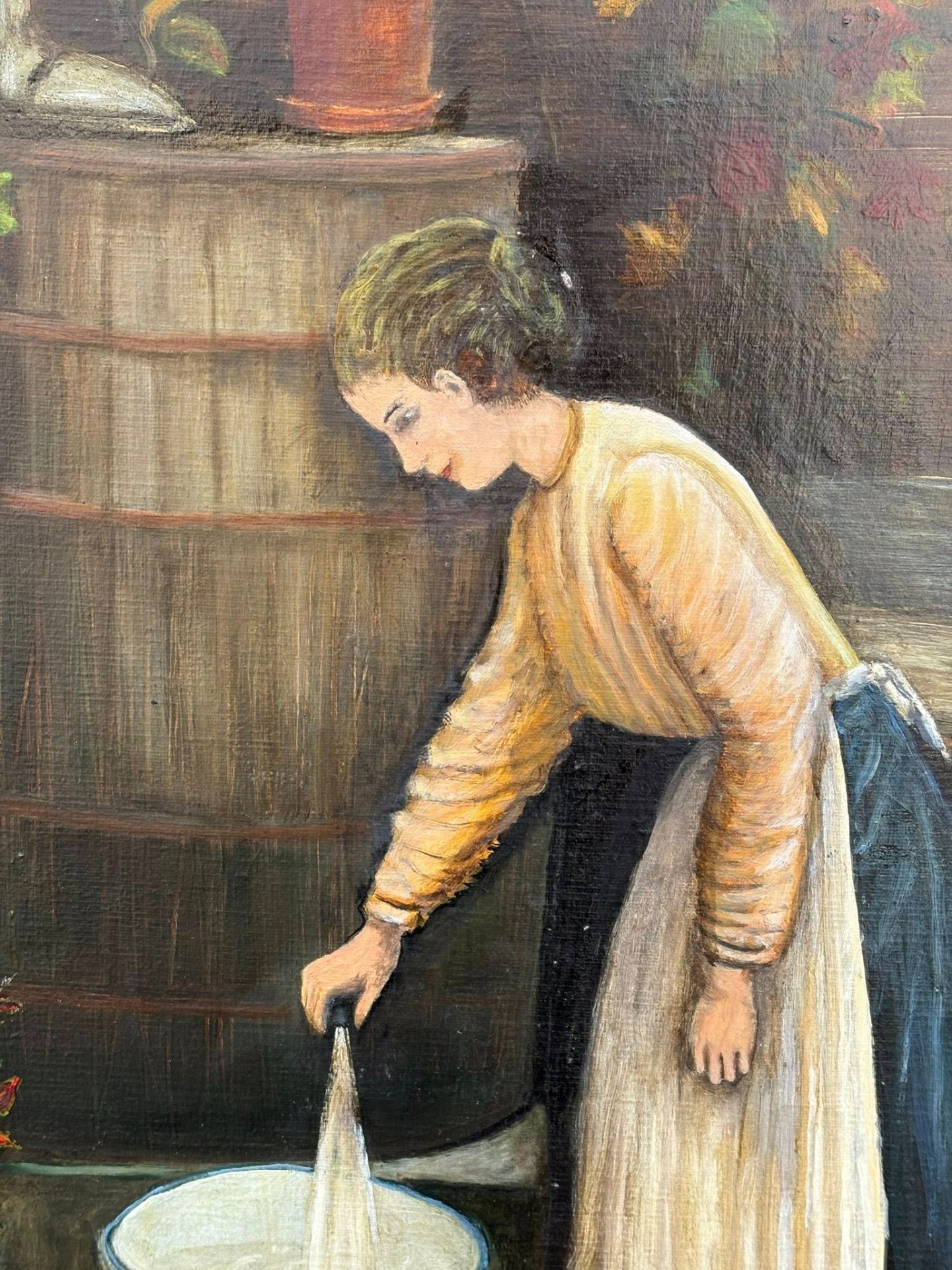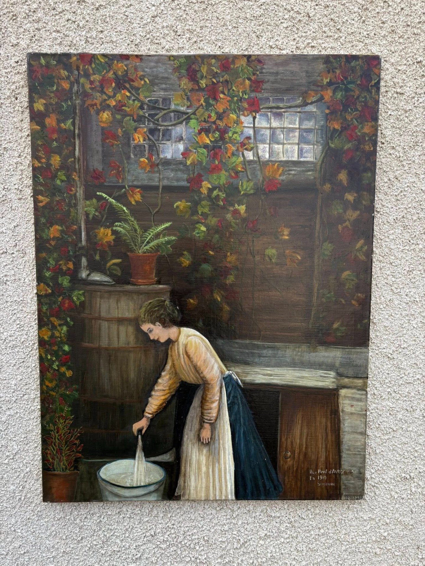 Tablou semnat Simonon, ilustrând o scenă rustică: o tânără spală rufe lângă un butoi, într-o curte acoperită de viță-de-vie în culori de toamnă, cu o fereastră