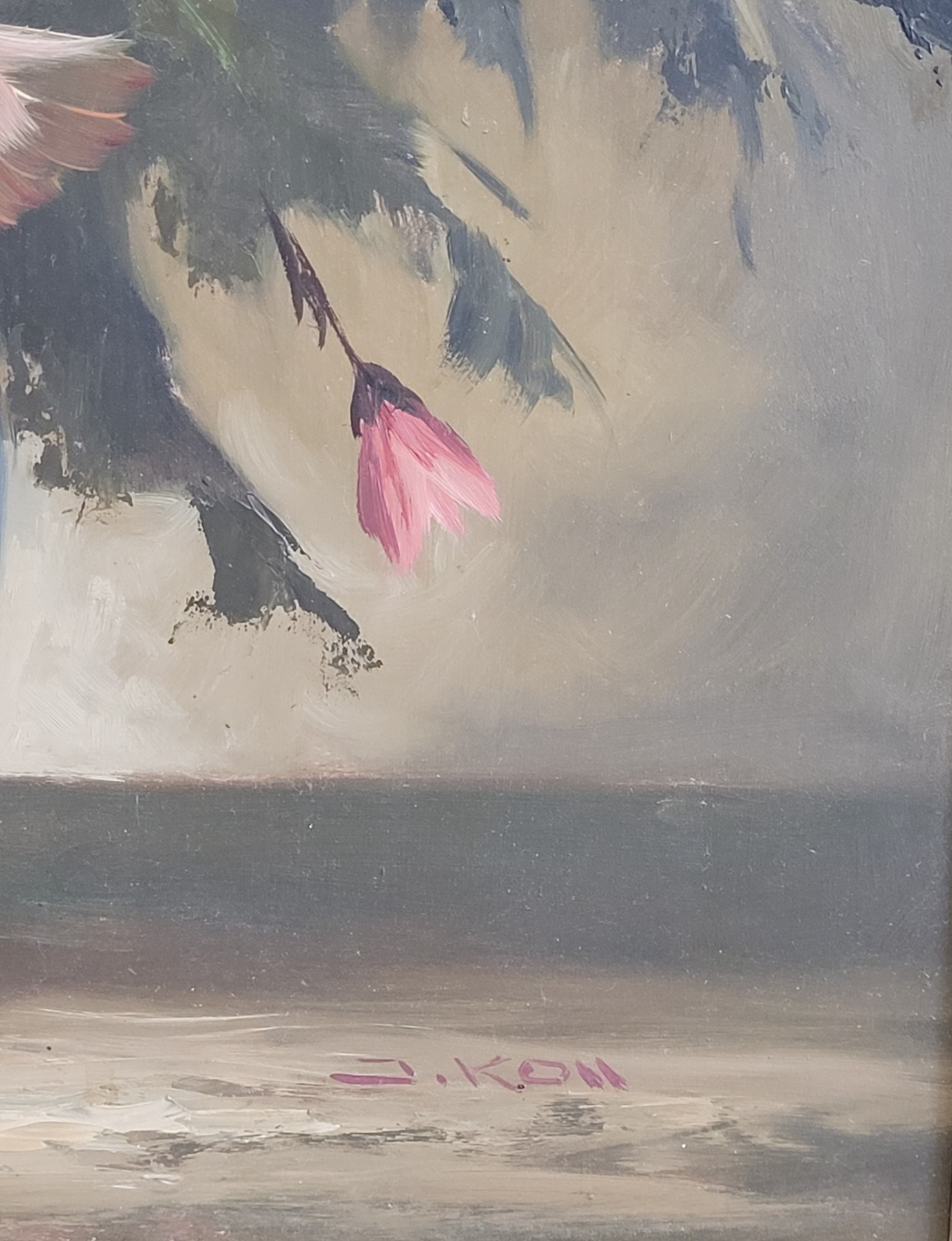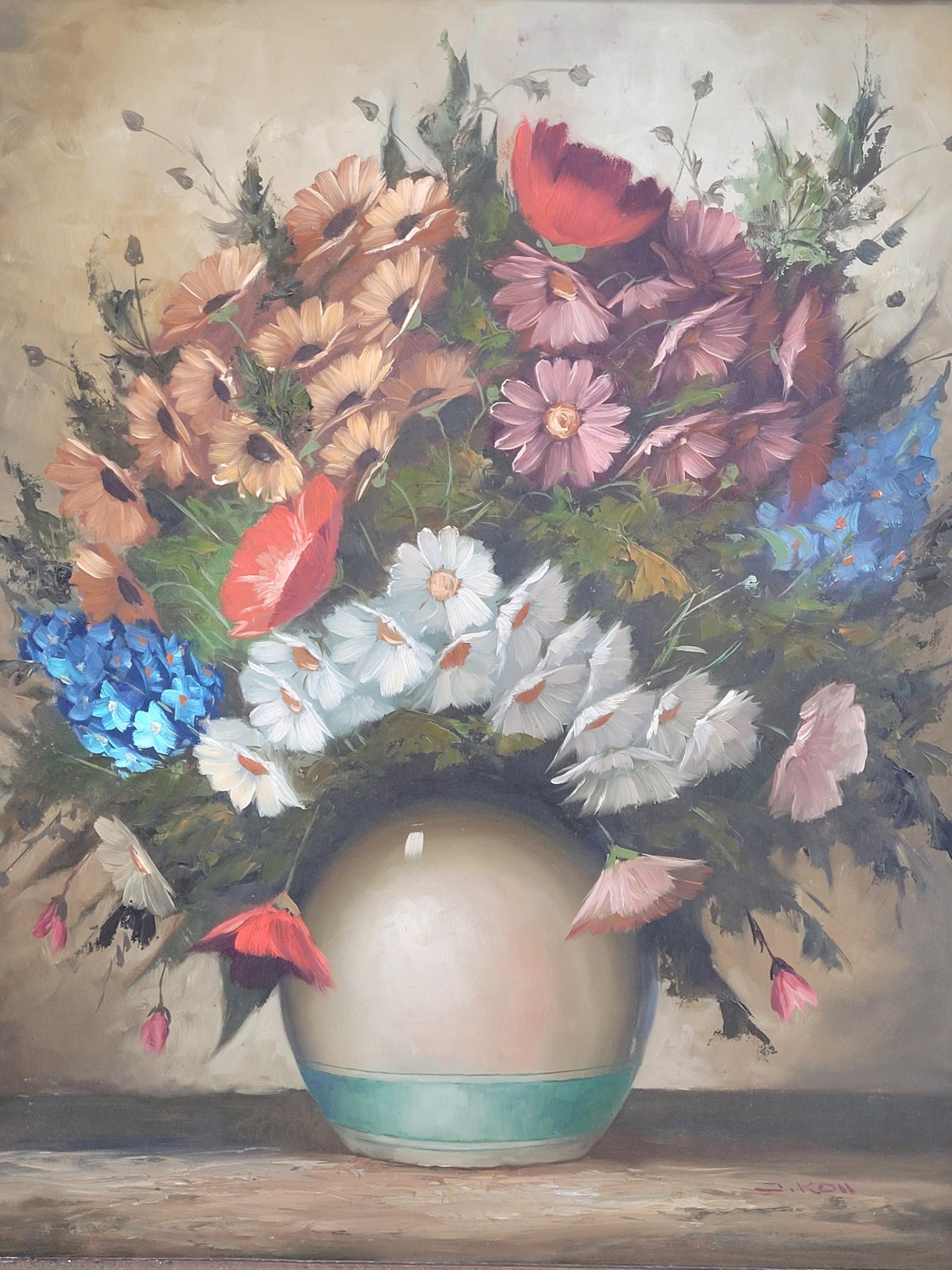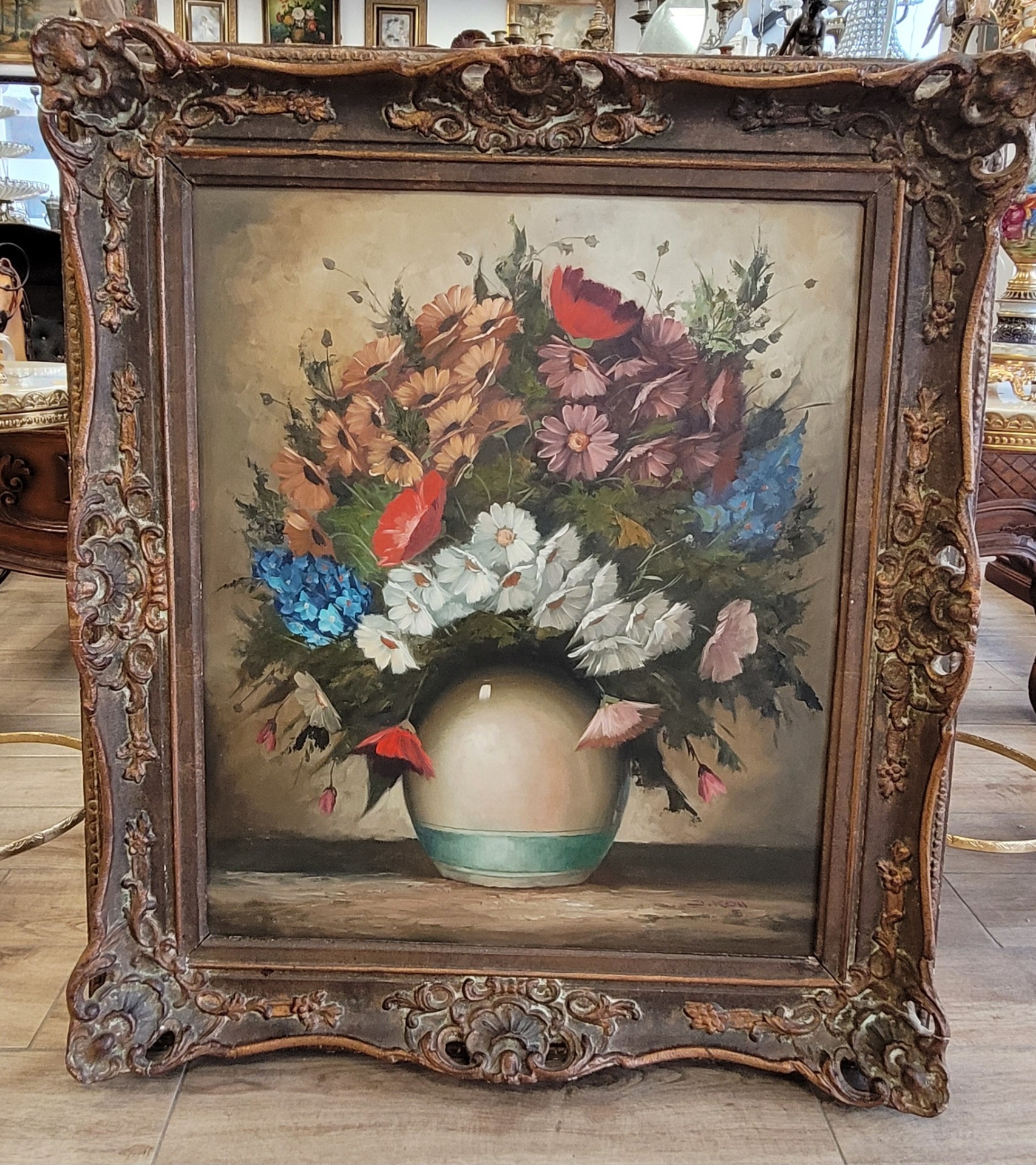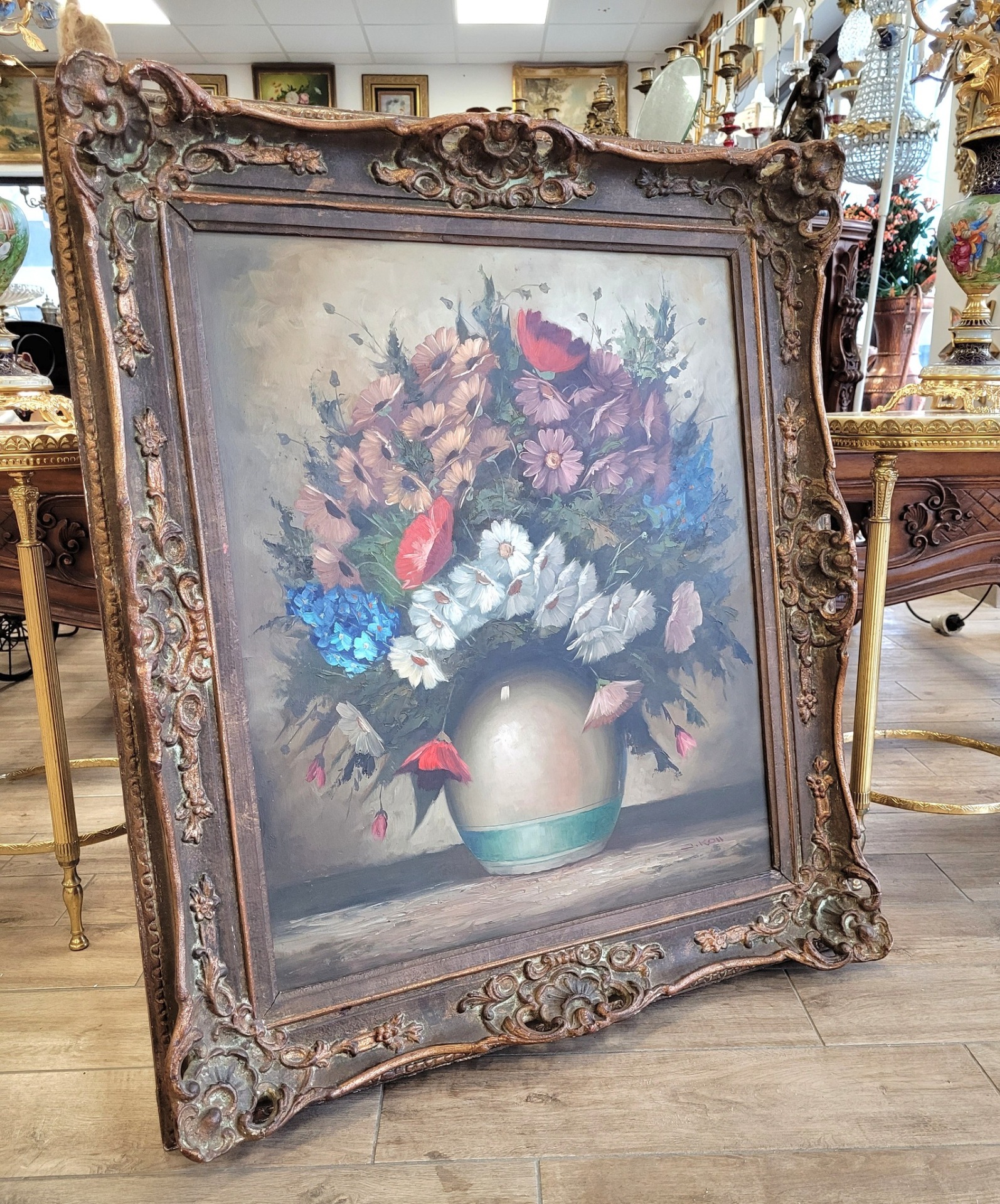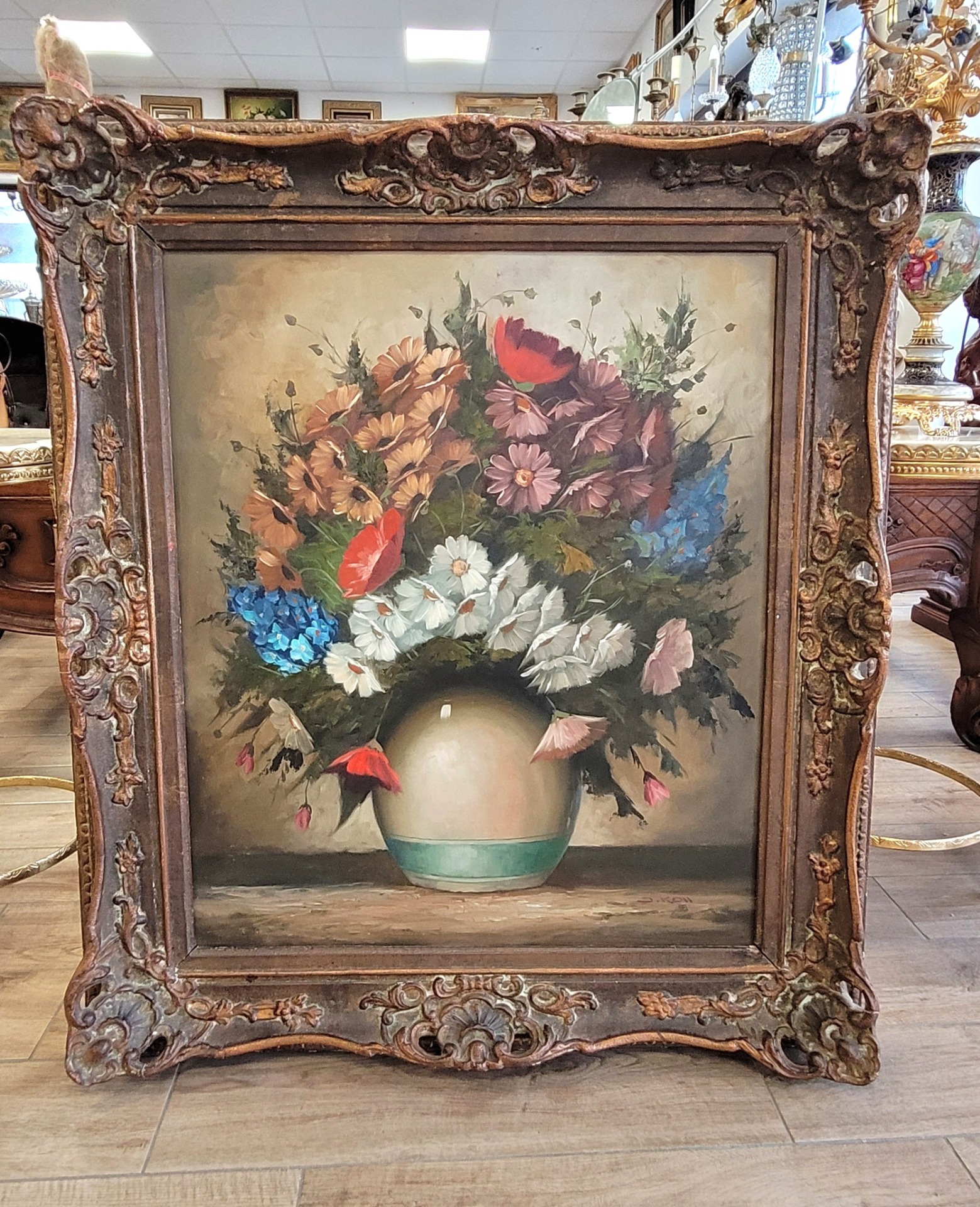 Tablou - ulei pe pânză, buchet floral vibrant, cu ramă în stil baroc, semnat.
