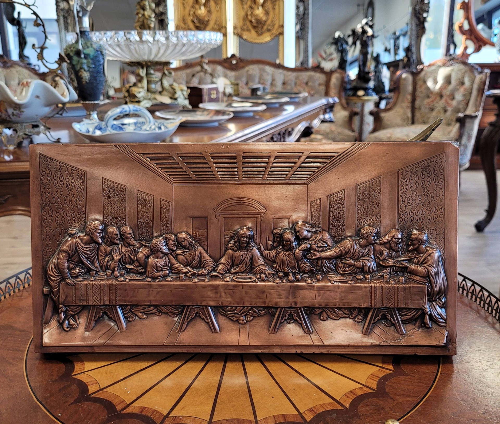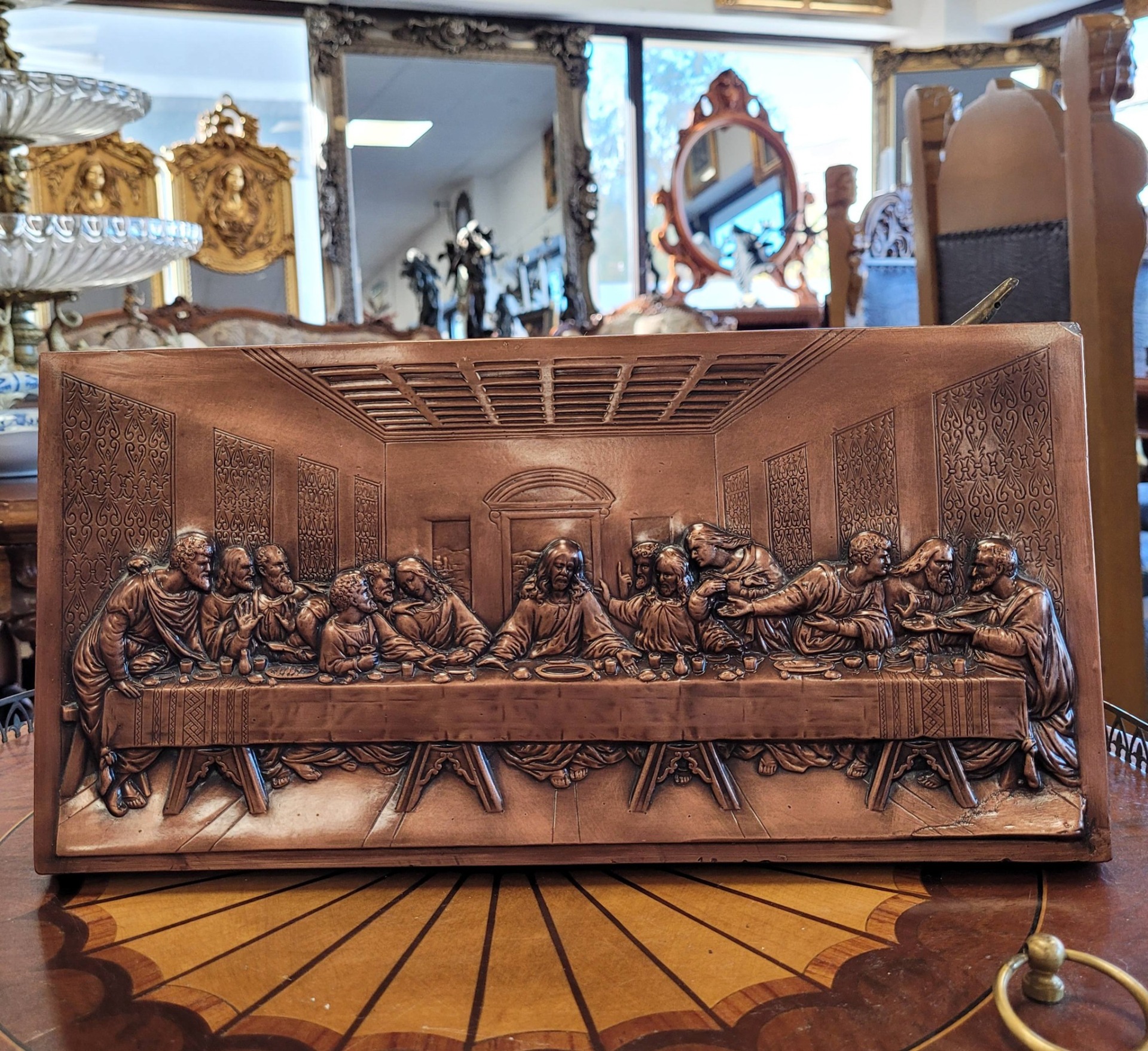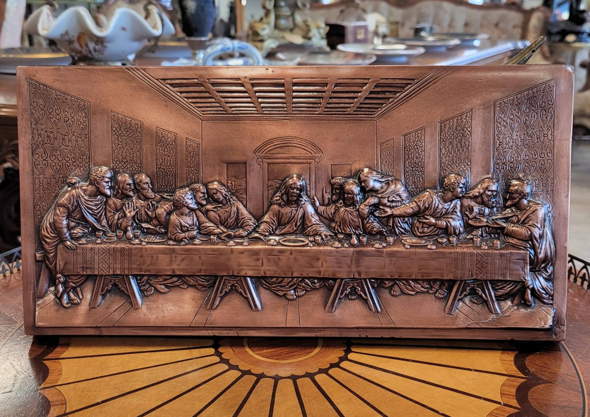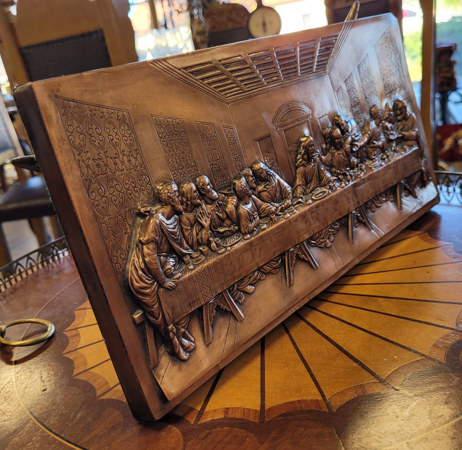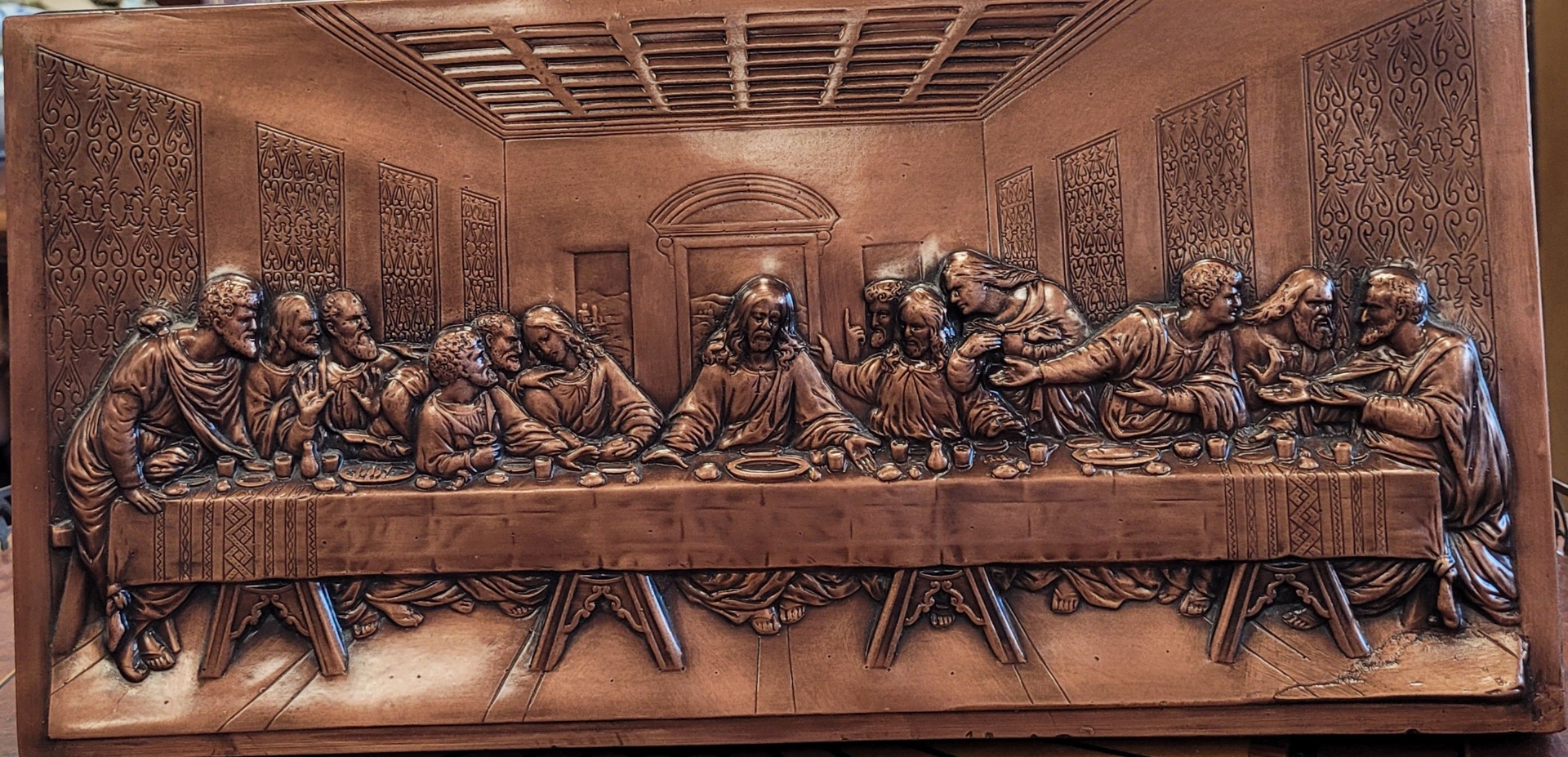 Tablou vechi "Cina cea de Taină", basorelief în cupru, frumos realizat prin tehnica "repoussé" (metaloplastie).