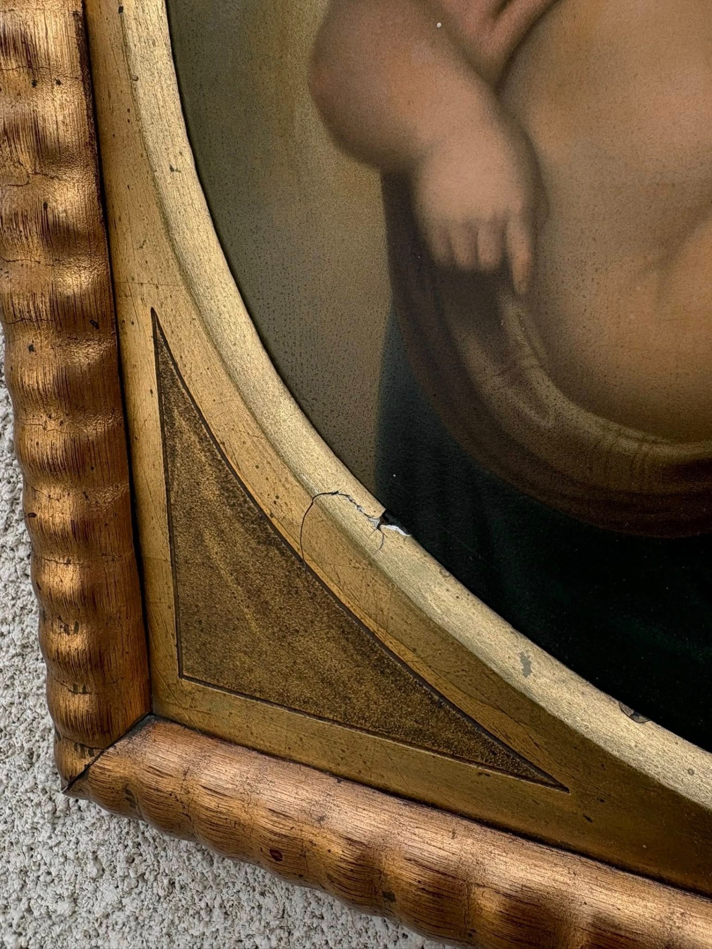 • Ramă: Ramă originală din lemn aurit, cu profil canelat (model „valuri”) și colțuri decorate geometric.